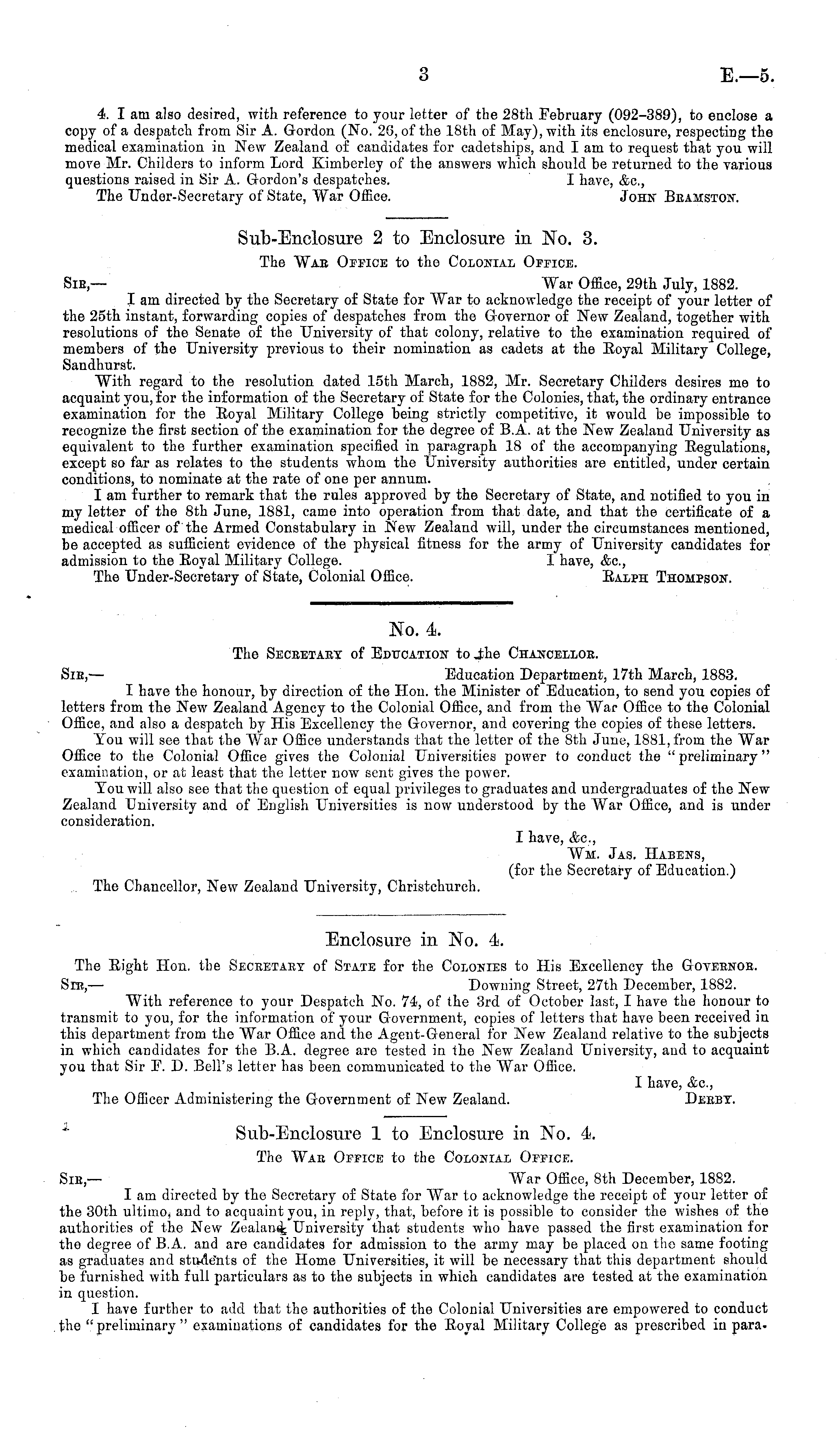 Enclosure in No. 4. The Eight Hon. the Secretary of State for the Colonies to His Excellency the Goveenoe. Sib,— Downing Street, 27th December, 1882. With reference to your Despatch No. 74, of the 3rd of October last, I have the honour to transmit to you, for the information of your Government, copies of letters that have been received in this department from the War Office and the Agent-General for New Zealand relative to the subjects in which candidates for the B.A. degree are tested in the New Zealand University, and to acquaint you that Sir I\ D. Bell's letter has been communicated to the War Office. I have, &c, The Officer Administering the Government of New Zealand. Deebt.