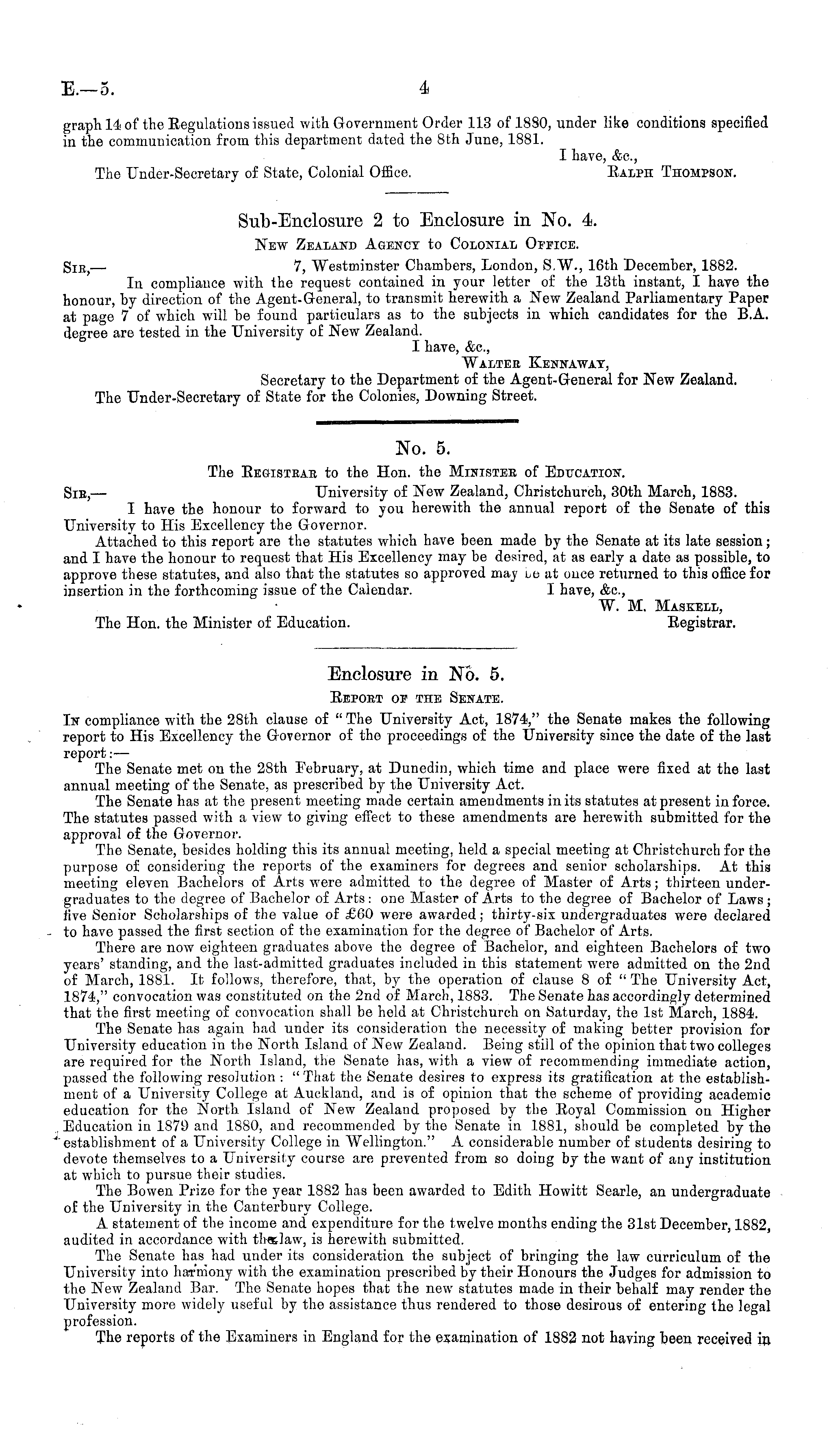 Enclosure in No. 5. Eepoet of the Senate. In compliance with the 28th clause of " The University Act, 1874," the Senate makes the following report to His Excellency the Governor of the proceedings of the University since the date of the last report: — The Senate met on the 28th February, at Dunedin, which time and place were fixed at the last annual meeting of the Senate, as prescribed by the University Act. The Senate has at the present meeting made certain amendments in its statutes at present in force. The statutes passed with a view to giving effect to these amendments are herewith submitted for the approval of the Governor. The Senate, besides holding this its annual meeting, held a special meeting at Christchurch for the purpose of considering the reports of the examiners for degrees and senior scholarships. At this meeting eleven Bachelors of Arts were admitted to the degree of Master of Arts; thirteen undergraduates to the degree of Bachelor of Arts: one Master of Arts to the degree of Bachelor of Laws ; five Senior Scholarships of the value of £60 were awarded; thirty-six undergraduates were declared to have passed the first section of the examination for the degree of Bachelor of Arts. There are now eighteen graduates above the degree of Bachelor, and eighteen Bachelors of two years' standing, and the last-admitted graduates included in this statement were admitted on the 2nd of March, 1881. It follows, therefore, that, by the operation of clause 8 of " The University Act, 1874," convocation was constituted on the 2nd of March, 1883. The Senate has accordingly determined that the first meeting of convocation shall be held at Christchurch on Saturday, the Ist March, 1884. The Senate has again had under its consideration the necessity of making better provision for University education in the North Island of New Zealand. Being still of the opinion that two colleges are required for the North Island, the Senate has, with a view of recommending immediate action, passed the following resolution : " That the Senate desires to express its gratification at the establishment of a University College at Auckland, and is of opinion that the scheme of providing academic education for the North Island of New Zealand proposed by the Eoyal Commission on Higher Education in 1879 and 1880, and recommended by the Senate in 1881, should be completed by the establishment of a University College in "Wellington." A considerable number of students desiring to devote themselves to a University course are prevented from so doing by the want of any institution at which to pursue their studies. The Bowen Prize for the year 1882 has been awarded to Edith Howitt Searle, an undergraduate of the University in the Canterbury College. A statement of the income and expenditure for the twelve months ending the 31st December, 1882, audited in accordance with th&law, is herewith submitted. The Senate has had under its consideration the subject of bringing the law curriculum of the University into ha-r'mony with the examination prescribed by their Honours the Judges for admission to the New Zealand Bar. The Senate hopes that the new statutes made in their behalf may render the University more widely useful by the assistance thus rendered to those desirous of entering the legal profession. The reports of the Examiners in England for the examination of 1882 not having been received in