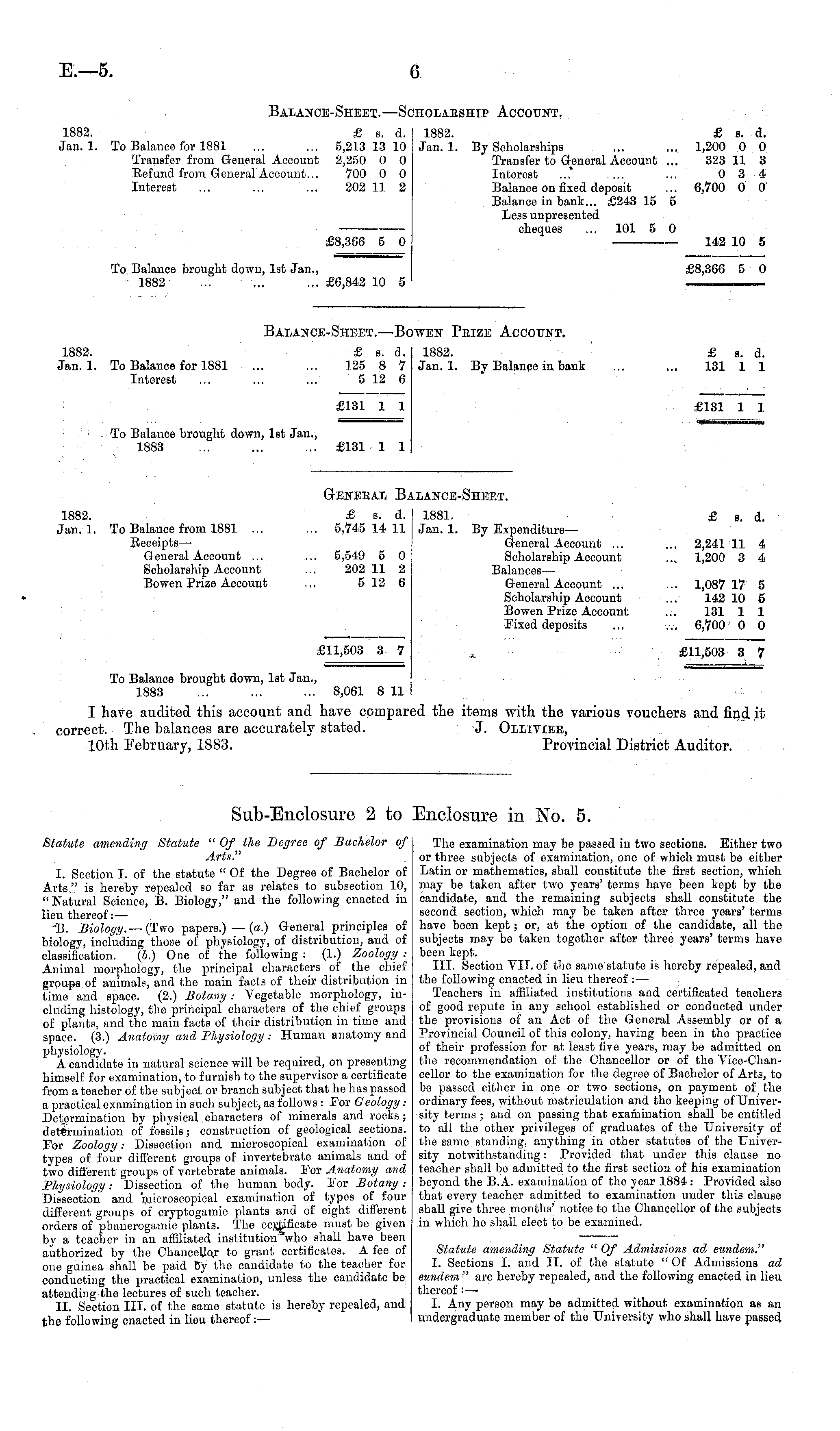 Balance-Sheet. —Scholarship Account. 1882. £ s. d. 1882. £ s. d. Jan. 1, To Balance for 1881 ... ... 5,213 13 10 Jan. 1. By Scholarships ... ... 1,200 0 0 Transfer from General Account 2,250 0 0 Transfer to General Account ... 323 11 3 Refund from General Account... 700 0 0 Interest ~,' ... ... 0 3 4 Interest ... ... ... 202 11 2 Balance on fixed deposit ... 6,700 0 0 Balance in bank... £243 15 5 less unpresented cheques ... 101 5 0 £8,366 5 0 142 10 5 To Balance brought down, Ist Jan., £8,366 5 0 1882 ... ... ... £6,842 10 5 _— Balance-Sheet.—Bowen Prize Account. 1882. £ s. d. 1882. £ s. d. Jan. 1. To Balance for 1881 ... ... 125 8 7 Jan. 1. By Balance in bank ... ... 131 1 1 Interest ... ... ... 5 12 6 ] £131 11 £131 1 1 To Balance brought down, Ist Jan., 1883 ~. ... ... £131 1 1 GrENEEAL BALANCE-SHEET. 1882. £ s. d. 1881. £ 8. d. Jan. 1. To Balance from 1881 ... ... 5,745 14 11 Jan. 1. By Expenditure—Beceipts — General Account ... ... 2,241 11 4 General Account ... ... 5,549 5 0 Scholarship Account ... 1,200 3 4 Scholarship Account ... 202 11 2 Balances— Bowen Prize Account ... 512 6 General Account ... ... 1,087 17 5 Scholarship Account ... 142 10 5 Bowen Prize Account ... 131 1 1 Fixed deposits ... ... 6,700 0 0 £11,503 3 1 m £11,503 3 7 To Balance brought down, Ist Jan., 1883 ... ... ... 8,061 811 I have audited this account and have compared the items with the various vouchers and find it correct. The balances are accurately stated. J. Ollivieb, 10th February, 1883. Provincial District Auditor.