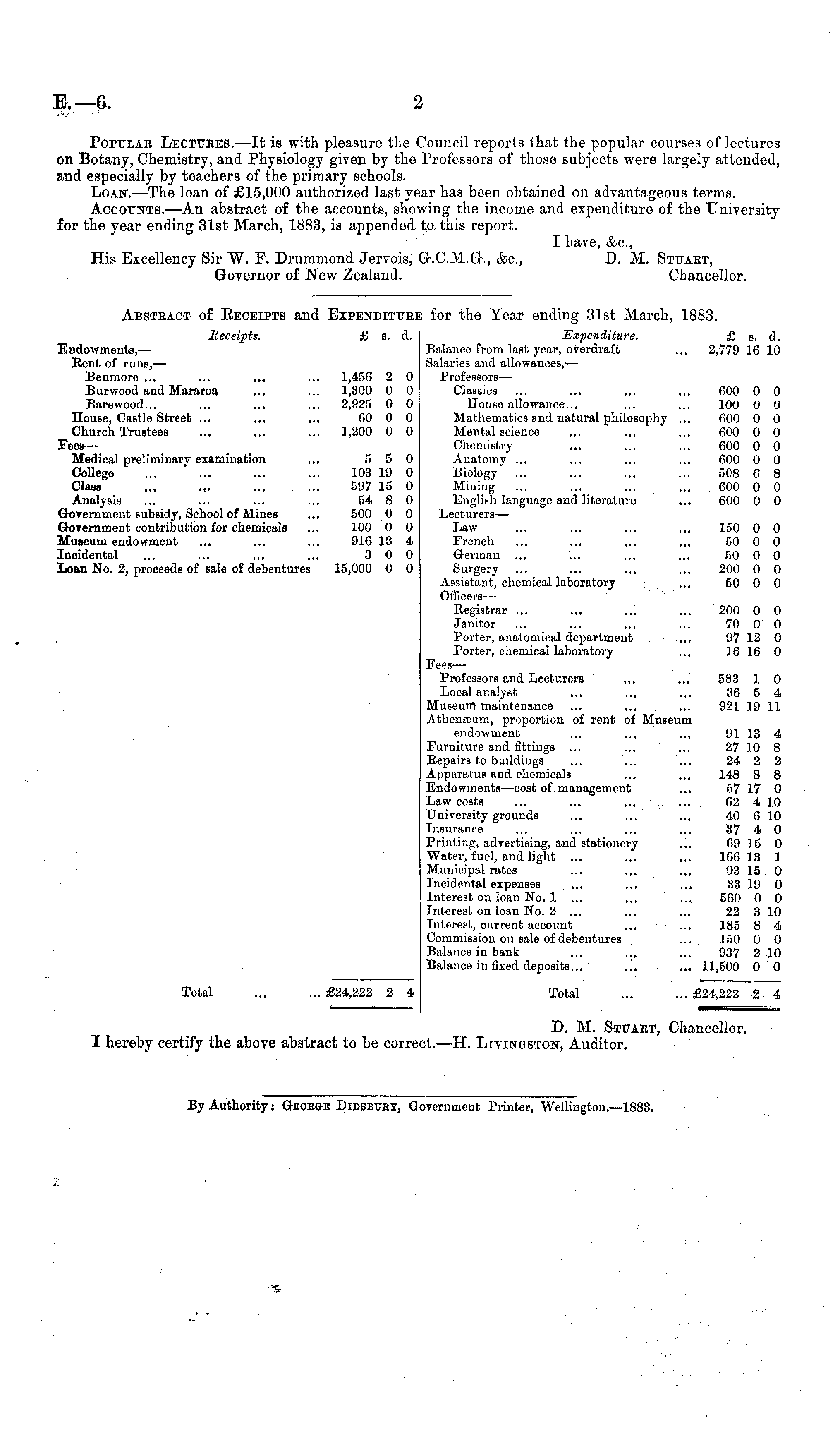 Popular Lectures.—It is with pleasure the Council reports that the popular courses of lectures on Botany, Chemistry, and Physiology given by the Professors of those subjects were largely attended, and especially by teachers of the primary schools. Loan.—The loan of £15,000 authorized last year has been obtained on advantageous terms. Accounts.—An abstract of the accounts, showing the income and expenditure of the University for the year ending 31st March, 1883, is appended to this report. I have, &c, His Excellency Sir W. E. Drummond Jervois, G.C.M.G., &c, D. M. Stuabt, Governor of New Zealand. Chancellor.