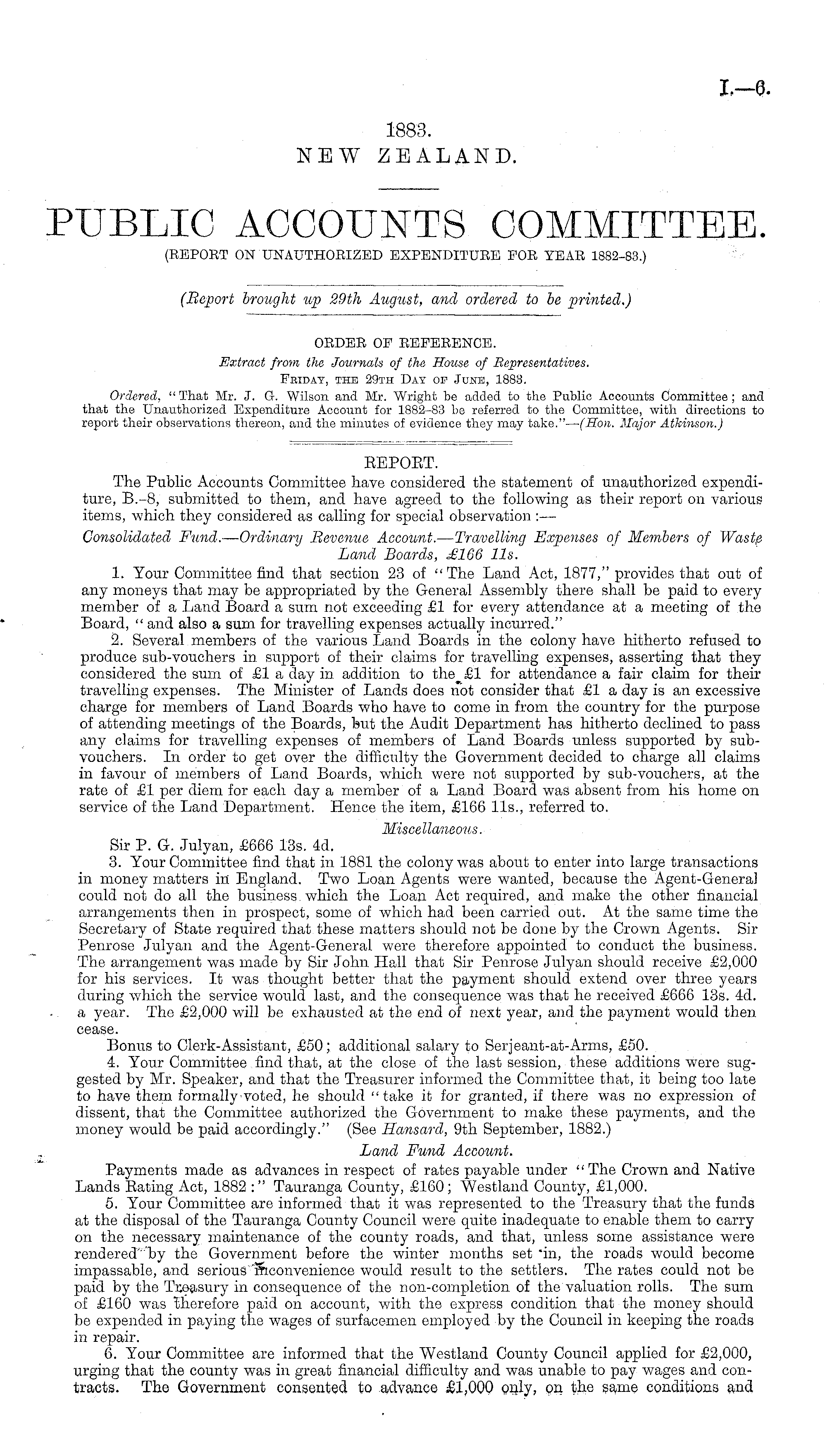 EEPOET. The Public Accounts Committee have considered the statement of unauthorized expenditure, 8.-8, submitted to them, and have agreed to the following as their report on various items, which they considered as calling for special observation: — Consolidated Fund. — Ordinary Bevenue Account. — Travelling Expenses of Members of Wast,e Land Boards, £106 lls. 1. Your Committee find that section 23 of "The Land Act, 1877," provides that out of any moneys that may be appropriated by the General Assembly there shall be paid to every member of a Land Board a sum not exceeding £1 for every attendance at a meeting of the Board, " and also a sum for travelling expenses actually incurred." 2. Several members of the various Land Boards in the colony have hitherto refused to produce sub-vouchers in support of their claims for travelling expenses, asserting that they considered the sum of £1 a day in addition to the^£l for attendance a fair claim for their travelling expenses. The Minister of Lands does not consider that £1 a day is an excessive charge for members of Land Boards who have to come in from the country for the purpose of attending meetings of the Boards, but the Audit Department has hitherto declined to pass any claims for travelling expenses of members of Land Boards unless supported by subvouchers. In order to get over the difficulty the Government decided to charge all claims in favour of members of Land Boards, which were not supported by sub-vouchers, at the rate of £1 per diem for each day a member of a Land Board was absent from his home on service of the Land Department. Hence the item, £166 lls., referred to. Miscellaneo'its. Sir P. G. Julyan, £666 13s. 4d. 3. Your Committee find that in 1881 the colony was about to enter into large transactions in money matters in England. Two Loan Agents were wanted, because the Agent-General could not do all the business which the Loan Act required, and make the other financial arrangements then in prospect, some of which had been carried out. At the same time the Secretary of State required that these matters should not be done by the Crown Agents. Sir Penrose Julyan and the Agent-General were therefore appointed to conduct the business. The arrangement was made by Sir John Hall that Sir Penrose Julyan should receive £2,000 for his services. It was thought better that the payment should extend over three years during which the service would last, and the consequence was that he received £666 13s. 4d. a year. The £2,000 will be exhausted at the end of next year, and the payment would then cease. Bonus to Clerk-Assistant, £50; additional salary to Serjeant-at-Arms, £50. 4. Your Committee find that, at the close of the last session, these additions were suggested by Mr. Speaker, and that the Treasurer informed the Committee that, it being too late to have them formally voted, he should "take it for granted, if there was no expression of dissent, that the Committee authorized the Government to make these payments, and the money would be paid accordingly." (See Hansard, 9th September, 1882.) Land Fund Account. Payments made as advances in respect of rates payable under "The Crown and Native Lands Eating Act, 1882 :" Tauranga County, £160; Westland County, £1,000. 5. Your Committee are informed that it was represented to the Treasury that the funds at the disposal of the Tauranga County Council were quite inadequate to enable them to carry on the necessary maintenance of the county roads, and that, unless some assistance were rendered" by the Government before the winter months set "in, the roads would become impassable, and serious would result to the settlers. The rates could not be paid by the Treasury in consequence of the non-completion of the valuation rolls. The sum of £160 was therefore paid on account, with the express condition that the money should be expended in paying the wages of surfacemen employed by the Council in keeping the roads in repair. 6. Your Committee are informed that the Westland County Council applied for £2,000, urging that the county was in great financial difficulty and was unable to pay wages and contracts. The Government consented to advance £1,000 only, on the same conditions and