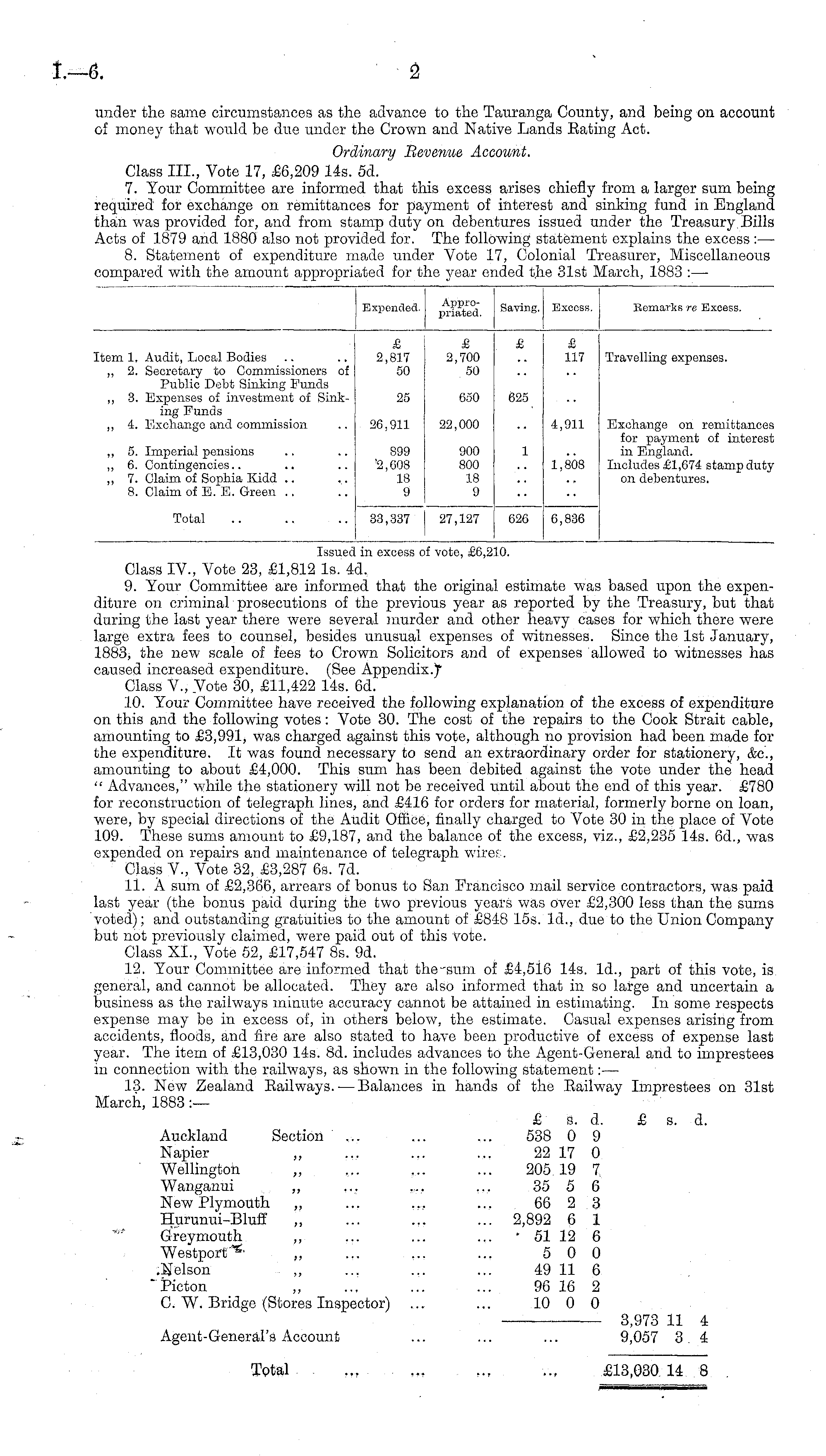under the same circumstances as the advance to the Tauranga County, and being on account of money that would be due under the Crown and Native Lands Eating Act. Ordinary Revenue Account. Class 111., Vote 17, £6,209 14s. sd. 7. Your Committee are informed that this excess arises chiefly from a larger sum being required for exchange on remittances for payment of interest and sinking fund in England than was provided for, and from stamp duty on debentures issued under the Treasury Bills Acts of 1879 and 1880 also not provided for. The following statement explains the excess : — 8. Statement of expenditure made under Vote 17, Colonial Treasurer, Miscellaneous compared with the amount appropriated for the year ended the 31st March, 1883 :—