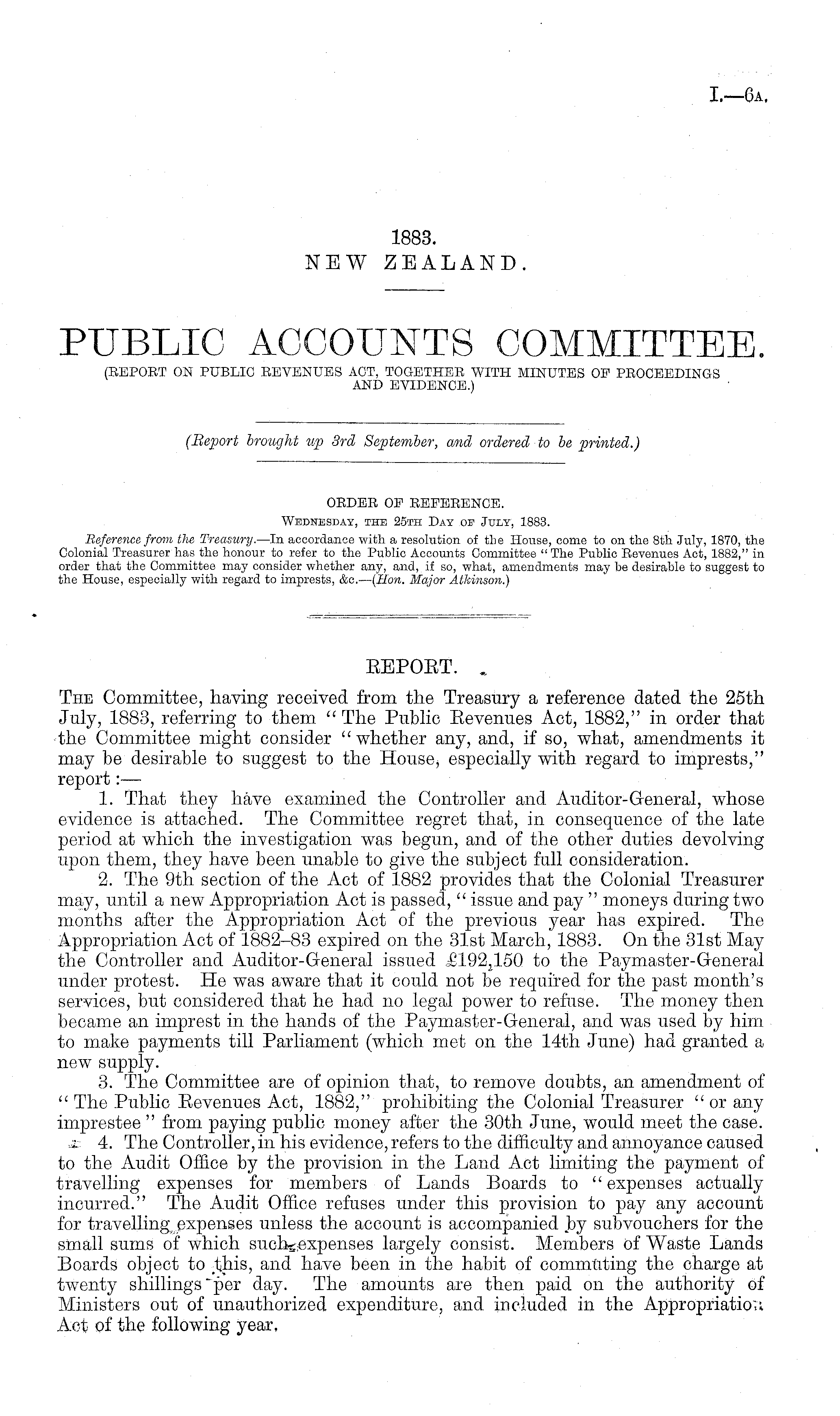 OBDEB OF BEFEBENCE. Wednesday, the 25th Day of July, 1883. Reference from the Treasury, —ln accordance with a resolution of the House, come to on the Bth July, 1870, the Colonial Treasurer has the honour to refer to the Public Accounts Committee "The Public Revenues Act, 1882," in order that the Committee may consider whether any, and, if so, what, amendments may be desirable to suggest to the House, especially with regard to imprests, &c.— (Hon. Major Atkinson.)