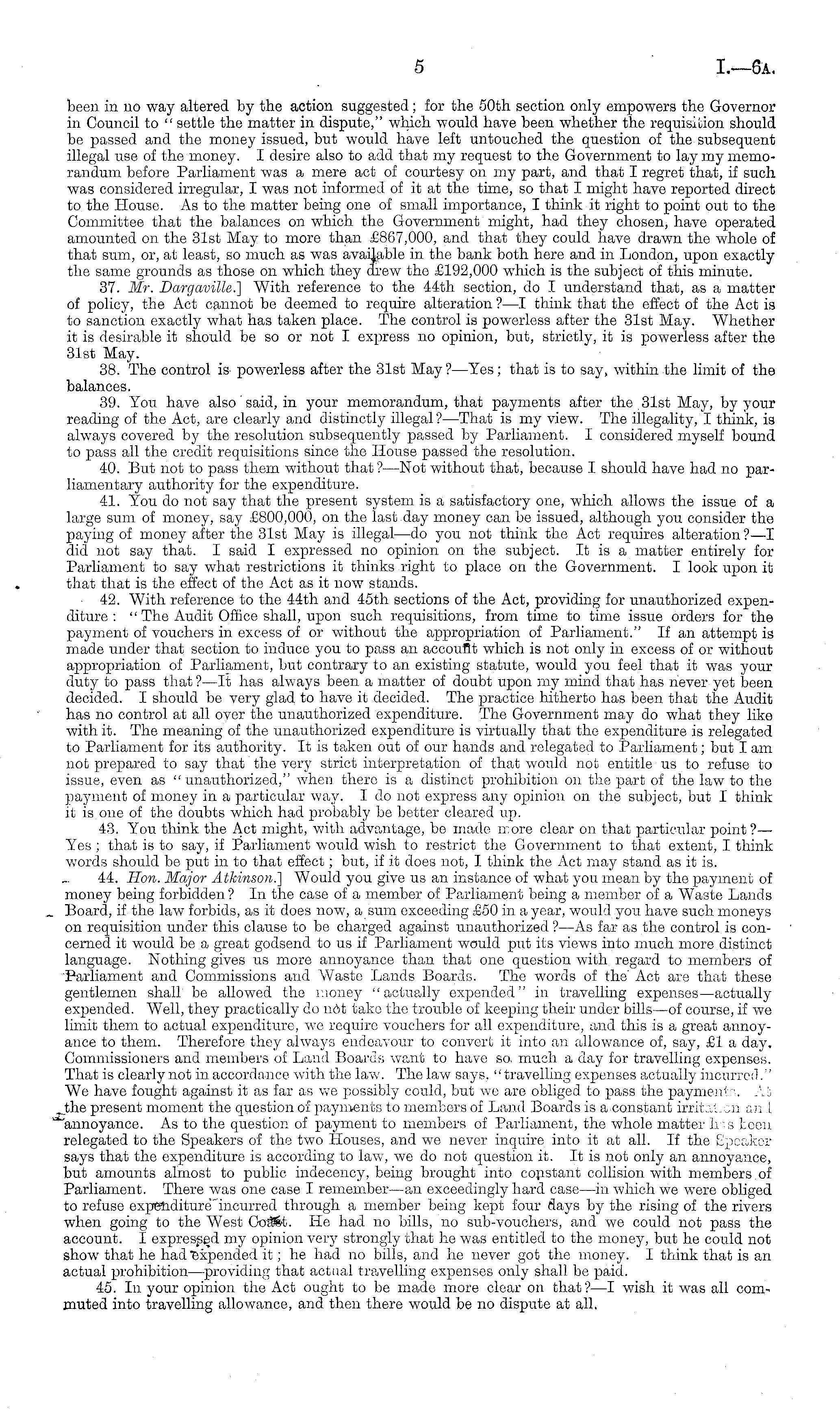 been in no way altered by the action suggested; for the 50th section only empowers the Governor in Council to " settle the matter in dispute," which would have been whether the requisition should be passed and the money issued, but would have left untouched the question of the subsequent illegal use of the money. I desire also to add that my request to the Government to lay my memorandum before Parliament was a mere act of courtesy on my part, and that I regret that, if such was considered irregular, I was not informed of it at the time, so that I might have reported direct to the House. As to the matter being one of small importance, I think it right to point out to the Committee that the balances on which the Government might, had they chosen, have operated amounted on the 31st May to more than £867,000, and that they could have drawn the whole of that sum, or, at least, so much as was available in the bank both here and in London, upon exactly the same grounds as those on which they drew the £192,000 which is the subject of this minute. 37. Mr. Dargaville.] With reference to the 44th section, do I understand that, as a matter of policy, the Act cannot be deemed to require alteration ?—I think that the effect of the Act is to sanction exactly what has taken place. The control is powerless after the 31st May. Whether it is desirable it should be so or not I express no opinion, but, strictly, it is powerless after the 31st May. 38. The control is powerless after the 31st May ?—Yes; that is to say, within the limit of the balances. 39. You have also said, in your memorandum, that payments after the 31st May, by your reading of the Act, are clearly and distinctly illegal ?—That is my view. The illegality, I think, is always covered by the resolution subsequently passed by Parliament. I considered myself bound to pass all the credit requisitions since the House passed the resolution. 40. But not to pass them without that ? —Not without that, because I should have had no parliamentary authority for the expenditure. 41. You do not say that the present system is a satisfactory one, which allows the issue of a large sum of money, say £800,000, on the last day money can be issued, although you consider the paying of money after the 31st May is illegal —do you not think the Act requires alteration ?—I did not say that. I said I expressed no opinion on the subject. It is a matter entirely for Parliament to say what restrictions it thinks right to place on the Government. I look upon it that that is the effect of the Act as it now stands. 42. With reference to the 44th and 45th sections of the Act, providing for unauthorized expenditure : " The Audit Office shall, upon such requisitions, from time to time issue orders for the payment of vouchers in excess of or without the appropriation of Parliament." If an attempt is made under that section to induce you to pass an account which is not only in excess of or without appropriation, of Parliament, but contrary to an existing statute, would you feel that it was your duty to pass that ?—lt has always been a matter of doubt upon my mind that has never yet been decided. I should be very glad to have it decided. The practice hitherto has been that the Audit has no control at all over the unauthorized expenditure. The Government may do what they like with it. The meaning of the unauthorized expenditure is virtually that the expenditure is relegated to Parliament for its authority. It is taken out of our hands and relegated to Parliament; but lam not prepared to say that the very strict interpretation of that would not entitle us to refuse to issue, even as "unauthorized," when there is a distinct prohibition on the part of the law to the payment of money in a particular way. Ido not express any opinion on the subject, but I think it is one of the doubts which had probably be better cleared up. 43. You think the Act might, with advantage, be made more clear on that particular point ?— Yes ; that is to say, if Parliament would wish to restrict the Government to that extent, I think words should be put in to that effect; but, if it does not, I think the Act may stand as it is. 44. Hon. Major Atkinson.] Would you give us an instance of what you mean by the payment of money being forbidden? In the case of a member of Parliament being a member of a Waste Lands Board, if the law forbids, as it does now, a sum exceeding £50 in a year, would you have such moneys on requisition under this clause to be charged against unauthorized ? —As far as the control is concerned it would be a great godsend to us if Parliament would put its views into much more distinct language. Nothing gives us more annoyance than that one question, with regard to members of Parliament and Commissions and Waste Lands Boards. The words of the Act are that these gentlemen shall be allowed the money "actually expended" in travelling expenses—actually expended. Well, they practically do not tako the trouble of keeping their under bills—of course, if we limit them to actual expenditure, we require vouchers for all expenditure, and this is a great annoyance to them. Therefore they always endeavour to convert it into an allowance of, say, £1 a day. Commissioners and members of Land Boards want to have so, much a day for travelling expenses. That is clearly not in accordance with the law. The law says, "travelling expenses actually incurred." We have fought against it as far as we possibly could, but wo are obliged to pass the payment::. At . the present moment the question of payments to members of Land Boards is a constant irritail.cn an 1 "annoyance. As to the question of payment to members of Parliament, the whole matter h-s teen relegated to the Speakers of the two Houses, and we never inquire into it at all. If the Speaker says that the expenditure is according to law, we do not question it. It is not only an annoyance, but amounts almost to public indecency, being bro