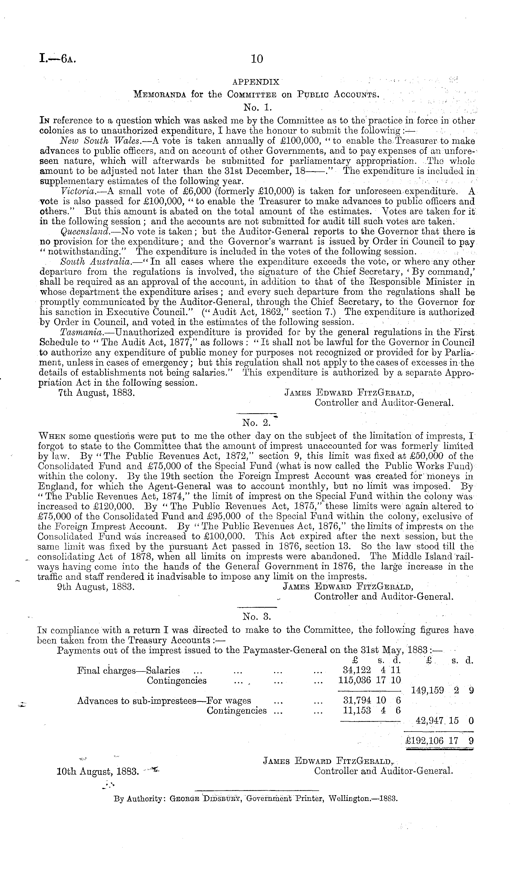 No. 2." When some questions were put to me the other day on the subject of the limitation of imprests, I forgot to state to the Committee that the amount of imprest unaccounted for was formerly limited by law. By " The Public Eevenues Act, 1872," section 9, this limit was fixed at £50,000 of the Consolidated Fund and £75,000 of the Special Fund (what is now called the Public Works Fund) within the colony. By the 19th section the Foreign Imprest Account was created for moneys in England, for which the Agent-General was to account monthly, but no limit was imposed. By " The Public Eevenues Act, 1874," the limit of imprest on the Special Fund within the colony was increased to £120,000. By " The Public Eevenues Act, 1875," these limits were again altered to £75,000 of the Consolidated Fund and £95,000 of the Special Fund within the colony, exclusive of the Foreign Imprest Account. By " The Public Eevenues Act, 1876," the limits of imprests on the Consolidated Fund was increased" to £100,000. This Act expired after the next session, but the same limit was fixed by the pursuant Act passed in 1876, section 13. So the law stood till the consolidating Act of 1878, when all limits on imprests were abandoned. The Middle Island railways having come into the hands of the General Government in 1876, the large increase in the traffic and staff rendered it inadvisable to impose any limit on the imprests. 9th August, 1883. James Edwaed FitzGebald, Controller and Auditor-General.