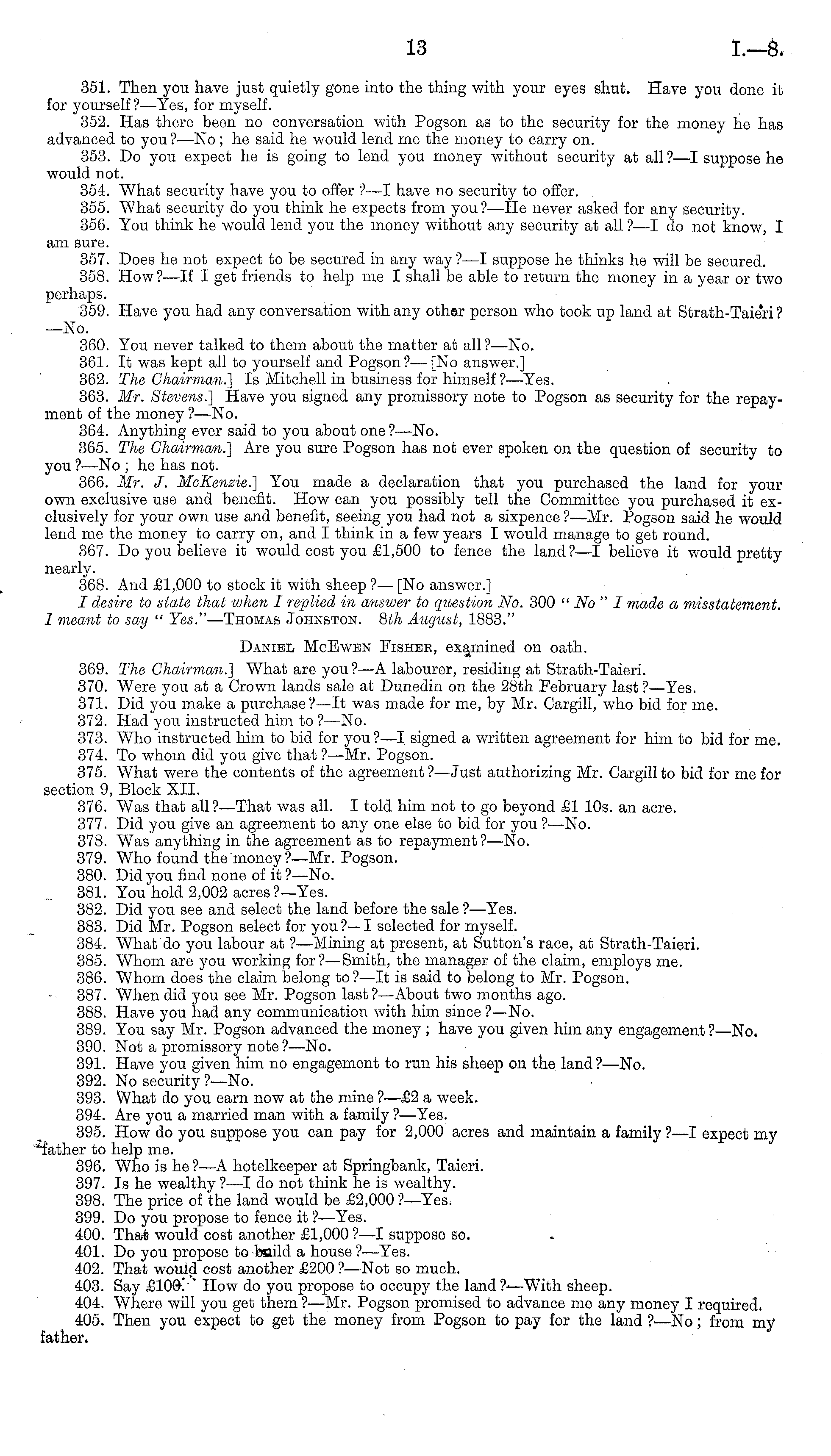 351. Then you have just quietly gone into the thing with your eyes shut. Have you done it for yourself ?—Yes, for myself. 352. Has there been no conversation with Pogson as to the security for the money he has advanced to you ?—No ; he said he would lend me the money to carry on. 353. Do you expect he is going to lend you money without security at all ?—I suppose he would not. 354. What security have you to offer ?—I have no security to offer. 355. What security do you think he expects from you?—He never asked for any security. 356. You think he would lend you the money without any security at all ?—I do not know, I am sure. 357. Does he not expect to be secured in any way?—l suppose he thinks he will be secured. 358. How?—lf I get friends to help me I shall be able to return the money in a year or two perhaps. 359. Have you had any conversation with any other person who took up land at Strath-Taieri9 —No. 360. You never talked to them about the matter at all?— No. 361. It was kept all to yourself and Pogson?— [No answer.] 362. The Chairman^ Is Mitchell in business for himself ?—Yes. 363. Mr. Stevens.] Have you signed any promissory note to Pogson as security for the repayment of the money ?—No. 364. Anything ever said to you about one?— No. 365. The Chairman.] Are you sure Pogson has not ever spoken on the question of security to you ?—No ; he has not. 366. Mr. J. McKenzie.] You made a declaration that you purchased the land for your own exclusive use and benefit. How can you possibly tell the Committee you purchased it exclusively for your own use and benefit, seeing you had not a sixpence ?—Mr. Pogson said he would lend me the money to carry on, and I think in a few years I would manage to get round. 367. Do you believe it would cost you £1,500 to fence the land?—l believe it would pretty nearly. 368. And £1,000 to stock it with sheep ?— [No answer.] I desire to state that when I replied in answer to question No. 300 " No " I made co misstatement. 1 meant to say " Yes." —Thomas Johnston. Bth August, 1883." Daniel McEwen Fishee, examined on oath. 369. The Chairman.] What are you ? —A labourer, residing at Strath-Taieri. 370. Were you at a Crown lands sale at Dunedin on the 28th February last ?—Yes. 371. Did you make a purchase? —It was made for me, by Mr. Cargill, who bid for me. 372. Had you instructed him to ? —No. 373. Who instructed him to bid for you ?—I signed a written agreement for him to bid for me. 374. To whom did you give that ? —Mr. Pogson. 375. What were the contents of the agreement? —Just authorizing Mr. Cargill to bid for me for section 9, Block XII. 376. Was that all?— That was all. I told him not to go beyond £1 10s. an acre. 377. Did you give an agreement to any one else to bid for you ?—No. 378. Was anything in the agreement as to repayment ?—No. 379. Who found the money?— Mr. Fogson. 380. Did you find none of it ?—No. 381. You hold 2,002 acres?— Yes. 382. Did you see and select the land before the sale ?—Yes. 383. Did Mr. Bogson select for you?—l selected for myself. 384. What do you labour at ?—Mining at present, at Sutton's race, at Strath-Taieri. 385. Whom are you working for? —Smith, the manager of the claim, employs me. 386. Whom does the claim belong to ?—lt is said to belong to Mr. Pogson. -s- 387. When did you see Mr. Pogson last?— About two months ago. 388. Have you had any communication with him since ?—No. 389. You say Mr. Pogson advanced the money ; have you given him any engagement ?—No. 390. Not a promissory note ?—No. 391. Have you given him no engagement to run his sheep on the land?— No. 392. No security ?—No. 393. What do you earn now at the mine ?—£2 a week. 394. Are you a married man with a family ?—Yes. 395. How do you suppose you can pay for 2,000 acres and maintain a family ?—I expect my 'father to help me. 396. Who is he?—A hotelkeeper at Springbank, Taieri. 397. Is he wealthy ?—I do not think he is wealthy. 398. The price of the land would be £2,000 ?—Yes. 399. Do you propose to fence it ?—Yes. 400. That would cost another £1,000 ?—I suppose so. 401. Do you propose to build a house ?—Yes. 402. That would cost another £200 ?—Not so much. 403. Say £100! " How do you propose to occupy the land ?—With sheep. 404. Where will you get them ?—Mr. Pogson promised to advance me any money I required. 405. Then you expect to get the money from Pogson to pay for the land ?—No; from my father.