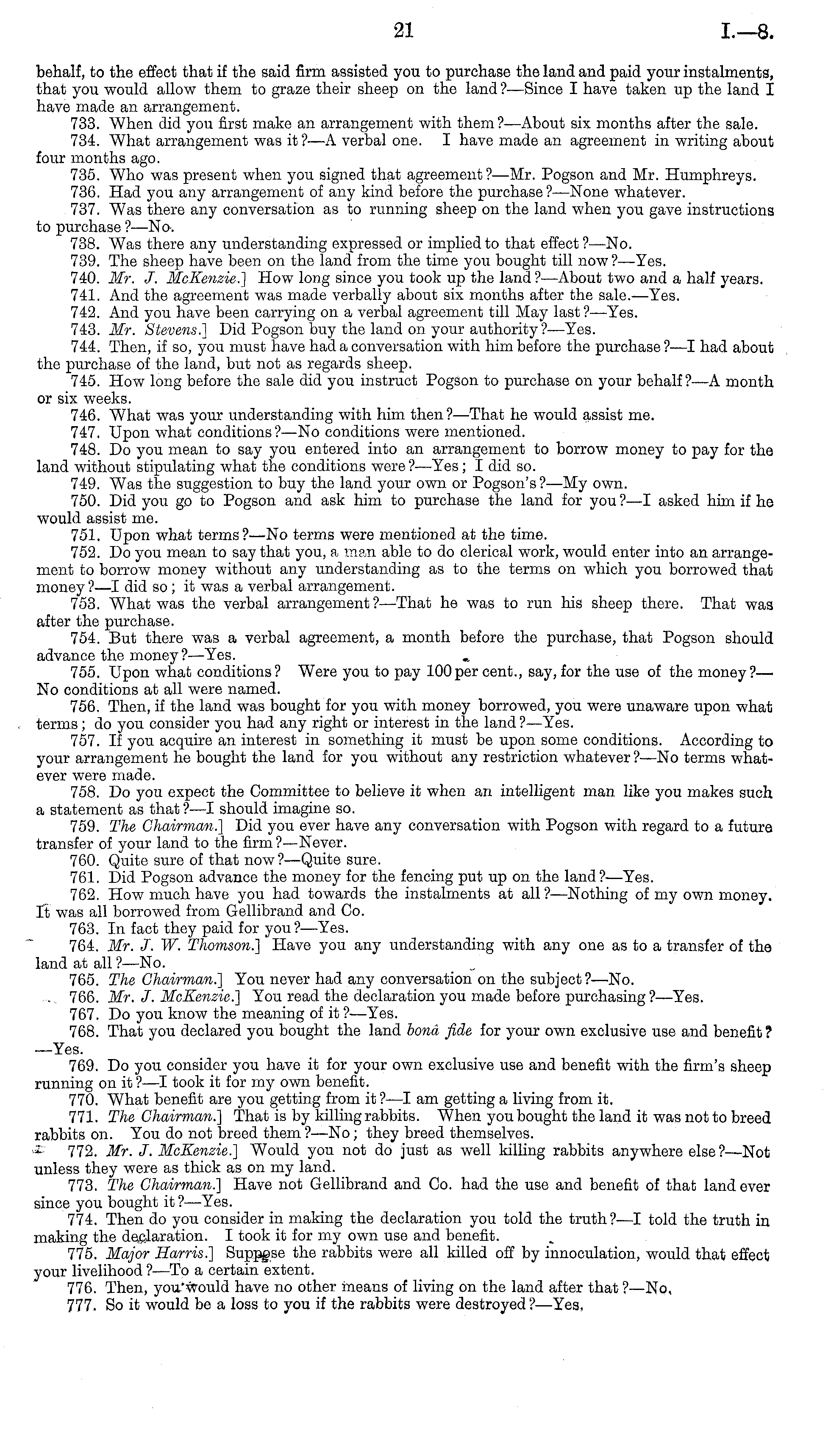 behalf, to the effect that if the said firm assisted you to purchase the land and paid your instalments, that you would allow them to graze their sheep on the land ?—Since I have taken up the land I have made an arrangement. 733. When did you first make an arrangement with them?— About six months after the sale. 734. What arrangement was it ?—A verbal one. I have made an agreement in writing about four months ago. 735. Who was present when you signed that agreement ?—Mr. Pogson and Mr. Humphreys. 736. Had you any arrangement of any kind before the purchase ? —None whatever. 737. Was there any conversation as to running sheep on the land when you gave instructions to purchase ? —No. 738. Was there any understanding expressed or implied to that effect ?—No. 739. The sheep have been on the land from the time you bought till now ?—Yes. 740. Mr. J. McKenzie.] How long since you took up the land ? —About two and a half years. 741. And the agreement was made verbally about six months after the sale.—Yes. 742. And you have been carrying on a verbal agreement till May last?— Yes. 743. Mr. Stevens.] Did Pogson buy the land on your authority ?—Yes. 744. Then, if so, you must have had a conversation with him before the purchase?—l had about the purchase of the land, but not as regards sheep. 745. How long before the sale did you instruct Pogson to purchase on your behalf?—A month or six weeks. 746. What was your understanding with him then? —That he would assist me. 747. Upon what conditions? —No conditions were mentioned. 748. Do you mean to say you entered into an arrangement to borrow money to pay for the land without stipulating what the conditions were?— Yes; I did so. 749. Was the suggestion to buy the land your own or Pogson's?—My own. 750. Did you go to Pogson and ask him to purchase the land for you ?—I asked him if he would assist me. 751. Upon what terms?—No terms were mentioned at the time. 752. Do you mean to say that you, a man able to do clerical work, would enter into an arrangement to borrow money without any understanding as to the terms on which you borrowed that money?—l did so ;it was a verbal arrangement. 753. What was the verbal arrangement?— That he was to run his sheep there. That was after the purchase. 754. But there was a verbal agreement, a month before the purchase, that Pogson should advance the money ?—Yes. „ 755. Upon what conditions? Were you to pay 100 per cent., say, for the use of the money?— No conditions at all were named. 756. Then, if the land was bought for you with money borrowed, you were unaware upon what terms; do you consider you had any right or interest in the land ?—Yes. 757. If you acquire an interest in something it must be upon some conditions. According to your arrangement he bought the land for you without any restriction whatever ? —No terms whatever were made. 758. Do you expect the Committee to believe it when an intelligent man like you makes such a statement as that ?—I should imagine so. 759. The Chairman.] Did you ever have any conversation with Pogson with regard to a future transfer of your land to the firm?— Never. 760. Quite sure of that now?— Quite sure. 761. Did Pogson advance the money for the fencing put up on the land?— Yes. 762. How much have you had towards the instalments at all ? —Nothing of my own money. It was all borrowed from Gellibrand and Co. 763. In fact they paid for you?— Yes. 764. Mr. J. W. Thomson.] Have you any understanding with any one as to a transfer of the land at all ?—No. 765. The Chairman.] You never had any conversation on the subject?— No. 766. Mr. J. McKenzie.] You read the declaration you made before purchasing?— Yes. 767. Do you know the meaning of it ?—Yes. 768. That you declared you bought the land bond, fide for your own exclusive use and benefit ? —Yes. 769. Do you consider you have it for your own exclusive use and benefit with the firm's sheep running on it ?—I took it for my own benefit. 770. What benefit are you getting from it ?—I am getting a living from it. 771. The Chairman.] That is by killing rabbits. When you bought the land it was not to breed rabbits on. You do not breed them ?—No; they breed themselves. 772. Mr. J. McKenzie.] Would you not do just as well killing rabbits anywhere else?— Not unless they were as thick as on my land. 773. The Chairman.] Have not Gellibrand and Co. had the use and benefit of that land ever since you bought it?— Yes. 774. Then do you consider in making the declaration you told the truth?—l told the truth in making the declaration. I took it for my own use and benefit. 775. Major Harris.] Suppose the rabbits were all killed off by innoculation, would that effect your livelihood ?—To a certain extent. 776. Then, you'would have no other means of living on the land after that ?—No, 777. So it would be a loss to you if the rabbits were destroyed?— Yes.