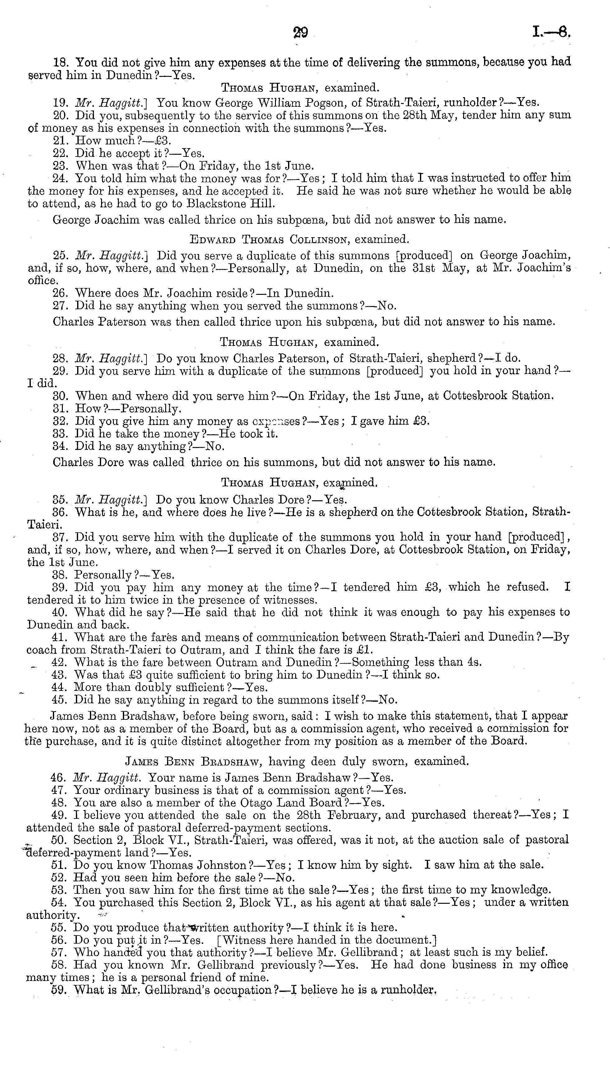 18. You did not give him any expenses at the time of delivering the summons, because you had served him in Dunedin ?—Yes. Thomas Hughan, examined. 19. Mr. Haggitt.] You know George William Pogson, of Strath-Taieri, runholder? —Yes. 20. Did you, subsequently to the service of this summons on the 28th May, tender him any sum of money as his expenses in connection with the summons? —Yes. 21. How much?—£3. 22. Did he accept it ?—Yes. 23. When was that ?—On Friday, the Ist June. 24. You told him what the money was for ?—Yes; I told him that I was instructed to offer him the money for his expenses, and he accepted it. He said he was not sure whether he would be able to attend, as he had to go to Blackstone Hill. George Joachim was called thrice on his subpoena, but did not answer to his name. Edwaed Thomas Collinson, examined. 25. Mr. Haggitt.] Did you serve a duplicate of this summons [produced] on George Joachim, and, if so, how, where, and when ?—Bersonally, at Dunedin, on the 31st May, at Mr. Joachim's office. 26. Where does Mr. Joachim reside? —In Dunedin. 27. Did he say anything when you served the summons?— No. Charles Paterson was then called thrice upon his subpoena, but did not answer to his name. Thomas Hughan, examined, 28. Mr. Haggitt.] Do you know Charles Paterson, of Strath-Taieri, shepherd?—l do. 29. Did you serve him with a duplicate of the summons [produced] you hold in your hand ?— I did. 30. When and where did you serve him?—On Friday, the Ist June, at Cottesbrook Station. 31. How?— Personally. 32. Did you give him any money as expenses? —Yes; I gave him £3. 33. Did he take the money? —He took it. 34. Did he say anything?— No. Charles Dore was called thrice on his summons, but did not answer to his name. Thomas Hughan, examined. 35. Mr. Haggitt.] Do you know Charles Dore ?—Yes. 36. What is he, and where does he live? —He is a shepherd on the Cottesbrook Station, StrathTaieri. 37. Did you serve him with the duplicate of the summons you hold in your hand [produced], and, if so, how, where, and when?—l served it on Charles Dore, at Cottesbrook Station, on Friday, the Ist June. 38. Personally ?—Yes. 39. Did you pay him any money at the time? —I tendered him £3, which he refused. I tendered it to him twice in the presence of witnesses. 40. What did he say ?—He said that he did not think it was enough to pay his expenses to Dunedin and back. 41. What are the fares and means of communication between Strath-Taieri and Dunedin?—By coach from Strath-Taieri to Outram, and I think the fare is £1. 42. What is the fare between Outram and Dunedin? —Something less than 4s. 43. Was that £3 quite sufficient to bring him to Dunedin ?—I think so. 44. More than doubly sufficient ?—Yes. 45. Did he say anything in regard to the summons itself?— No. James Benn Bradshaw, before being sworn, said: I wish to make this statement, that I appear here now, not as a member of the Board, but as a commission agent, who received a commission for the purchase, and it is quite distinct altogether from my position as a member of the Board. James Benn Beadshaw, having deen duly sworn, examined. 46. Mr. Haggitt. Your name is James Benn Bradshaw?—Yes. 47. Your ordinary business is that of a commission agent?— Yes. 48. You are also a member of the Otago Land Board ?—Yes. 49. I believe you attended the sale on the 28th February, and purchased thereat ? —Yes; I attended the sale of pastoral deferred-payment sections. 50. Section 2, Block VI., Strath-Taieri, was offered, was it not, at the auction sale of pastoral deferred-payment land?— Yes. 51. Do you know Thomas Johnston?—Yes; I know him by sight. I saw him at the sale. 52. Had you seen him before the sale ?—No. 53. Then you saw him for the first time at the sale ?—Yes; the first time to my knowledge. 54. You purchased this Section 2, Block VI., as his agent at that sale? —Yes; under a written authority. 55. Do you produce that ''Written authority ? —I think it is here. 56. Do you put it in ?—Yes. [Witness here handed in the document.] 57. Who handed you that authority?—l believe Mr. Gellibrand; at least such is my belief. 58. Had you known Mr. Gellibrand previously? —Yes. He had done business in my office many times; he is a personal friend of mine. 59. What is Mr. Gellibrand's occupation?—l believe he is a runholder,