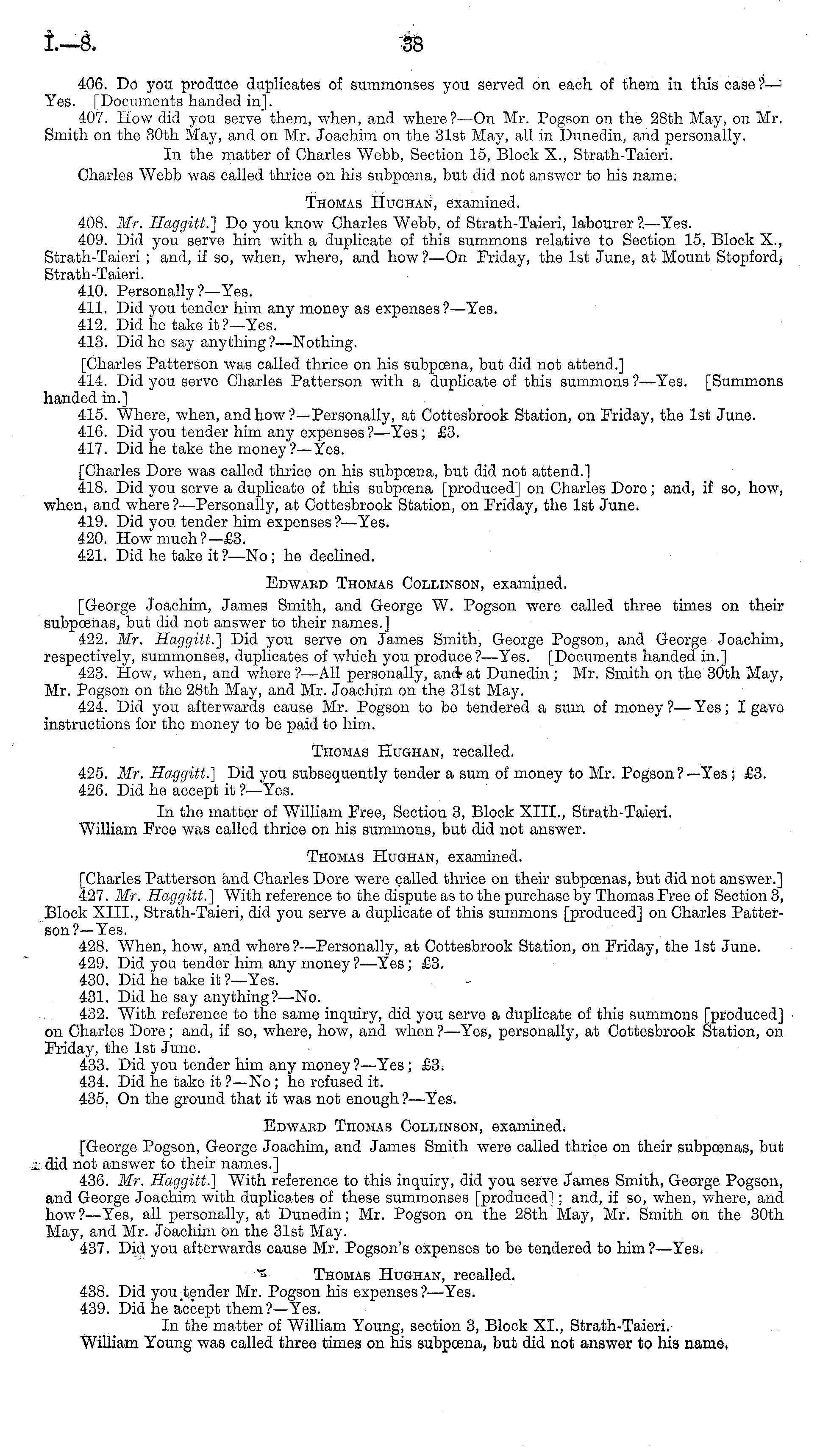 406. Do you produce duplicates of summonses you served on each of them in this case?—• Yes. [Documents handed in]. 407. How did you serve them, when, and where?—On Mr. Pogson on the 28th May, on Mr. Smith on the 30th May, and on Mr. Joachim on the 31st May, all in Dunedin, and personally. In the matter of Charles Webb, Section 15, Block X., Strath-Taieri. Charles Webb was called thrice on his subpoena, but did not answer to his name. Thomas Hughan, examined. 408. Mr. Haggitt.] Do you know Charles Webb, of Strath-Taieri, labourer ?.—Yes. 409. Did you serve him with a duplicate of this summons relative to Section 15, Block X., Strath-Taieri ; and, if so, when, where, and how ?—On Friday, the Ist June, at Mount Stopford, Strath-Taieri. 410. Personally?— Yes. 411. Did you tender him any money as expenses?— Yes. 412. Did he take it?— Yes. 413. Did he say anything?— Nothing. [Charles Patterson was called thrice on his subpoena, but did not attend.] 414. Did you serve Charles Patterson with a duplicate of this summons ?—Yes. [Summons handed in.] 415. Where, when, and how?— Personally, at Cottesbrook Station, on Friday, the Ist June. 416. Did you tender him any expenses?— Yes; £3. 417. Did he take the money? —Yes. [Charles Dore was called thrice on his subpoena, but did not attend.] 418. Did you serve a duplicate of this subpoena [produced] on Charles Dore; and, if so, how, when, and where? —Personally, at Cottesbrook Station, on Friday, the Ist June. 419. Did you tender him expenses ?—Yes. 420. How much?—£3. 421. Did he take it?—No; he declined. Edwabd Thomas Collinson, examined. [George Joachim, James Smith, and George W. Pogson were called three times on their subpoenas, but did not answer to their names.] 422. Mr. Haggitt.] Did you serve on James Smith, George Pogson, and George Joachim, respectively, summonses, duplicates of which you produce?— Yes. [Documents handed in.] 423. flow, when, and where ? —All personally, and- at Dunedin ; Mr. Smith on the 30th May, Mr. Pogson on the 28th May, and Mr. Joachim on the 31st May. 424. Did you afterwards cause Mr. Pogson to be tendered a sum of money ?— Yes; I gave instructions for the money to be paid to him. Thomas Hughan, recalled. 425. Mr. Haggitt.] Did you subsequently tender a sum of money to Mr. Pogson?—Yes; £3. 426. Did he accept it ?—Yes. In the matter of William Free, Section 3, Block XIII., Strath-Taieri. William Free was called thrice on his summons, but did not answer. Thomas Hughan, examined. [Charles Batterson and Charles Dore were called thrice on their subpoenas, but did not answer.] 427. Mr. Haggitt.] With reference to the dispute as to the purchase by Thomas Free of Section 3, Block XIII., Strath-Taieri, did you serve a duplicate of this summons [produced] on Charles Patterson?—Yes. 428. When, how, and where?— Personally, at Cottesbrook Station, on Friday, the Ist June. 429. Did you tender him any money ?—Yes; £3. 430. Did he take it ?—Yes. 431. Did he say anything?— No. 432. With reference to the same inquiry, did you serve a duplicate of this summons [produced] on Charles Dore; and, if so, where, how, and when ?—Yes, personally, at Cottesbrook Station, on Friday, the Ist June. 433. Did you tender him any money ?—Yes; £3. 434. Did he take it ?—No; he refused it. 435. On the ground that it was not enough?— Yes. Edwaed Thomas Collinson, examined. [George Pogson, George Joachim, and James Smith were called thrice on their subpoenas, but did not answer to their names.] 436. Mr. Haggitt.] With reference to this inquiry, did you serve James Smith, George Pogson, and George Joachim with duplicates of these summonses [producedl; and, if so, when, where, and how ?—Yes, all personally, at Dunedin; Mr. Pogson on the 28th May, Mr. Smith on the 30th May, and Mr. Joachim on the 31st May. 437. Did you afterwards cause Mr. Pogson's expenses to be tendered to him?— Yes. Thomas Hughan, recalled. 438. Did you tender Mr. Pogson his expenses?— Yes. 439. Did he accept them ? —Yes. In the matter of William Young, section 3, Block XL, Strath-Taieri. William Young was called three times on his subpoena, but did not answer to his name,