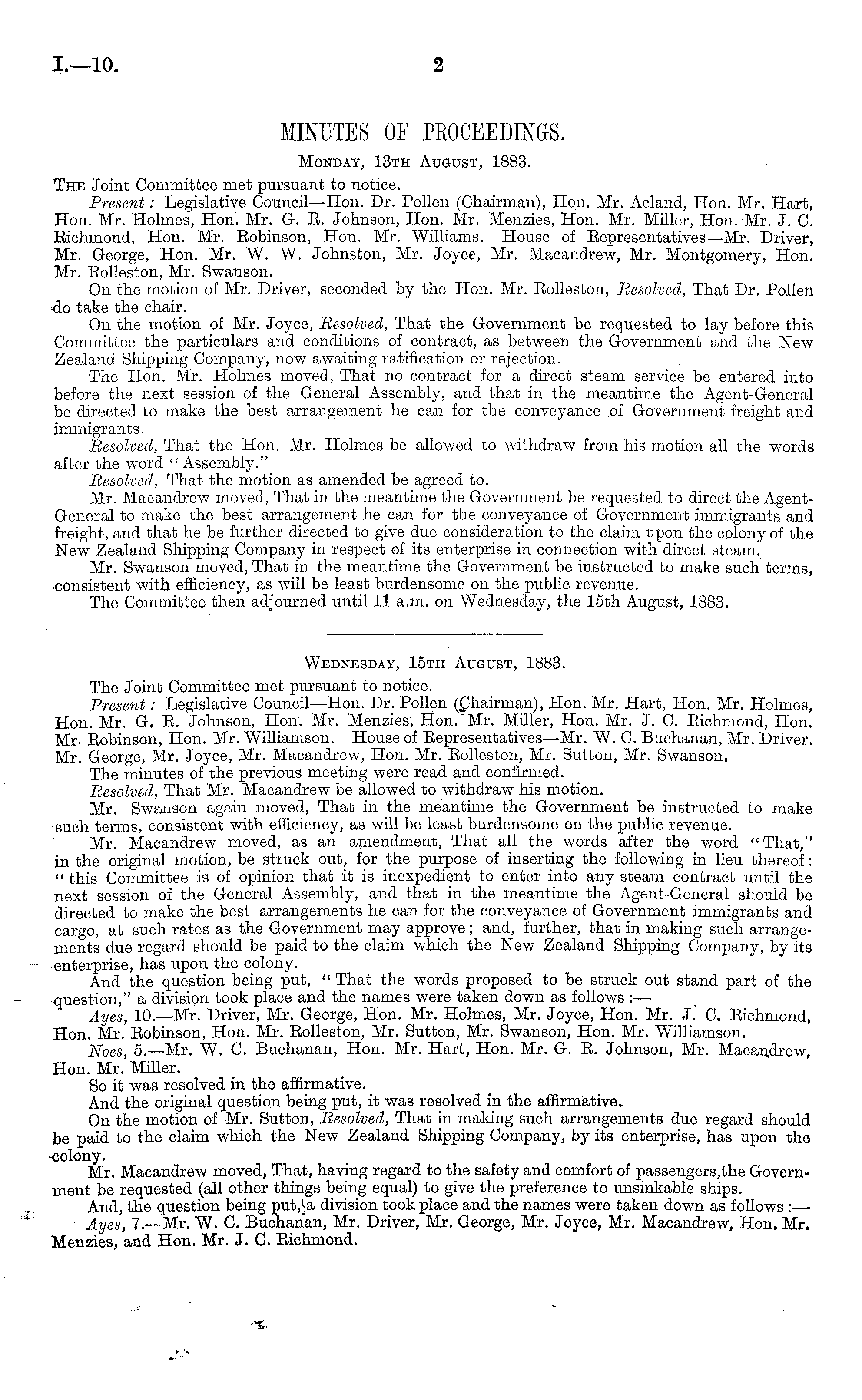 MINUTES OF PROCEEDINGS. Monday, 13th August, 1883. The Joint Committee met pursuant to notice. Present: Legislative Council —Hon. Dr. Pollen (Chairman), Hon. Mr. Acland, Hon. Mr. Hart, Hon. Mr. Holmes, Hon. Mr. G. E. Johnson, Hon. Mr. Menzies, Hon. Mr. Miller, Hon. Mr. J. C. Eichmond, Hon. Mr. Eobinson, Hon. Mr. Williams. House of Eepresentatives—Mr. Driver, Mr. George, Hon. Mr. W. W. Johnston, Mr. Joyce, Mr. Macandrew, Mr. Montgomery, Hon. Mr. Eolleston, Mr. Swanson. On the motion of Mr. Driver, seconded by the Hon. Mr. Eolleston, Besolved, That Dr. Pollen ■do take the chair. On the motion of Mr. Joyce, Besolved, That the Government be requested to lay before this Committee the particulars and conditions of contract, as between the Government and the New Zealand Shipping Company, now awaiting ratification or rejection. The Hon. Mr. Holmes moved, That no contract for a direct steam service be entered into before the next session of the General Assembly, and that in the meantime the Agent-General be directed to make the best arrangement he can for the conveyance of Government freight and immigrants. Besolved, That the Hon. Mr. Holmes be allowed to withdraw from his motion all the words after the word " Assembly." Besolved, That the motion as amended be agreed to. Mr. Macandrew moved, That in the meantime the Government be requested to direct the AgentGeneral to make the best arrangement he can for the conveyance of Government immigrants and freight, and that he be further directed to give due consideration to the claim upon the colony of the New Zealand Shipping Company in respect of its enterprise in connection with direct steam. Mr. Swanson moved, That in the meantime the Government be instructed to make such terms, •consistent with efficiency, as will be least burdensome on the public revenue. The Committee then adjourned until 11 a.m. on Wednesday, the 15th August, 1883.