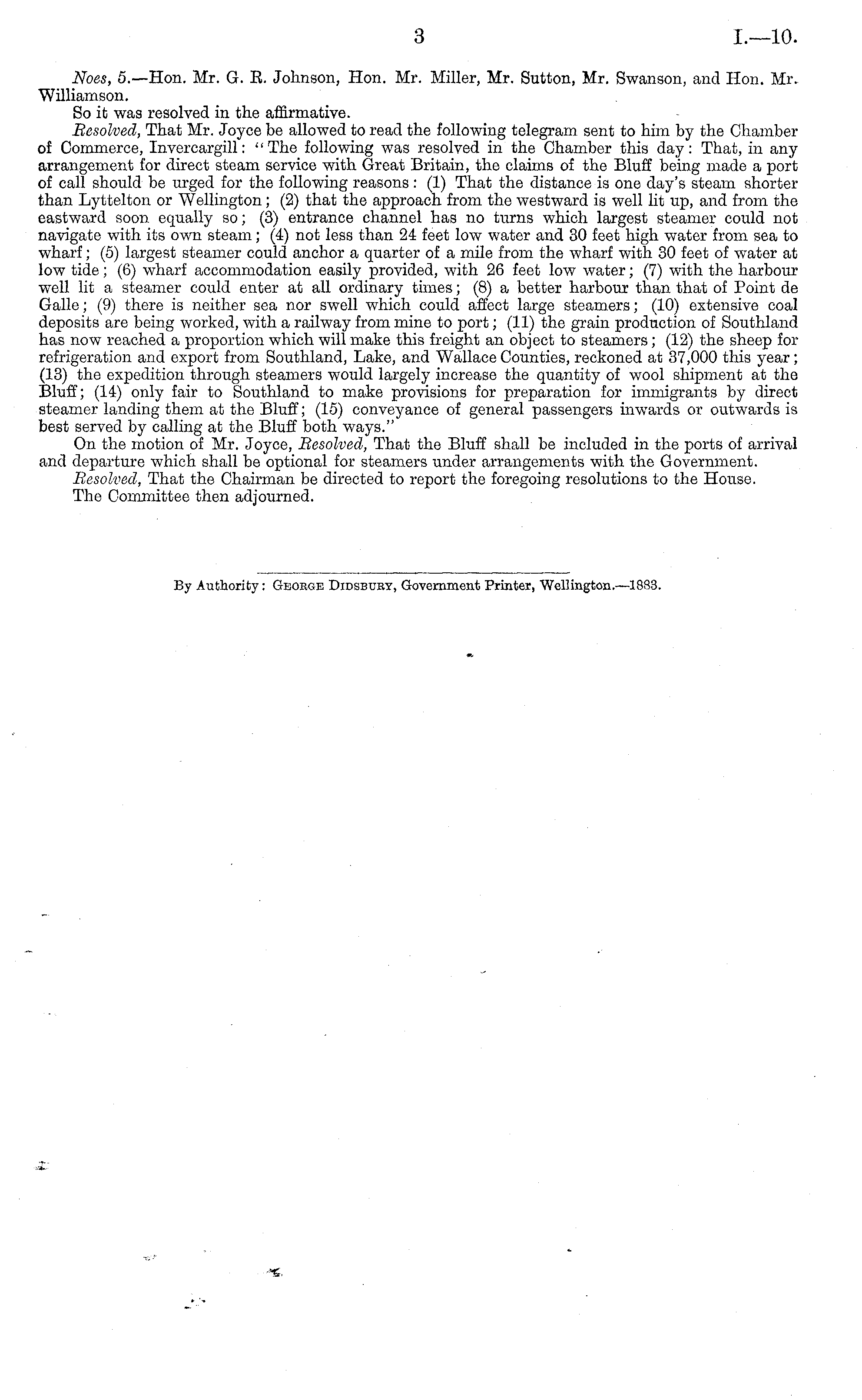 Noes, 5. —Hon. Mr. G. E. Johnson, Hon. Mr. Miller, Mr. Sutton, Mr. Swanson, and Hon. Mr. Williamson. So it was resolved in the affirmative. Resolved, That Mr. Joyce be allowed to read the following telegram sent to him by the Chamber of Commerce, Invercargill: "The following was resolved in the Chamber this day: That, in any arrangement for direct steam service with Great Britain, the claims of the Bluff being made a port of call should be urged for the following reasons : (1) That the distance is one day's steam shorter than Lyttelton or Wellington; (2) that the approach from the westward is well lit up, and from the eastward soon equally so; (3) entrance channel has no turns which largest steamer could not navigate with its own steam; (4) not less than 24 feet low water and 30 feet high water from sea to wharf; (5) largest steamer could anchor a quarter of a mile from the wharf with 30 feet of water at low tide; (6) wharf accommodation easily provided, with 26 feet low water; (7) with the harbour well lit a steamer could enter at all ordinary times; (8) a better harbour than that of Point de Galle; (9) there is neither sea nor swell which could affect large steamers; (10) extensive coal deposits are being worked, with a railway from mine to port; (11) the grain production of Southland has now reached a proportion which will make this freight an object to steamers; (12) the sheep for refrigeration and export from Southland, Lake, and Wallace Counties, reckoned at 37,000 this year; (13) the expedition through steamers would largely increase the quantity of wool shipment at the Bluff; (14) only fair to Southland to make provisions for preparation for immigrants by direct steamer landing them at the Bluff; (15) conveyance of general passengers inwards or outwards is best served by calling at the Bluff both ways." On the motion of Mr. Joyce, Resolved, That the Bluff shall be included in the ports of arrival and departure which shall be optional for steamers under arrangements with the Government. Resolved, That the Chairman be directed to report the foregoing resolutions to the House. The Committee then adjourned.