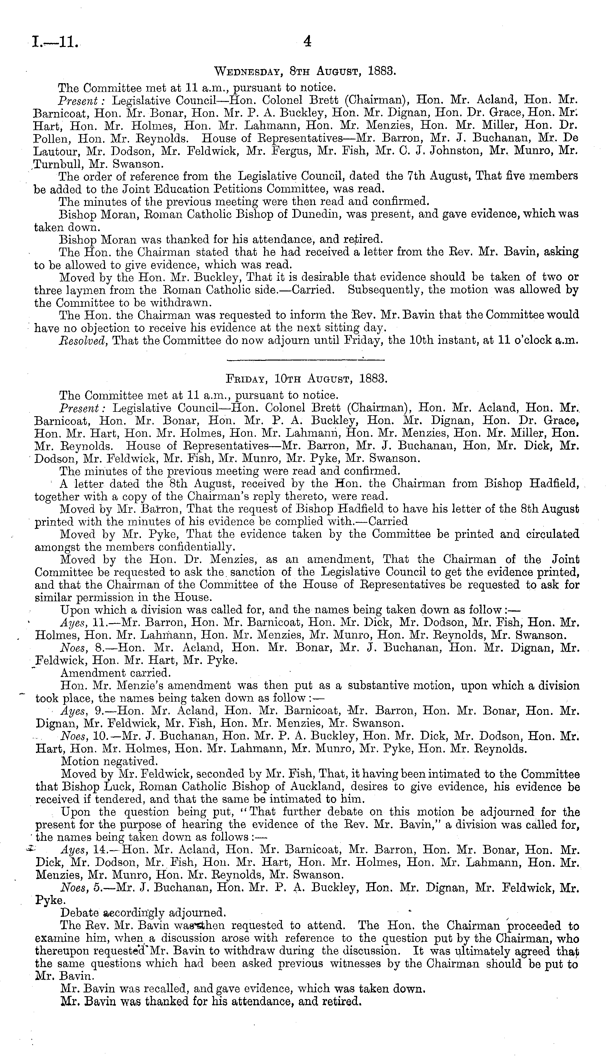 Friday, 10th August, 1883. The Committee met at 11 a.m., pursuant to notice. Present: Legislative Council—Hon. Colonel Brett (Chairman), Hon. Mr. Acland, Hon. Mr. Barnicoat, Hon. Mr. Bonar, Hon. Mr. P. A. Buckley, Hon. Mr. Dignan, Hon. Dr. Grace, Hon. Mr. Hart, Hon. Mr. Holmes, Hon. Mr. Lahmann, Hon. Mr. Menzies, Hon. Mr. Miller, Hon. Mr. Eeynolds. House of Eepresentatives—Mr. Barron, Mr. J. Buchanan, Hon. Mr. Dick, Mr. Dodson, Mr. Peldwick, Mr. Fish, Mr. Munro, Mr. Pyke, Mr. Swanson. The minutes of the previous meeting were read and confirmed. A letter dated the Bth August, received by the Hon. the Chairman from Bishop Hadfield, together with a copy of the Chairman's reply thereto, were read. Moved by Mr. Barron, That the request of Bishop Hadfield to have his letter of the Bth August printed with the minutes of his evidence be complied with.—Carried Moved by Mr. Pyke, That the evidence taken by the Committee be printed and circulated amongst the members confidentially. Moved by the Hon. Dr. Menzies, as an amendment, That the Chairman of the Joint Committee be requested to ask the. sanction of the Legislative Council to get the evidence printed, and that the Chairman of the Committee of the House of Eepresentatives be requested to ask for similar permission in the House. Upon which a division was called for, and the names being taken down as follow :— Ayes, 11.—Mr. Barron, Hon. Mr. Barnicoat, Hon. Mr. Dick, Mr. Dodson, Mr. Fish, Hon. Mr. Holmes, Hon. Mr. Lahmann, Hon. Mr. Menzies, Mr. Munro, Hon. Mr. Eeynolds, Mr. Swanson. Noes, 8. —Hon. Mr. Acland, Hon. Mr. Bonar, Mr. J. Buchanan, Hon. Mr. Dignan, Mr. Feldwick, Hon. Mr. Hart, Mr. Pyke. Amendment carried. Hon. Mr. Menzie's amendment was then put as a substantive motion, upon which a division took place, the names being taken down as follow: — Ayes, 9. —Hon. Mr. Acland, Hon. Mr. Barnicoat, Mr. Barron, Hon. Mr. Bonar, Hon. Mr. Dignan, Mr. Feldwick, Mr. Fish, Hon. Mr. Menzies, Mr. Swanson. Noes, 10.—Mr. J. Buchanan, Hon. Mr. P. A. Buckley, Hon. Mr. Dick, Mr. Dodson, Hon. Mr. Hart, Hon. Mr. Holmes, Hon. Mr. Lahmann, Mr. Munro, Mr. Pyke, Hon. Mr. Eeynolds. Motion negatived. Moved by Mr. Feldwick, seconded by Mr. Fish, That, it having been intimated to the Committee that Bishop Luck, Eoman Catholic Bishop of Auckland, desires to give evidence, his evidence be received if tendered, and that the same be intimated to him. Upon the question being put, "That further debate on this motion be adjourned for the present for the purpose of hearing the evidence of the Eev. Mr. Bavin," a division was called for, ' the names being taken down as follows : — Ayes, 14.—Hon. Mr. Acland, Hon. Mr. Barnicoat, Mr. Barron, Hon. Mr. Bonar, Hon. Mr. Dick, Mr. Dodson, Mr. Fish, Hon. Mr. Hart, Hon. Mr. Holmes, Hon. Mr. Lahmann, Hon. Mr. Menzies, Mr. Munro, Hon. Mr. Eeynolds, Mr. Swanson. Noes, s.—Mr. J. Buchanan, Hon. Mr. P. A. Buckley, Hon. Mr. Dignan, Mr. Feldwick, Mr. Pyke. Debate accordingly adjourned. The Eev. Mr. Bavin was-sthen requested to attend. The Hon. the Chairman proceeded to examine him, when a discussion arose with reference to the question put by the Chairman, who thereupon requested"Mr. Bavin to withdraw during the discussion. It was ultimately agreed that the same questions which had been asked previous witnesses by the Chairma.n should be put to Mr. Bavin. Mr. Bavin was recalled, and gave evidence, which was taken down. Mr. Bavin was thanked for his attendance, and retired.