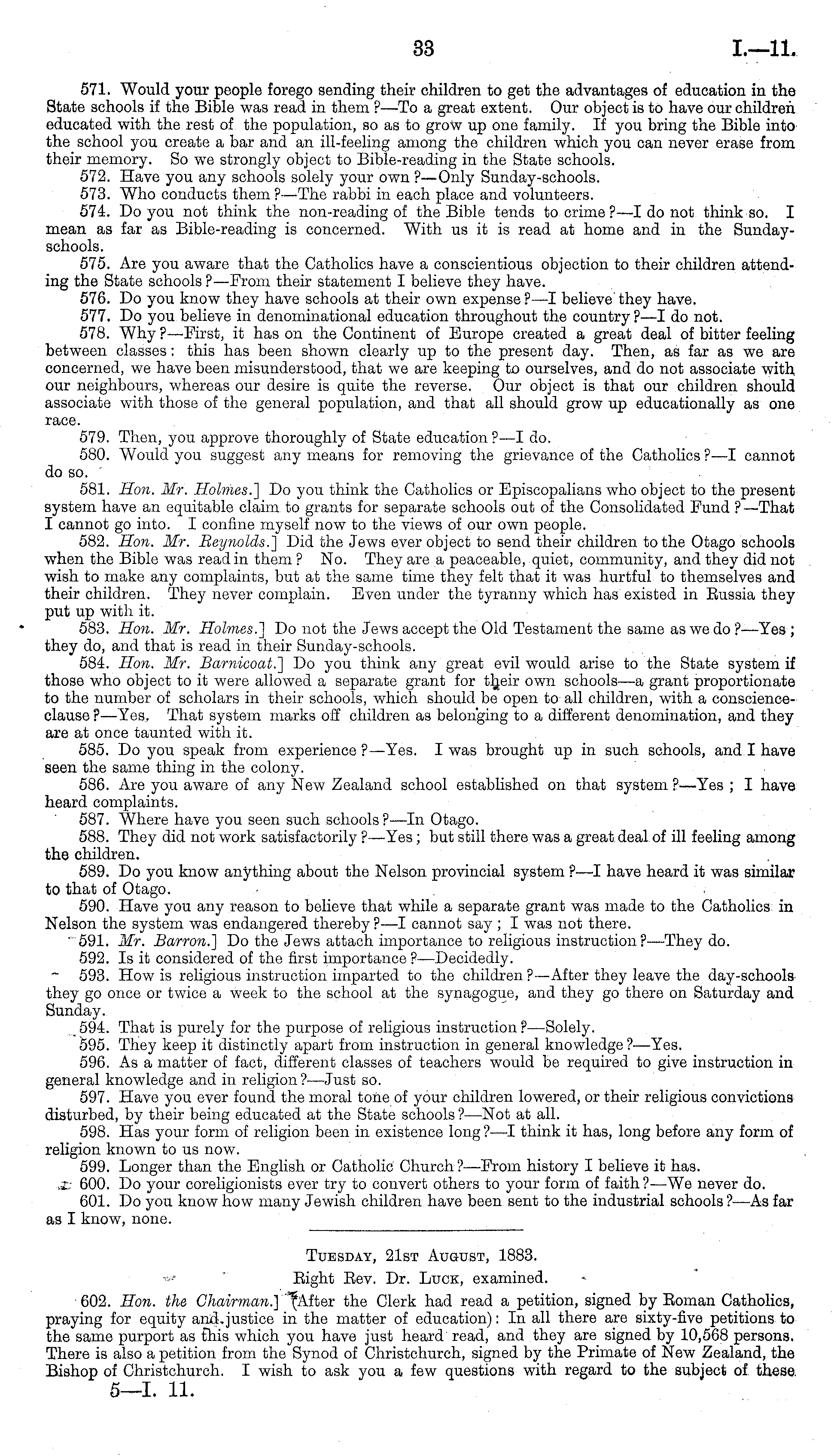 Tuesday, 21st August, 1883. Eight Eev. Dr. Luck, examined. 602. Hon. the Chairman.] '"^After the Clerk had read a petition, signed by Boman Catholics, praying for equity and, justice in the matter of education): In all there are sixty-five petitions to the same purport as this which you have just heard read, and they are signed by 10,568 persons. There is also a petition from the Synod of Christchurch, signed by the Primate of New Zealand, the Bishop of Christchurch. I wish to ask you a few questions with regard to the subject of these. s—l. 11.