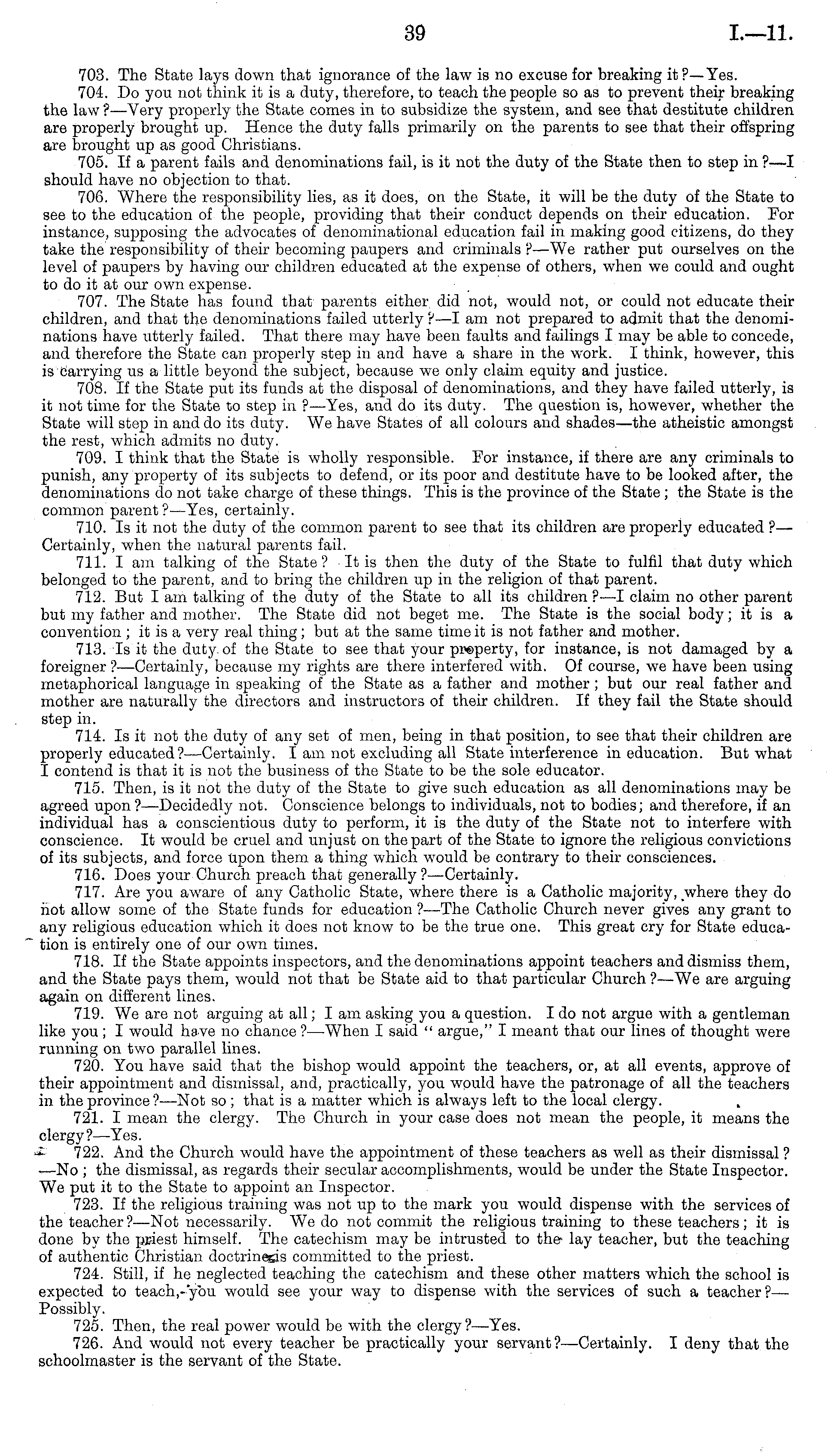 703. The State lays down that ignorance of the law is no excuse for breaking it ?—Yes. 704. Do you not think it is a duty, therefore, to teach the people so as to prevent their breaking the law ? —Very properly the State comes in to subsidize the system, and see that destitute children are properly brought up. Hence the duty falls primarily on the parents to see that their offspring are brought up as good Christians. 705. If a parent fails and denominations fail, is it not the duty of the State then to step in ?—I should have no objection to that. 706. Where the responsibility lies, as it does, on the State, it will be the duty of the State to see to the education of the people, providing that their conduct depends on their education. For instance, supposing the advocates of denominational education fail in making good citizens, do they take the responsibility of their becoming paupers and criminals ? —We rather put ourselves on the level of paupers by having our children educated at the expense of others, when we could and ought to do it at our own expense. 707. The State has found that parents either did not, would not, or could not educate their children, and that the denominations failed utterly ? —I am not prepared to admit that the denominations have utterly failed. That there may have been faults and failings I may be able to concede, and therefore the State can properly step in and have a share in the work. I think, however, this is carrying us a little beyond the subject, because we only claim equity and justice. 708. If the State put its funds at the disposal of denominations, and they have failed utterly, is it not time for the State to step in ? —Yes, and do its duty. The question is, however, whether the State will step in and do its duty. We have States of all colours and shades—the atheistic amongst the rest, which admits no duty. 709. I think that the State is wholly responsible. For instance, if there are any criminals to punish, any property of its subjects to defend, or its poor and destitute have to be looked after, the denominations do not take charge of these things. This is the province of the State; the State is the common parent ? —Yes, certainly. 710. Is it not the duty of the common parent to see that its children are properly educated ? — Certainly, when the natural parents fail. 711. I am talking of the State ? It is then the duty of the State to fulfil that duty which belonged to the parent, and to bring the children up in the religion of that parent. 712. But lam talking of the duty of the State to all its children ?—I claim no other parent but my father and mother. The State did not beget me. The State is the social body; it is a convention ; it is a very real thing; but at the same time it is not father and mother. 713. Is it the duty- of the State to see that your property, for instance, is not damaged by a foreigner ? —Certainly, because my rights are there interfered with. Of course, we have been using metaphorical language in speaking of the State as a father and mother; but our real father and mother are naturally the directors and instructors of their children. If they fail the State should step in. 714. Is it not the duty of any set of men, being in that position, to see that their children are properly educated?—Certainly. lam not excluding all State interference in education. But what I contend is that it is not the business of the State to be the sole educator. 715. Then, is it not the duty of the State to give such education as all denominations may be agreed upon ?—Decidedly not. Conscience belongs to individuals, not to bodies; and therefore, if an individual has a conscientious duty to perform, it is the duty of the State not to interfere with conscience. It would be cruel and unjust on the part of the State to ignore the religious convictions of its subjects, and force upon them a thing which would be contrary to their consciences. 716. Does your Church preach that generally ?—Certainly. 717. Are you aware of any Catholic State, where there is a Catholic majority, where they do hot allow some of the State funds for education ?—The Catholic Church never gives any grant to any religious education which it does not know to be the true one. This great cry for State education is entirely one of our own times. 718. If the State appoints inspectors, and the denominations appoint teachers and dismiss them, and the State pays them, would not that be State aid to that particular Church ? —We are arguing again on different lines. 719. We are not arguing at all; lam asking you a question. Ido not argue with a gentleman like you; I would have no chance ?—When I said " argue," I meant that our lines of thought were running on two parallel lines. 720. You have said that the bishop would appoint the teachers, or, at all events, approve of their appointment and dismissal, and, practically, you would have the patronage of all the teachers in the province ? —Not so ; that is a matter which is always left to the local clergy. 721. I mean the clergy. The Church in your case does not mean the people, it means the clergy? —Yes. 722. And the Church would have the appointment of these teachers as well as their dismissal ? —No ; the dismissal, as regards their secular accomplishments, would be under the State Inspector. We put it to the State to appoint an Inspector. 723. If the religious training was not up to the mark you would dispense with the services of the teacher ?—Not necessarily. We do not commit the religious training to these teachers; it is done by the priest himself. The catechism may be intrusted to the lay teacher, but the teaching of authentic Christian doctrinesis committed to the priest. 724. Still, if he neglected teaching the catechism and these other matters which the school is expected to teach,-"you would see your way to dispense with the services of such a teacher ? — Possibly. 725. Then, the real 