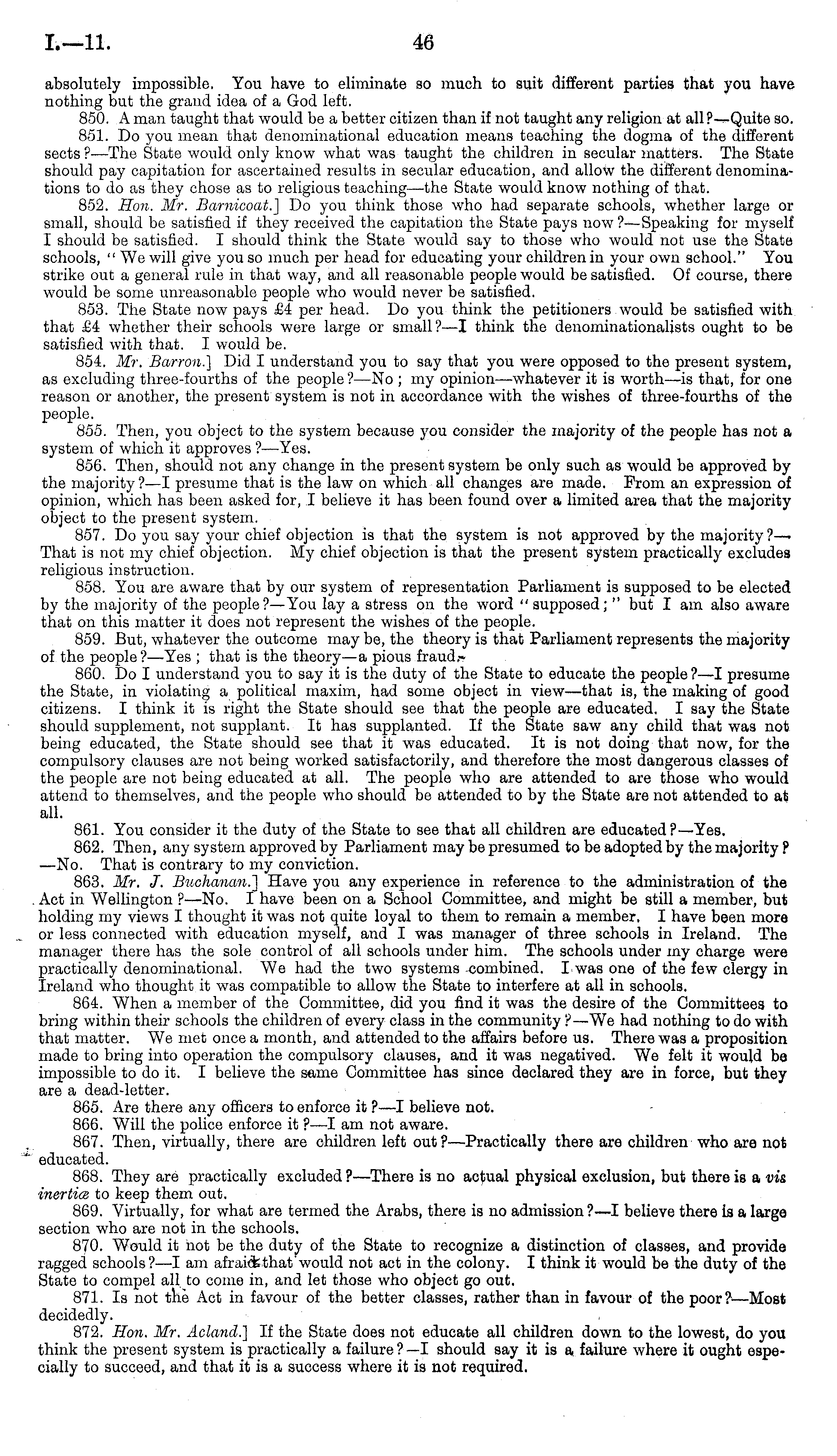 absolutely impossible. You have to eliminate so much to suit different parties that you have nothing but the grand idea of a God left. 850. A man taught that would be a better citizen than if not taught any religion at all ?—Quite so. 851. Do you mean that denominational education means teaching the dogma of the different sects ? —The State would only know what was taught the children in secular matters. The State should pay capitation for ascertained results in secular education, and allow the different denominations to do as they chose as to religious teaching—the State would know nothing of that. 852. Hon. Mr. Barnicoat.] Do you think those who had separate schools, whether large or small, should be satisfied if they received the capitation the State pays now ?—Speaking for myself I should be satisfied. I should think the State would say to those who would not use the State schools, "We will give you so much per head for educating your children in your own school." You strike out a general rule in that way, and all reasonable people would be satisfied. Of course, there would be some unreasonable people who would never be satisfied. 853. The State now pays £4 per head. Do you think the petitioners would be satisfied with that £4 whether their schools were large or small?—l think the denominationalists ought to be satisfied with that. I would be. 854. Mr. Barron.] Did I understand you to say that you were opposed to the present system, as excluding three-fourths of the people ?—No ; my opinion—-whatever it is worth—is that, for one reason or another, the present system is not in accordance with the wishes of three-fourths of the people. 855. Then, you object to the system because you consider the majority of the people has not a system of which it approves ?—Yes. 856. Then, should not any change in the present system be only such as would be approved by the majority ?—I presume that is the law on which all changes are made. Prom an expression of opinion, which has been asked for, I believe it has been found over a limited area that the majority object to the present system. 857. Do you say your chief objection is that the system is not approved by the majority?—• That is not my chief objection. My chief objection is that the present system practically excludes religious instruction. 858. You are aware that by our system of representation Parliament is supposed to be elected by the majority of the people?—You lay a stress on the word " supposed; " but I am also aware that on this matter it does not represent the wishes of the people. 859. But, whatever the outcome may be, the theory is that Parliament represents the majority of the people?—Yes ; that is the theory—a pious fraud.--860. Do I understand you to say it is the duty of the State to educate the people ?—I presume the State, in violating a political maxim, had some object in view—that is, the making of good citizens. I think it is right the State should see that the people are educated. I say the State should supplement, not supplant. It has supplanted. If the State saw any child that was not being educated, the State should see that it was educated. It is not doing that now, for the compulsory clauses are not being worked satisfactorily, and therefore the most dangerous classes of the people are not being educated at all. The people who are attended to are those who would attend to themselves, and the people who should be attended to by the State are not attended to at all. 861. You consider it the duty of the State to see that all children are educated?—Yes. 862. Then, any system approved by Parliament may be presumed to be adopted by the majority P —No. That is contrary to my conviction. 863. Mr. J. Buchanan.'] Have you any experience in reference to the administration of the . Act in Wellington ?—No. I have been on a School Committee, and might be still a member, but holding my views I thought it was not quite loyal to them to remain a member. I have been more or less connected with education myself, and I was manager of three schools in Ireland. The manager there has the sole control of all schools under him. The schools under my charge were practically denominational. We had the two systems combined. I was one of the few clergy in Ireland who thought it was compatible to allow the State to interfere at all in schools. 864. When a member of the Committee, did you find it was the desire of the Committees to bring within their schools the children of every class in the community ?—We had nothing to do with that matter. We met once a month, and attended to the affairs before us. There was a proposition made to bring into operation the compulsory clauses, and it was negatived. We felt it would ba impossible to do it. I believe the same Committee has since declared they are in force, but they are a dead-letter. 865. Are there any officers to enforce it ?—I believe not. 866. Will the police enforce it ?—I am not aware. 867. Then, virtually, there are children left out? —Practically there are children who are not educated. 868. They are practically excluded ?—There is no actual physical exclusion, but there is a vis inertia to keep them out. 869. Virtually, for what are termed the Arabs, there is no admission?—l believe there is a large section who are not in the schools. 870. Would it not be the duty of the State to recognize a distinction of classes, and provide ragged schools? —I am afraicbthat would not act in the colony. I think it would be the duty of the State to compel all to come in, and let those who object go out. 871. Is not the Act in favour of the better classes, rather than in favour of the poor?—Most decidedly. 872. Hon. Mr. Acland.] If the State does not educate all children down to the lowest, do you think the present system is practically a failure ?—I should say it is a failure where it ought especially to succeed, and that it is a success where it is n