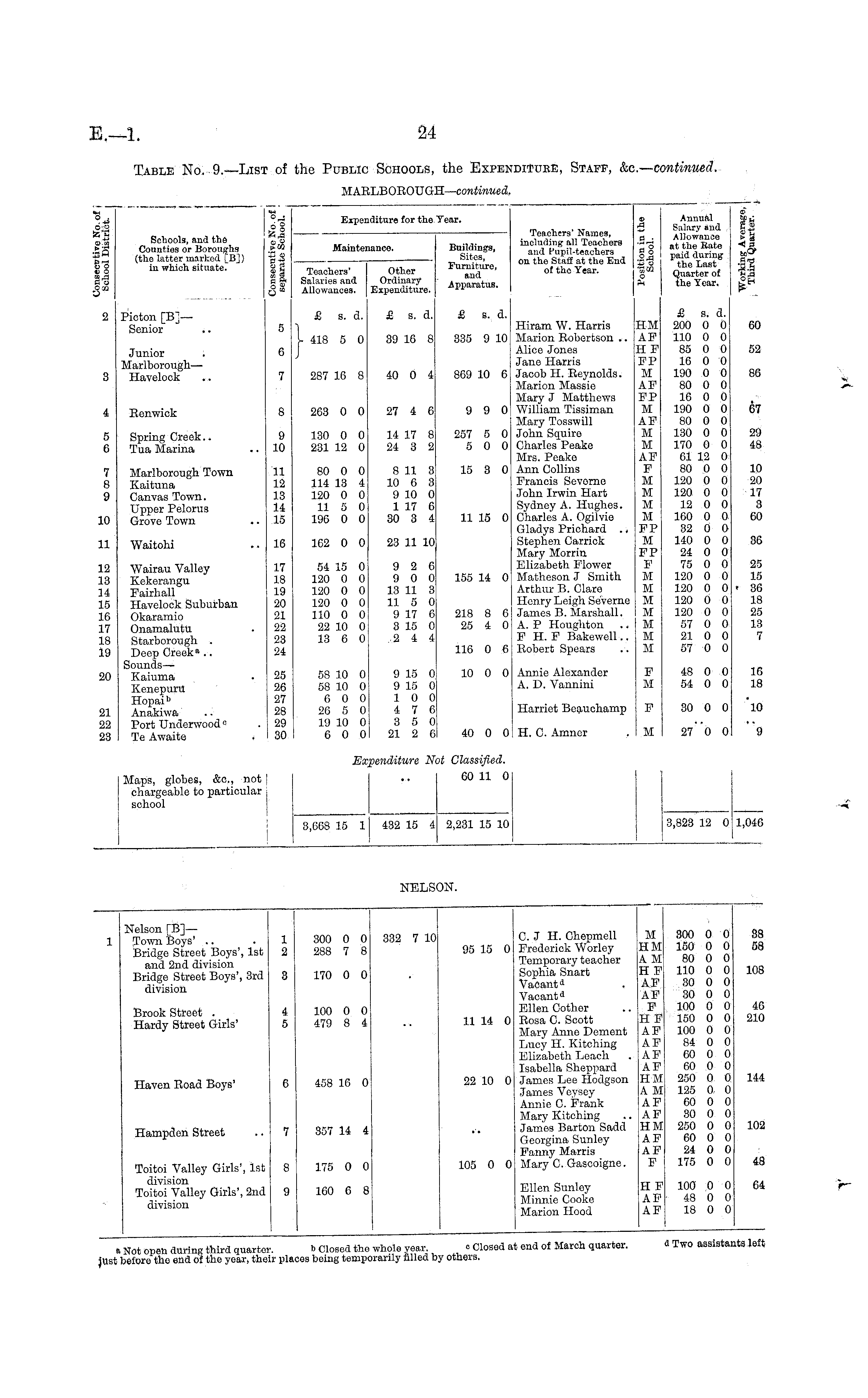 O . . -u 0 o tafi a _ £3 go 1 0 £ ° C JJ Schools, and the Counties or Boroughs (the latter marked [Bj) in which situate. °_ y A A '.. . a _ 6" Maintenance. Expenditure for the Year. Buildings, Sites, Eurniture, and Apparatus. Teachers' Names, including all Teachers and Pupil-teachers on the Staff at the End of the Year. o v Annual •$ . Salary and g. a - Allowance > & '2o at the Bate ■< a o 8 paid during t£f £j | the Last •§'§ % m Quarter of "H. _ the Year. gt* Teachers' Salaries and Allowances, j Other Ordinary Expenditure. Picton [B]— Senior 5 £ s. d. £ s. d. £ s. d. Hiram W. Harris Marion Robertson .. Alice Jones Jane Harris Jacob H. Reynolds. Marion Massie Mary J Matthews William Tissiman Mary Tosswill John Squire Charles Peake Mrs. Peake Ann Collins Francis Sevorne John Irwin Hart Sydney A. Hughes. Charles A. Ogilvie Gladys Prichard .. Stephen Carrick Mary Morrin Elizabeth Flower Matheson J Smith Arthur B. Clare Henry Leigh Severne James B. Marshall. A. P Houghton P H. F Bakewell.. Robert Spears £ s. d. HM 200 0 0 60 AP 110 0 0 HP 85 0 0 52 PP 16 0 0 M 190 0 0 86 AP 80 0 0 FP 16 0 0 M 190 0 0 67 AF 80 0 0 M 130 0 0 29 M 170 0 0 48 AF 61 12 0 F 80 0 0 10 M 120 0 0 20 M 120 0 0 17 M 12 0 0 3 M 160 0 0 60 FP 32 0 0 M 140 0 0 36 FP 24 0 0 F 75 0 0 25 M 120 0 0 15 M 120 0 0 36 M 120 0 0 18 M 120 0 0 25 M 57 0 0 13 M 21 0 0 7 M 57 0 0 4 5 6 7 8 9 Junior Marlborough— Havelock Renwick Spring Creek.. Tua Marina Marlborough Town Kaituna Canvas Town. Upper Pelorus Grove Town 6 7 8 9 10 11 12 13 14 15 5 6 7 8 9 10 11 12 13 14 15 L 418 5 0 287 16 8 263 0 0 130 0 0 231 12 0 80 0 0 114 13 4 120 0 0 11 5 0 196 0 0 39 16 8 40 0 4 27 4 6 14 17 8 24 3 2 8 11 3 10 6 3 9 10 0 1 17 6 30 3 4 335 9 10 869 10 6 9 9 0 257 5 0 5 0 0 15 3 0 HM AP H P PP M AP FP M AF M M AF F M M M M FP M FP P M M M M M M M 10 11 15 0 11 Waitohi 16 16 162 0 0 23 11 10 12 13 14 15 16 17 18 19 Wairau Valley Kekerangu Fairhall Havelock Suburban Okaramio Onamalutu Starborough . Deep Creek" .. Sounds— Kaiuma Kenepuru Hopai b Anakiwa Port Underwood c Te Awaite 17 18 19 20 21 22 23 24 25 26 27 28 29 30 17 18 19 20 21 23 23 24 54 15 0 120 0 0 120 0 0 120 0 0 110 0 0 22 10 0 13 6 0 9 2 6 9 0 0 13 11 3 11 5 0 9 17 6 3 15 0 2 4 4 155 14 0 218 8 6 25 4 0 116 0 6 20 25 26 27 28 29 30 58 10 0 58 10 0 6 0 0 20 5 0 19 10 0 6 0 0 9 15 0 9 15 0 10 0 4 7 6 3 5 0 21 2 6 10 0 0 Annie Alexander A. D. Vannini Harriot Boauchamp F 48 0 0 16 M 54 0 0 18 F M F 30 0 0 "lO F 16 18 'lO 21 22 23 40 0 0 H. C. Amner M . 0 0 9 M "9 Maps, globes, &c, not chargeable to particular school Ex] penditure Nc ot Classified. | 60 11 0 I •■ I 3,668 15 l| 432 15 4 3,823 12 0 i 11,046 2,231 15 10 NELS' )N. Nelson [B]— Town Boys' .. Bridge Street Boys', 1st and 2nd division Bridge Street Boys', 3rd division Brook Street . Hardy Street Girls' 1 2 8 4 5 300 0 0 288 7 8 170 0 0 100 0 0 479 8 4 332 7 10 95 15 0 11 14 0 C. J H. Chepmell Frederick Worley Temporary teacher Sophia Snart Vacant" 1 Vacant a Ellen Cother Rosa C. Scott Mary Anne Dement Lucy H. Kitching Elizabeth Leach Isabella Sheppard James Lee Hodgson James Veysey Annie C. Frank Mary Kitching James Barton Sadd Georgina Sunley Fanny Marris Mary C. Gaseoigne. M HM A M HF AP AF F H F AF AF AF AF HM A M AF AF HM AF AF F 800 0 0 150 0 0 80 0 0 110 0 0 30 0 0 30 0 0 100 0 0 150 0 0 100 0 0 84 0 0 60 0 0 60 0 0 250 0 0 125 0 0 60 0 0 30 0 0 250 0 0 60 0 0 24 0 0 175 0 0 38 68 108 46 210 Haven Road Boys' 458 10 0 22 10 0 14Hampden Street 357 14 4 10! Toitoi Valley Girls', 1st division Toitoi Valley Girls', 2nd division 175 0 0 105 0 0 4! 8 9 160 6 8 Ellen Sunley Minnie Cooke Marion Hood H F AP AF 100 0 0 48 0 0 18 0 0 .