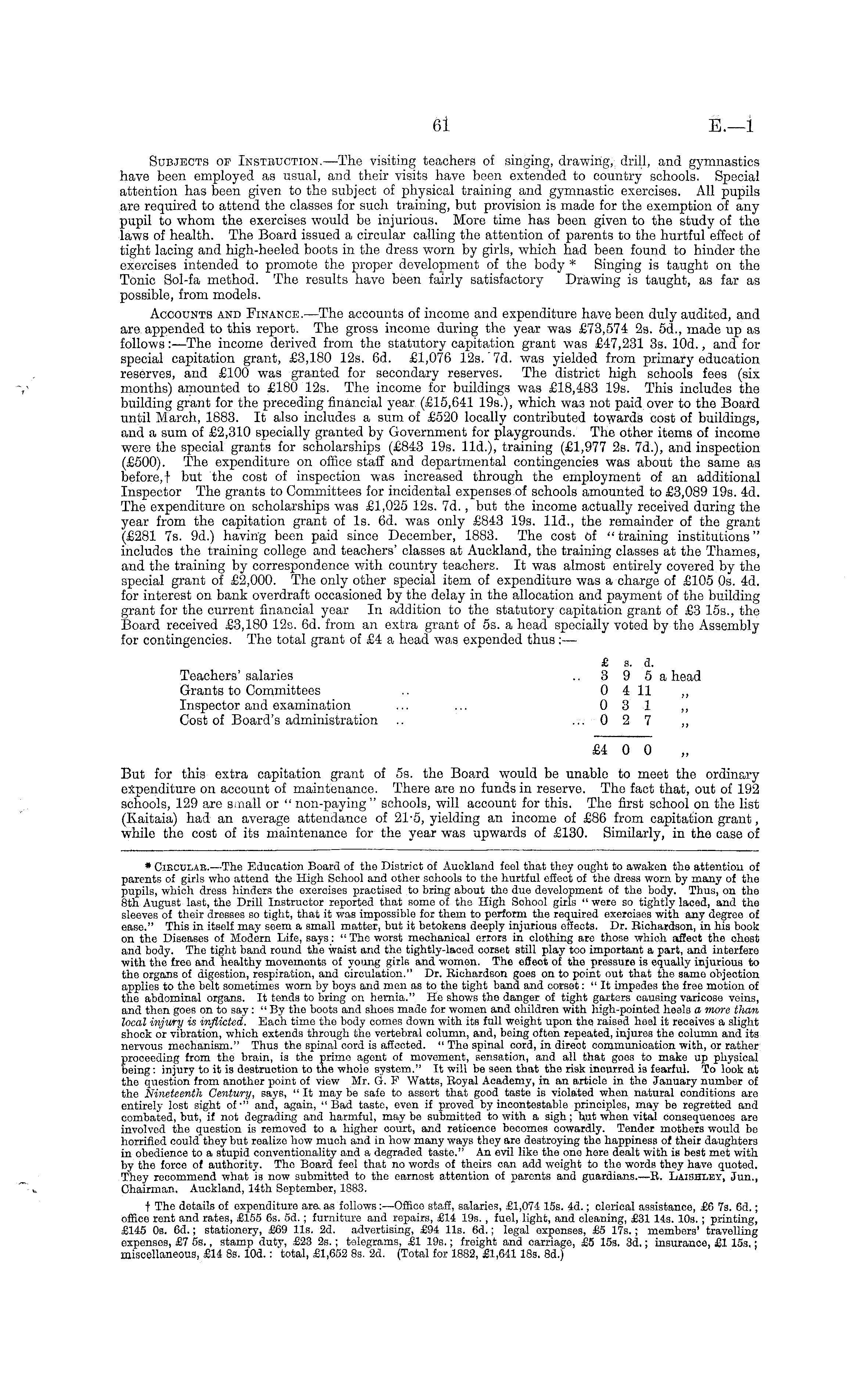 * Circular. —The Education Board of the District of Auckland feel that they ought to awaken the attention of parents of girls who attend the High School and other schools to the hurtful effect of the dross worn by many of the pupils, which dress hinders the exercises practised to bring about the due development of the body. Thus, on the Bth August last, the Drill Instructor reported that some of tho High Sohool girls " were so tightly laced, and the sleeves of their dresses so tight, that it was impossible for them to perform the required exercises with any degree of ease." This in itself may seem a small matter, but it betokens deeply injurious effects. Dr. Richardson, in his book on the Diseases of Modern Life, says: " The worst mechanioal errors in clothing are those which affect tho ohest and body. Tho tight band round the waist and the tightly-laced corset still play too important a part, and interfere with tho free and healthy movements of young girls and women. The effeot of the pressure is equally injurious to the organs of digestion, respiration, and circulation." Dr. Richardson goes on to point out that tho same objection applies to tho belt sometimes worn by boys and men as to the tight band and corset: "It impedes the free motion of the abdominal organs. It tends to bring on hernia." He shows the danger of tight garters causing varicose veins, and then goes on to say: "By the boots and shoes made for women and children with high-pointed heels a more tlian local injury is inflicted. Each time the body comes down with its full weight upon the, raised heel it receives a slight shock or vibration, which extends through the vertebral column, and, being often repeated, injures the column and its nervous mochanism." Thus the spinal cord is affected. " Tho spinal cord, in direot eommunioation with, or rather proceeding from the brain, is the primo agent of movement, sensation, and all that goes to mako up physical being: injury to it is destruction to the whole system." It will be seen that the risk inourred is fearful. To look at the question from another point of view Mr. G. P Watts, Royal Academy, in an article in the January number of the Nineteenth Century, says, " It may be safe to assert that good taste is violated when natural conditions are entirely lost sight of-" and, again, "Bad taste, even if proved by incontestable principles, may be regretted and combated, but, if not degrading and harmful, may be submitted to with a sigh; hut when vital consequenoes are involved tho question is removed to a higher court, and reticence becomes cowardly. Tender mothers would be horrified could they but realize how much and in how many ways they are destroying the happiness of their daughters in obedience to a stupid conventionality and a degradod taste." An evil like the ono hore dealt with is best met with by the force of authority. The Board feel that no words of theirs can add weight to the words they have quoted. They recommend what is now submitted to the earnest attention of parents and guardians.—R. Laishley, Jun., Chairman. Auckland, 14th September, ISB3. t Tho details of expenditure are. as follows: —Office staff, salaries, £1,07-1 15s. 4d.; clerical assistance, £6 7s. 6d.; office rent and rates, £155 6s. sd. ; furniture and repairs, £14 19s. , fuel, light, and cleaning, £31 14s. 10s. ; printing, £145 os. 6d.; stationery, £69 lis. 2d. advertising, £94 lis. 6d.; legal expenses, £5 175.; membors' travelling expensos, £7 55., stamp duty, £23 25.; talegrams, £1 195.; froight and carriage, £5 15s. 3d,; insurance, £1 155,; miscellaneous, £14 Bs. lOd.: 'total, £1,652 Bs. 2d. (Total for 1882, £1,641 18s. Bd.)