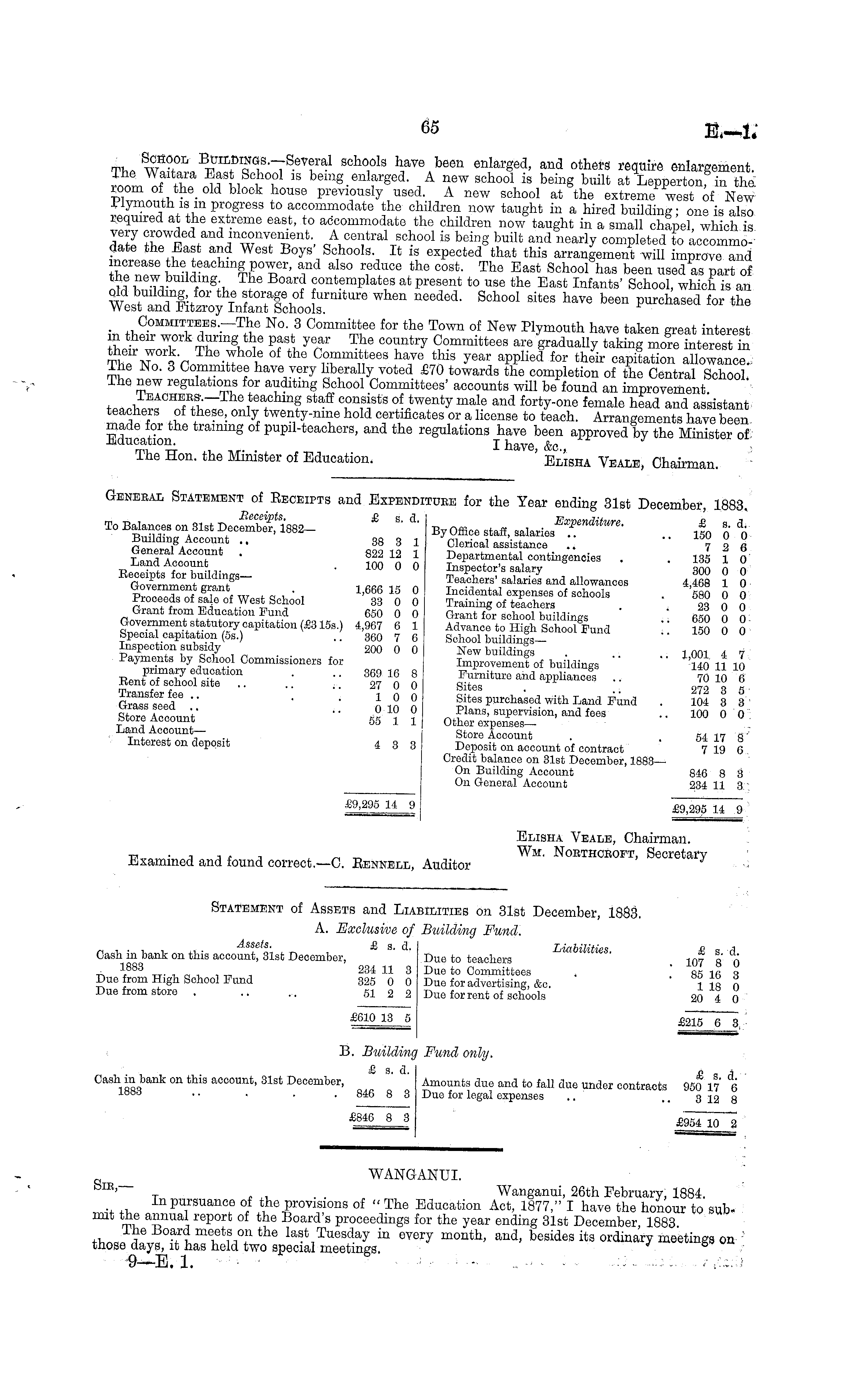 General Statement of Receipts and Expenditure for the Year ending 31st December, 1883. To Balances on 31st DecfmSW- *** By Office staff, salaries*?**- j 0 o" % Building Account .. 38 3 1 Clerical assistance .. ' 72 6 General Account . 822 12 1 Departmental contingencies . 135 l o Land Account . 100 0 0 Inspector's salary 8 300 0 0 , fififi lfi n teachers-salaried and allowance 4,468 1 0 government grant 1,666 15 0 Incidental expenses of schools 580 0 0 Proceeds of sale of West School 33 0 0 Training of teachers ' Grant from Education Fund 650 0 0 Grant for school buildings ' 650 0 0 Government statutory capitation (£3155.) 4,967 6 1 Advance to High School Fund " 150 0 0 Special capitation (55.) .. 360 7 6 School buildings- '" Inspection subsidy 200 0 0 New buildings . 1001 4 7 Payments by School Commissioners for Improvement of buildings " 140 11 10 BjffiSSfflT" .: :: 1? 16 0 8 0 S? to and • • S Grassteed 66 •• ' ' ni2 2 Sites purchased with Land Fund .IM 8 8 Store Iccount' ' - r« ? ? P lsm3 . supervision, and fees .. 100 00 . biore Account 55 1 1 Other expensesLand Account- Store Account . 54 17 8 ' Interest on deposit 4 3 3 Deposit on account of contract 7 19 6 Credit balance on 31st December, 1883— On Building Account 846 8 3 On General Account 234 11 3 Elisha Veale, Chairman. ■p • -, -, . , L „ „ Wm. Northcroft, Secretary litxammed and found correct.—C. Rennele, Auditor