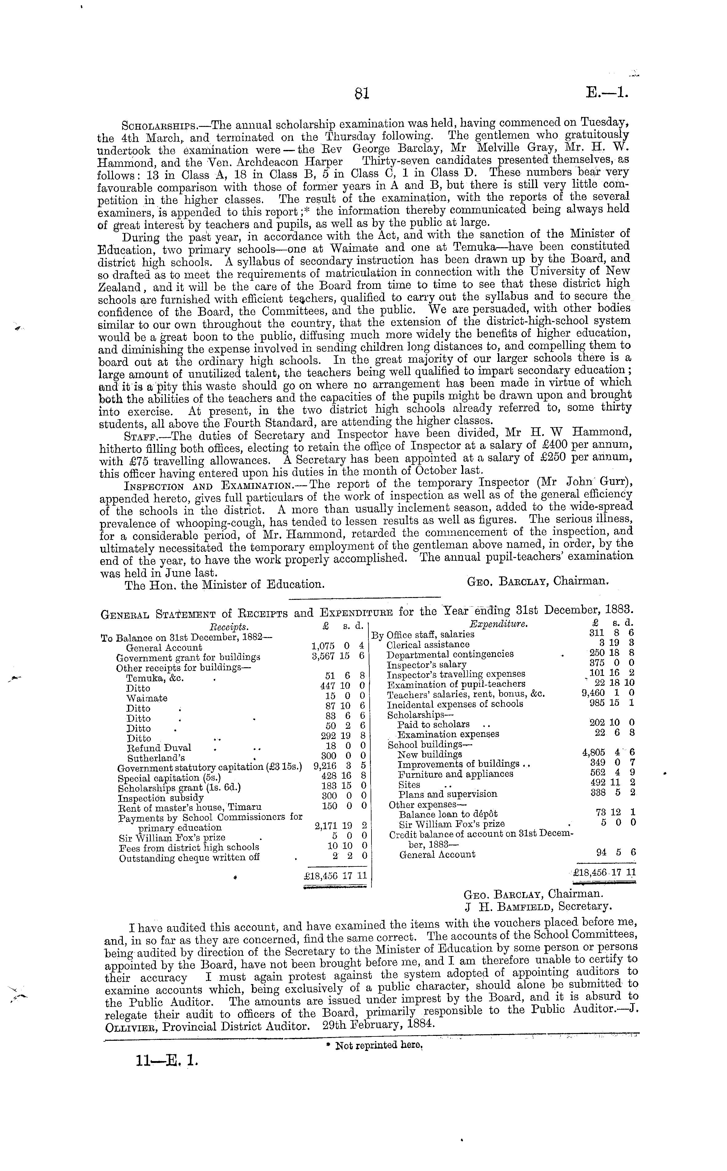 General Statement of Eeceipts and Expenditure for the Year ending 31st December, 1883. Receipts. £ s. d. Expenditure. £ s. d. To Balance on 31st December, 1882— By Office staff .salaries 311 « b General Account 1,075 0 4 Clerical assistance _ 319 S Government grant for buildings 3,567 15 6 Departmental contingencies . 200 18 8 Other receipts for buildings— Inspector's salary 615 0 o Temuka, &c. . 51 6 8 Inspector's travelling expenses x « J Ditto 447 10 0 Examination of pupil-teachers 22 18 10 Wairnate 15 0 0 Teachers'salaries, rent, bonus, &c. 9,460 1 0 Ditto 87 10 6 Incidental expenses of schools y»o lo 1 •nit-tn 83 6 6 Scholarships— Dto . SO 2 6 Baid to scholars .. 202 10 0 Ditto 292 19 8 Examination expenses AA b ti Refund Duval '.' .. 18 0 0 School buildingsSutherland's . 300 0 0 New buildings 4,805 4 b Government statutory capitation (£3155.) 9,216 3 5 Improvements of buildings .. 349 0 7 Special capitation (55.) 428 16 8 Furniture and appliances 562 4 9 Scholarships grant (Is. 6d.) 183 15 0 Sites . .. 492 11 3 Inspection subsidy 300 0 0 Plans and supervision 338 5 2 Bent of master's house, Timaru 150 0 0 Other expensesPayments by School Commissioners for Balance loan to depot 16 ia i primary education 2,17119 2 Sir William Box's prize • o 0 0 Sir William Box's prize . 50 0 Credit balance of account on 31st DecemBeos from district high schools 10 10 0 ber, 1883— Outstanding cheque written off . 22 0 General Account ■» o o £18,456 17 11 £18,456-17 11 Geo. Barclay, Chairman. J H. Bamfield, Secretary. I have audited this account, and have examined the items with the vouchers placed before me, and, in so far as they are concerned, find the same correct. The accounts of the School Committees, being audited by direction of the Secretary to the Minister of Education by some person or persons appointed by the Board, have not been brought before me, and I am therefore unable to certify to their accuracy I must again protest against the system adopted of appointing auditors to examine accounts which, being exclusively of a public character should alone be submitted to the Public Auditor. The amounts are issued under imprest by the Board, and it is absurd to relegate their audit to officers of the Board, primarily responsible to the Public Auditor.—J. Ollivier, Provincial District Auditor. 29th February, 1884.
