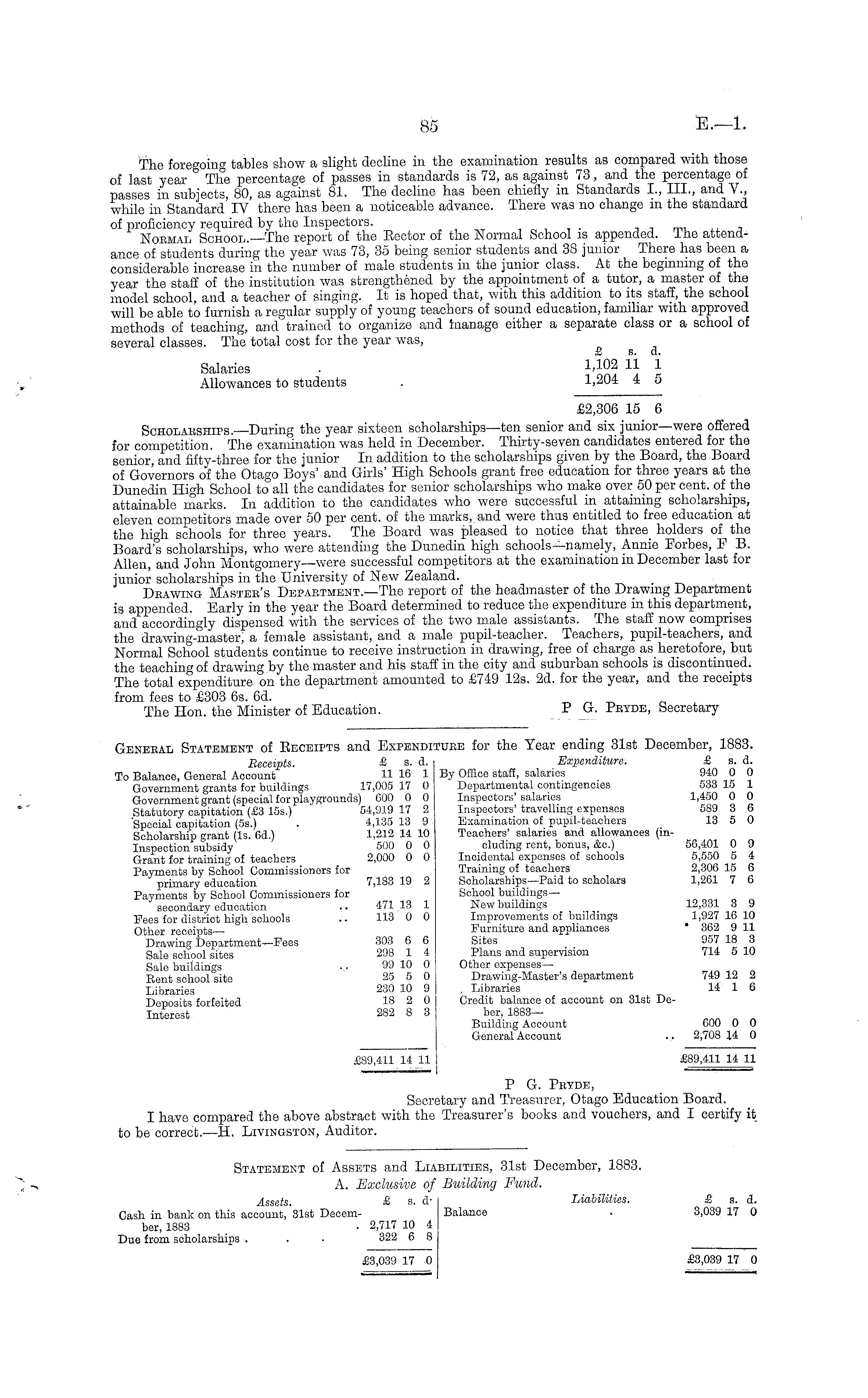 General Statement of Eeceipts and Expenditure for the Year ending 31st December, 1883. Receipts. £ s. d. Expenditure. £ s. d. To Balance, General Account 11 16 1 By Office staff, salaries 940 0 0 Government grants for buildings 17,005 17 0 Departmental contingencies' 533 15 1 Government grant (special for playgrounds) 600 0 0 Inspectors'salaries 1,450 0 0 Statutory capitation (£3 155.) 54,919 17 2 Inspectors' travelling expenses 589 3 6 'Special capitation (55.) . 4,135 13 9 Examination of pupil-teachers 13 5 0 Scholarship grant (Is. 6d.) 1,212 14 10 Teachers' salaries and allowances (mInspection subsidy 500 0 0 eluding rent, bonus, &c.) 56,401 0 9 Grant for training of teachers 2,000 0 0 Incidental expenses of schools 5,550 5 4 Payments by School Commissioners for Training of teachers 2,306 15 6 primary education 7,183 19 2 Scholarships—Paid to scholars 1,261 7 6 Payments by School Commissioners for School buildings— secondary education .. 471 13 1 New buildings 12,331 3 9 Bees for district high schools .. 113 0 0 Improvements of buildings 1,927 16 10 Other receipts Furniture and appliances ' 362 9 11 Drawing Department—Bees 303 6 6 Sites 957 18 3 Sale school sites 298 1 4 Plans and supervision 714 5 10 Sale buildings • • 99 10 0 Other expenses— Bent school site 25 5 0 Drawing-Master's department 749 12 2 Libraries 230 10 9 , Libraries 14 1 6 Deposits forfeited 18 2 0 Credit balance of account on Slst DeInterest 282 8 3 ber, 1883Building Account 600 0 0 General Account .. 2,708 14 0 £89,411 14 11 I £89,411 14 11 P G. Pryde, Secretary and Treasurer, Otago Education Board. I have compared the above abstract with the Treasurer's books and vouchers, and I certify it to be correct. —H. Livingston, Auditor.