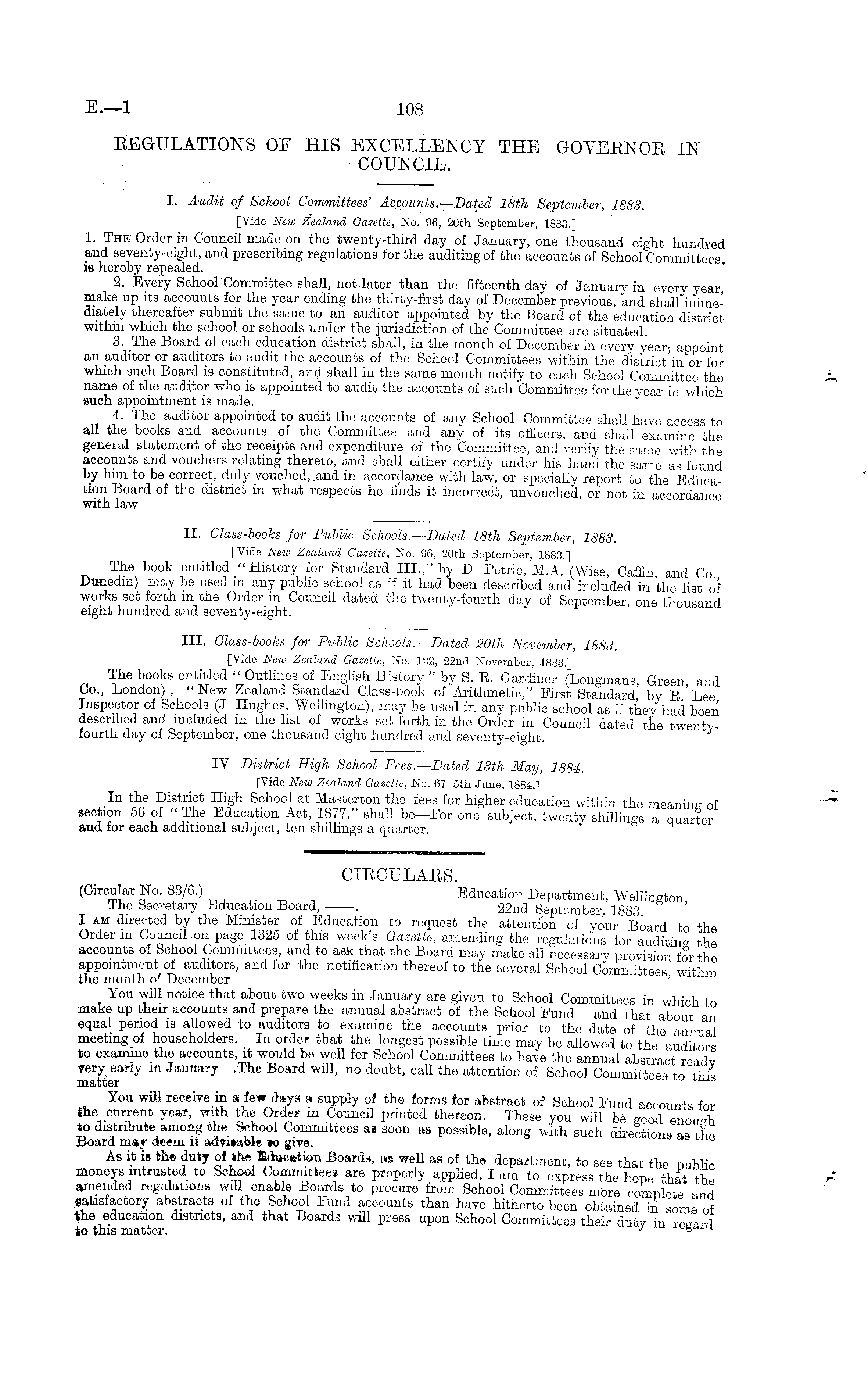 11. Glass-books for Public Schools. — Dated 18th September, 1883. [Vide New Zealand Gazette, No. 96, 20th September, 1883.] The book entitled "History for Standard III.," by D Petrie, M.A. (Wise, Caffin and Co Dunedin) may be used m any public school as if it had been described and included in the list of works set forth m the Order in Council dated the twenty-fourth day of September, one thousand eight hundred and seventy-eight.