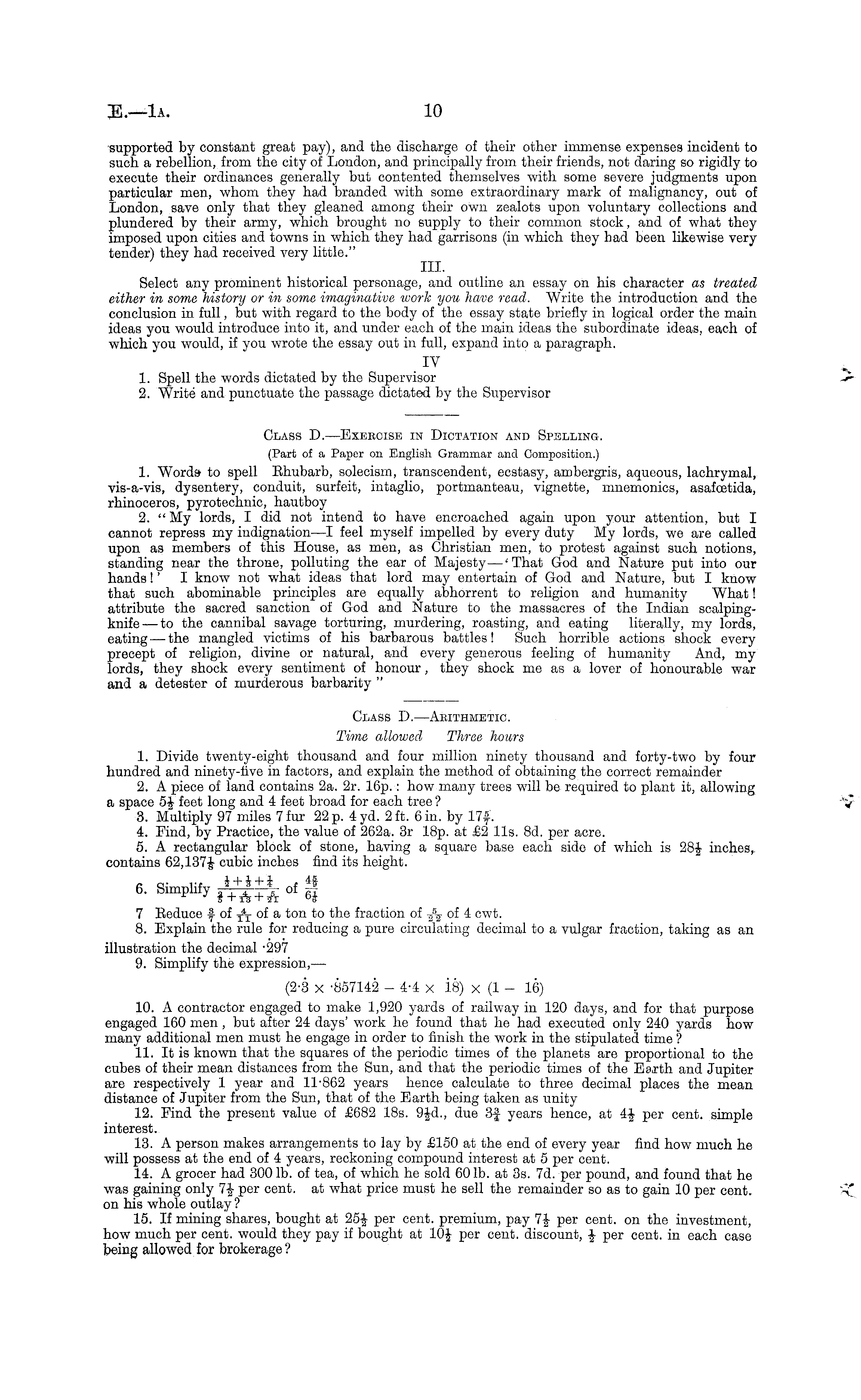 Class D.—Exercise in Dictation and Spelling. (Part of a Paper on English Grammar and Composition.) 1. Words- to spell Ehubarb, solecism, transcendent, ecstasy, ambergris, aqueous, lachrymal, vis-a-vis, dysentery, conduit, surfeit, intaglio, portmanteau, vignette, mnemonics, asafcetida, rhinoceros, pyrotechnic, hautboy 2. "My lords, I did not intend to have encroached again upon your attention, but I cannot repress my indignation —I feel myself impelled by every duty My lords, we are called upon as members of this House, as men, as Christian men, to protest against such notions, standing near the throne, polluting the ear of Majesty—'That God and Nature put into our hands!' I know not what ideas that lord may entertain of God and Nature, but I know that such abominable principles are equally abhorrent to religion and humanity What! attribute the sacred sanction of God and Nature to the massacres of the Indian scalpingknife —to the cannibal savage torturing, murdering, roasting, and eating literally, my lords, eating — the mangled victims of his barbarous battles! Such horrible actions shock every precept of religion, divine or natural, and every generous feeling of humanity And, my lords, they shock every sentiment of honour, they shock mo as a lover of honourable war and a detester of murderous barbarity "