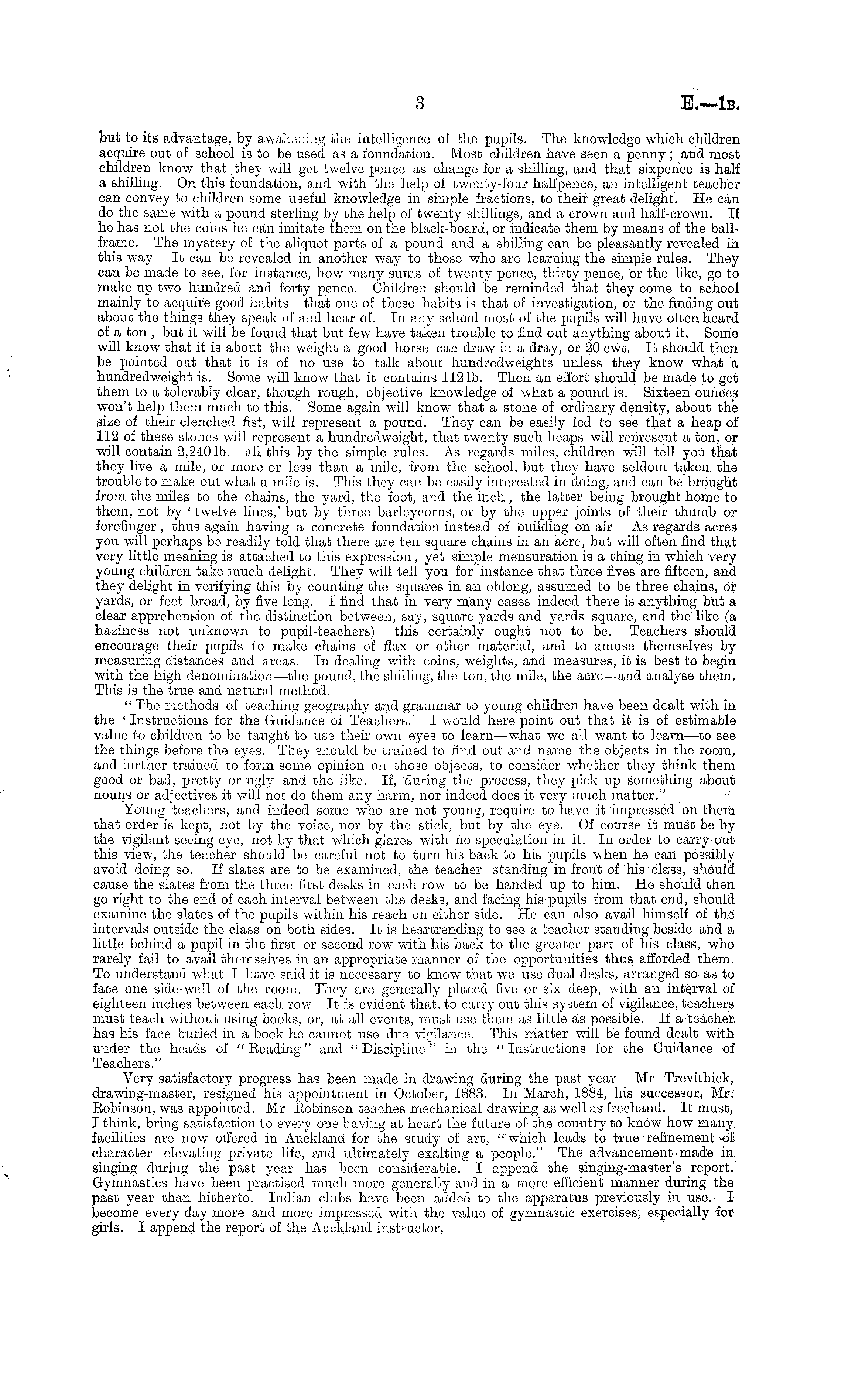 but to its advantage, by awakening the intelligence of the pupils. The knowledge which children acquire out of school is to be used as a foundation. Most children have seen a penny ; and most children know that they will get twelve pence as change for a shilling, and that sixpence is half a shilling. On this foundation, and with the help of twenty-four halfpence, an intelligent teacher can convey to children some useful knowledge in simple fractions, to their great delight. He can do the same with a pound sterling by the help of twenty shillings, and a crown and half-crown. If he has not the coins he can imitate them on the black-board, or indicate them by means of the ballframe. The mystery of the aliquot parts of a pound and a shilling can be pleasantly revealed in this way It can be revealed in another way to those who are learning the simple rules. They can be made to see, for instance, how many sums of twenty pence, thirty pence, or the like, go to make up two hundred and forty pence. Children should be reminded that they come to school mainly to acquire good habits that one of these habits is that of investigation, or the finding out about the things they speak of and hear of. In any school most of the pupils will have often heard of a ton , but it will be found that but few have taken trouble to find out anything about it. Some will know that it is about the weight a good horse can draw in a dray, or 20 cwt. It should then be pointed out that it is of no use to talk about hundredweights unless they know what a hundredweight is. Some will know that it contains 112 lb. Then an effort should be made to get them to a tolerably clear, though rough, objective knowledge of what a pound is. Sixteen ounces won't help them much to this. Some again will know that a stone of ordinary density, about the size of their clenched fist, will represent a pound. They can be easily led to see that a heap of 112 of these stones will represent a hundredweight, that twenty such heaps will represent a ton, or will contain 2,2401b. all this by the simple rules. As regards miles, children will tell you that they live a mile, or more or less than a mile, from the school, but they have seldom taken the trouble to make out what a mile is. This they can be easily interested in doing, and can be brought from the miles to the chains, the yard, the foot, and the inch, the latter being brought home to them, not by ' twelve lines,' but by three barleycorns, or by the upper joints of their thumb or forefinger, thus again having a concrete foundation instead of building on air As regards acres you will perhaps be readily told that there are ten square chains in an acre, but will often find that very little meaning is attached to this expression, yet simple mensuration is a thing in which very young children take much delight. They will tell you for instance that three fives are fifteen, and they delight in verifying this by counting the squares in an oblong, assumed to be three chains, or yards, or feet broad, by five long. I find that in very many cases indeed there is anything but a clear apprehension of the distinction between, say, square yards and yards square, and the like (a haziness not unknown to pupil-teachers) this certainly ought not to be. Teachers should encourage their pupils to make chains of flax or other material, and to amuse themselves by measuring distances and areas. In dealing with coins, weights, and measures, it is best to begin with the high denomination—the pound, the shilling, the ton, the mile, the acre—and analyse them. This is the true and natural method. "The methods of teaching geography and grammar to young children have been dealt with in the 'Instructions for the Guidance of Teachers.' I would here point out that it is of estimable value to children to be taught to use their own eyes to learn —what we all want to learn—to see the things before the eyes. They should be trained to find out and name the objects in the room, and further trained to form some opinion on those objects, to consider whether they think them good or bad, pretty or ugly and the like. If, during the process, they pick up something about nouns or adjectives it will not do them any harm, nor indeed does it very much matter." Young teachers, and indeed some who are not young, require to have it impressed on them that order is kept, not by the voice, nor by the stick, but by the eye. Of course it must be by the vigilant seeing eye, not by that which glares with no speculation in it. In order to carry out this view, the teacher should be careful not to turn his back to his pupils when he can possibly avoid doing so. If slates are to be examined, the teacher standing in front of his class, should cause the slates from the three first desks in each row to be handed up to him. He should then go right to the end of each interval between the desks, and facing his pupils from that end, should examine the slates of the pupils within his reach on either side. He can also avail himself of the intervals outside the class on both sides. It is heartrending to see a teacher standing beside and a little behind a pupil in the first or second row with his back to the greater part of his class, who rarely fail to avail themselves in an appropriate manner of the opportunities thus afforded them. To understand what I have said it is necessary to know that we use dual desks, arranged so as to face one side-wall of the room. They are generally placed five or six deep, with an interval of eighteen inches between each row It is evident that, to carry out this system of vigilance, teachers must teach without using books, or, at all events, must use them as little as possible. If a teacher, has his face buried in a book he cannot use due vigilance. This matter will be found dealt with under the heads of " Beading" and " Discipline" in the " Instructions for the Guidance of Teachers." Very satisfactory progress has been made in drawin
