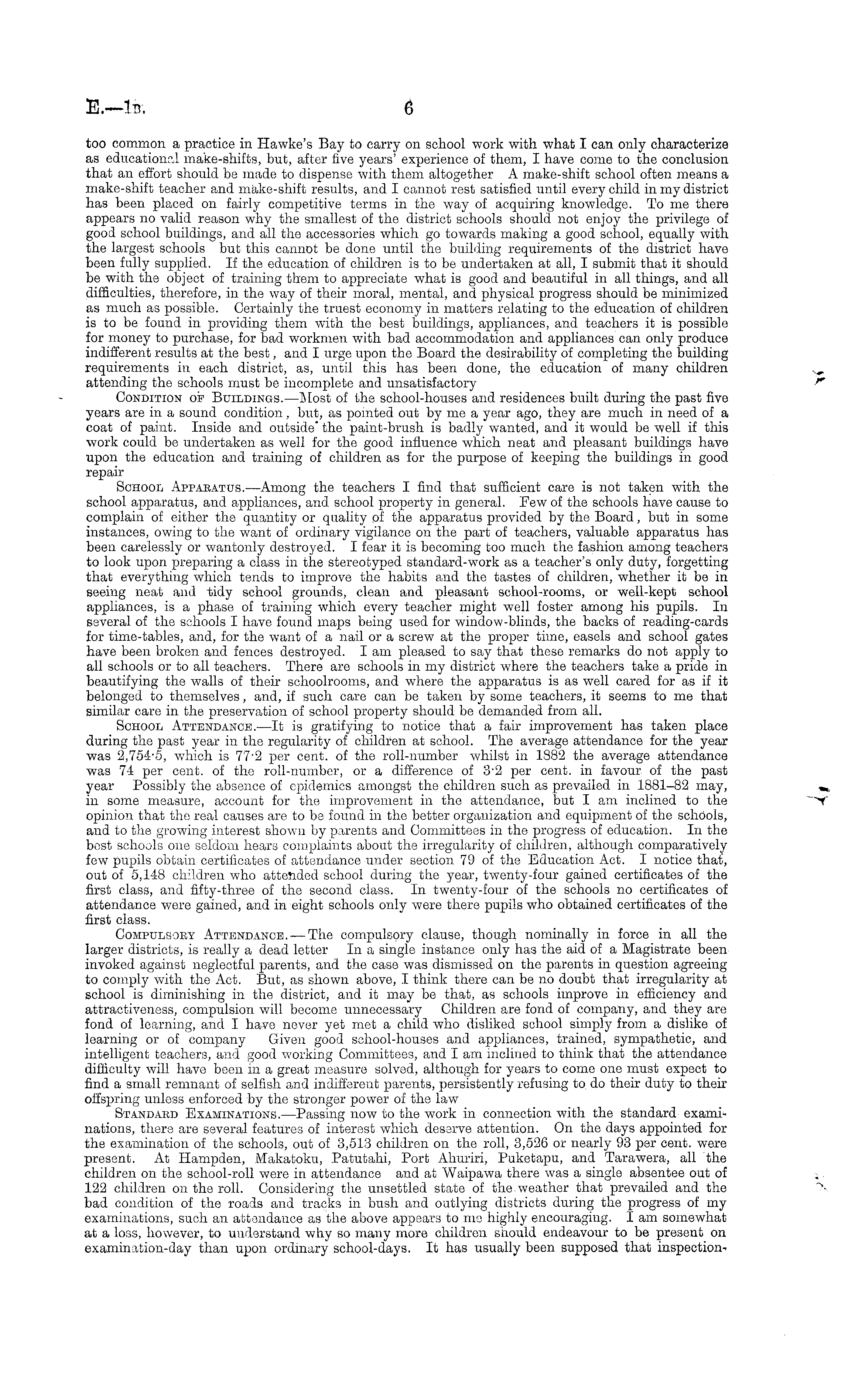 too common a practice in Hawke's Bay to carry on school work with what I can only characterize as educational make-shifts, but, after five years' experience of them, I have come to the conclusion that an effort should be made to dispense with them altogether A make-shift school often means a make-shift teacher and make-shift results, and I cannot rest satisfied until every child in my district has been placed on fairly competitive terms in the way of acquiring knowledge. To me there appears no valid reason why the smallest of the district schools should not enjoy the privilege of good school buildings, and all the accessories which go towards making a good school, equally with the largest schools but this cannot be done until the building requirements of the district have been fully supplied. If the education of children is to be undertaken at all, I submit that it should be with the object of training them to appreciate what is good and beautiful in all things, and all difficulties, therefore, in the way of their moral, mental, and physical progress should be minimized as much as possible. Certainly the truest economy in matters relating to the education of children is to be found in providing them with the best buildings, appliances, and teachers it is possible for money to purchase, for bad workmen with bad accommodation and appliances can only produce indifferent results at the best, and I urge upon the Board the desirability of completing the building requirements in each district, as, until this has been done, the education of many children attending the schools must be incomplete and unsatisfactory Condition of Buildings.—Most of the school-houses and residences built during the past five years are in a sound condition, but, as pointed out by me a year ago, they are much in need of a coat of paint. Inside and outside' the paint-brush is badly wanted, and it would be well if this work could be undertaken as well for the good influence which neat and pleasant buildings have upon the education and training of children as for the purpose of keeping the buildings in good repair School Apparatus.—Among the teachers I find that sufficient care is not taken with the school apparatus, and appliances, and school property in general. Few of the schools have cause to complain of either the quantity or quality of the apparatus provided by the Board, but in some instances, owing to the want of ordinary vigilance on the part of teachers, valuable apparatus has been carelessly or wantonly destroyed. I fear it is becoming too much the fashion among teachers to look upon preparing a class in the stereotyped standard-work as a teacher's only duty, forgetting that everything which tends to improve the habits and the tastes of children, whether it be in seeing neat and tidy school grounds, clean and pleasant school-rooms, or well-kept school appliances, is a phase of training which every teacher might well foster among his pupils. In several of the schools I have found maps being used for window-blinds, the backs of reading-cards for time-tables, and, for the want of a nail or a screw at the proper time, easels and school gates have been broken and fences destroyed. lam pleased to say that these remarks do not apply to all schools or to all teachers. There are schools in my district where the teachers take a pride in beautifying the walls of their schoolrooms, and where the apparatus is as well cared for as if it belonged to themselves, and, if such care can be taken by some teachers, it seems to me that similar care in the preservation of school property should be demanded from all. School Attendance.—lt is gratifying to notice that a fair improvement has taken place during the past year in the regularity of children at school. The average attendance for the year was 2,754-5, which is 772 per cent, of the roll-number whilst in 1882 the average attendance was 74 per cent, of the roll-number, or a difference of 8-2 per cent, in favour of the past year Possibly the absence of epidemics amongst the children such as prevailed in 1881-82 may, in some measure, account for the improvement in the attendance, but I am inclined to the opinion that the real causes are to be found in the better organization and equipment of the schools, and to the growing interest shown by parents and Committees in the progress of education. In the best schools one seldom hears complaints about the irregularity of children, although comparatively few pupils obtain certificates of attendance under section 79 of the Education Act. I notice that, out of 5,148 children who attended school during the year, twenty-four gained certificates of the first class, and fifty-three of the second class. In twenty-four of the schools no certificates of attendance were gained, and in eight schools only were there pupils who obtained certificates of the first class. Compulsory Attendance. — The compulsory clause, though nominally in force in all the larger districts, is really a dead letter In a single instance only has the aid of a Magistrate been invoked against neglectful parents, and the case was dismissed on the parents in question agreeing to comply with the Act. But, as shown above, I think there can be no doubt that irregularity at school is diminishing in the district, and it may be that, as schools improve in efficiency and attractiveness, compulsion will become unnecessary Children are fond of company, and they are fond of learning, and I have never yet met a child who disliked school simply from a dislike of learning or of company Given good school-houses and appliances, trained, sympathetic, and intelligent teachers, and good working Committees, and I am inclined to think that the attendance difficulty will have been in a great measure solved, although for years to come one must expect to find a small remnant of selfish and indifferent parents, persistently refusing to do their duty to their offspring unless enforced by the st