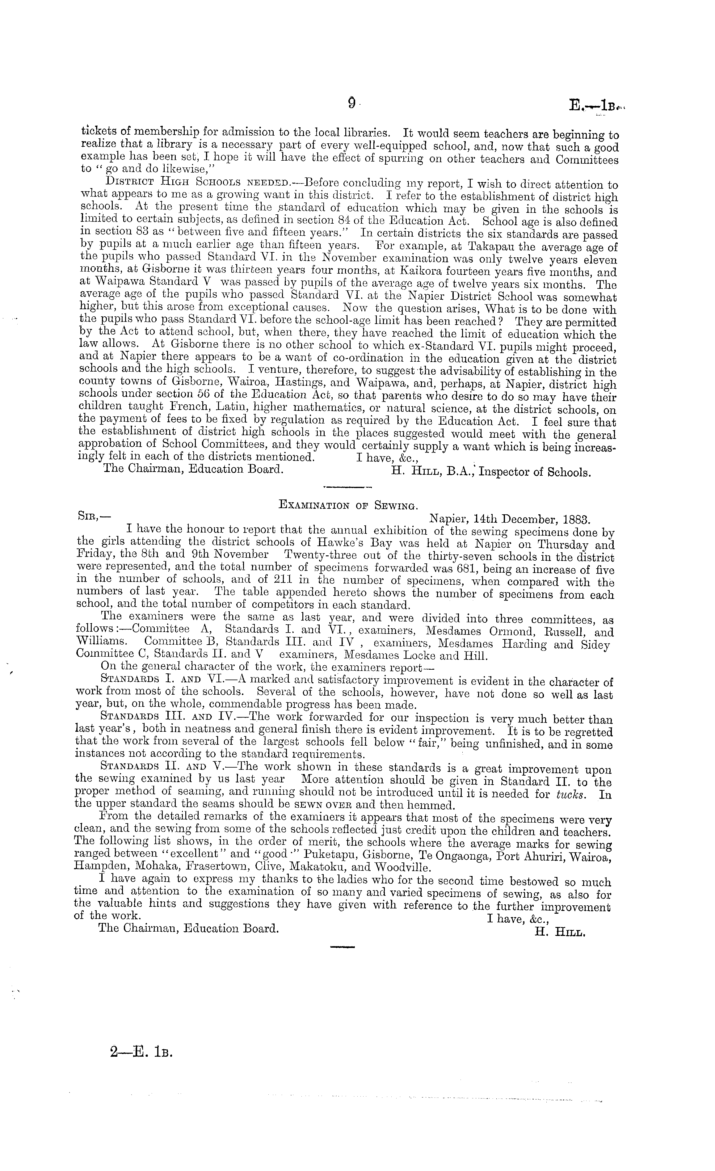 tickets of membership for admission to the local libraries. It would seem teachers are beginning to realize that a library is a necessary part of every well-equipped school, and, now that such a good example has been set, I hope it will have the effect of spurring on other teachers and Committees to "go and do likewise," Distbict High Schools needed.—Before concluding my report, I wish to direct attention to what appears to me as a growing want in this district. I refer to the establishment of district high schools. At the present time the .standard of education which may be given in the schools'is limited to certain subjects, as defined in section 84 of the Education Act. School age is also defined in section 88 as " between five and fifteen years." In certain districts the six standards are passed by pupils at a much earlier age than fifteen years. For example, at Takapau the average age of the pupils who passed Standard VI. in the November examination was only twelve years eleven months, at Gisborne it was thirteen years four months, at Kaikora fourteen years five months, and at Waipawa Standard V was passed by pupils of the average age of twelve years six months. The average age of the pupils who passed Standard VI. at the Napier District School was somewhat higher, but this arose from exceptional causes. Now the question arises, What is to be done with the pupils who pass Standard VI. before the school-age limit has been reached ? They are permitted by the Act to attend school, but, when there, they have reached the limit of education which the law allows. _ At Gisborne there is no other school to which ex-Standard VI. pupils might proceed, and at Napier there appears to be a want of co-ordination in the education given at the district schools and the high schools. I venture, therefore, to suggest-the advisability of establishing in the county towns of Gisborne, Wairoa, Hastings, and Waipawa, and, perhaps, at Napier, district high schools under section 56 of the Education Act, so that parents who desire to do so may have their children taught French, Latin, higher mathematics, or natural science, at the district schools, on the payment of fees to be fixed by regulation as required by the Education Act. I feel sure that the establishment of district high schools in the places suggested would meet with the general approbation of School Committees, and they would certainly supply a want which is being increasingly felt in each of the districts mentioned. I have, &c, The Chairman, Education Board. H. Hill, 8.A.,' Inspector of Schools.