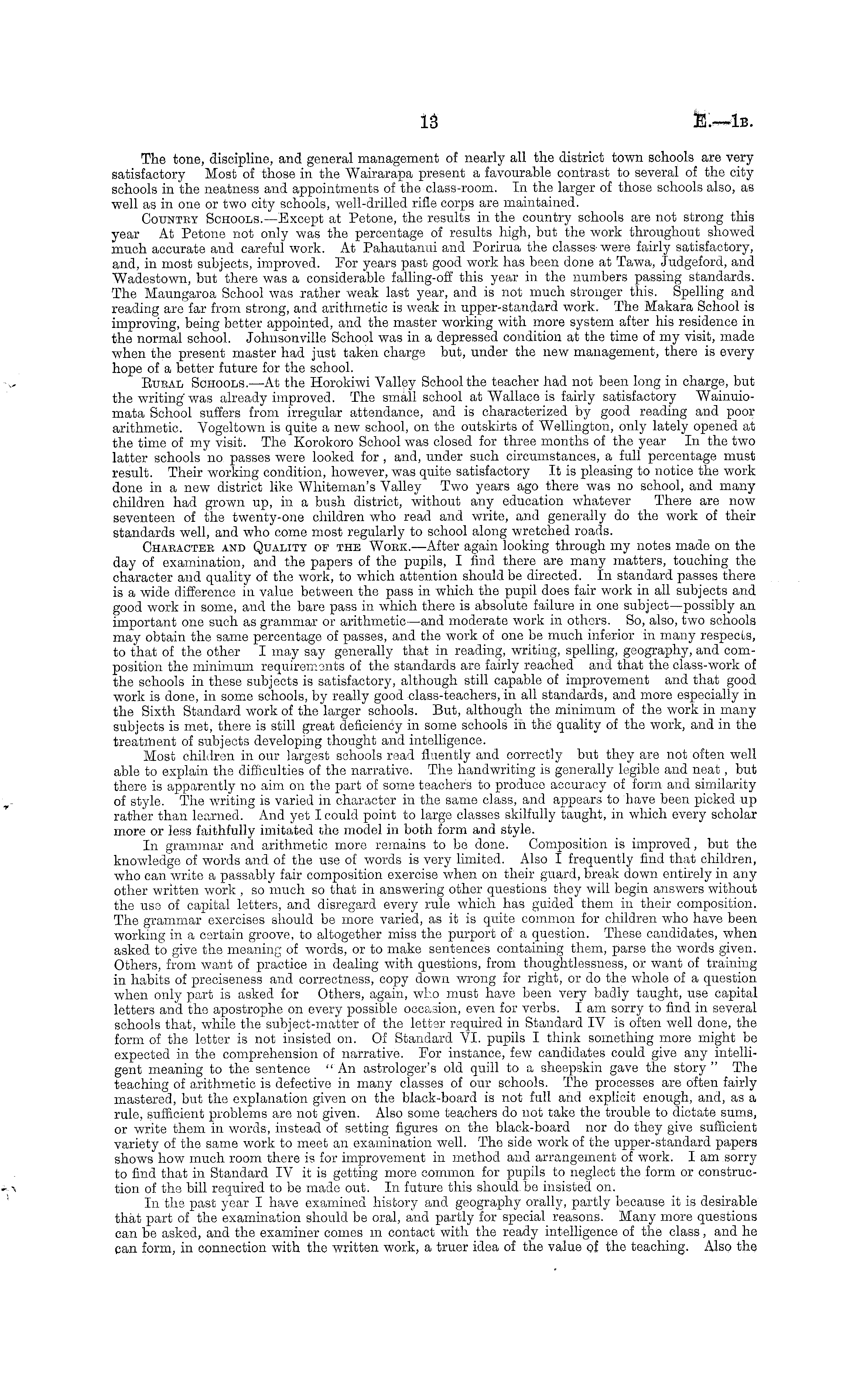 The tone, discipline, and general management of nearly all the district town schools are very satisfactory Most of those in the Wairarapa present a favourable contrast to several of the city schools in the neatness and appointments of the class-room. In the larger of those schools also, as well as in one or two city schools, well-drilled rifle corps are maintained. Country Schools. —Except at Petone, the results in the country schools are not strong this year At Petone not only was the percentage of results high, but the work throughout showed much accurate and careful work. At Pahautanui and Porirua the classes were fairly satisfactory, and, in most subjects, improved. For years past good work has been done at Tawa, Judgeford, and Wadestown, but there was a considerable falling-off this year in the numbers passing standards. The Maungaroa School was rather weak last year, and is not much stronger this. Spelling and reading are far from strong, and arithmetic is weak in upper-standard work. The Makara Scliool is improving, being better appointed, and the master working with more system after his residence in the normal school. Johnsonville School was in a depressed condition at the time of my visit, made wdien the present master had just taken charge but, under the new management, there is every hope of a better future for the school. Bubal Schools.—At the Horokiwi Valley School the teacher had not been long in charge, but the writing was already improved. The small school at Wallace is fairly satisfactory Wainuiomata School suffers from irregular attendance, and is characterized by good reading and poor arithmetic. Yogeltown is quite a new school, on the outskirts of Wellington, only lately opened at the time of my visit. The Korokoro School was closed for three months of the year In the two latter schools no passes were looked for , and, under such circumstances, a full percentage must result. Their working condition, however, was quite satisfactory It is pleasing to notice the work done in a new district like Whiteman's Valley Two years ago there was no school, and many children had grown up, in a bush district, without any education whatever There are now seventeen of the twenty-one children wdio read and write, and generally do the work of their standards well, and who come most regularly to school along wretched roads. Character and Quality op the Work. —After again looking through my notes made on the day of examination, and the papers of the pupils, I find there are many matters, touching the character and quality of the work, to which attention should be directed. In standard passes there is a wide difference in value between the pass in which the pupil does fair work in all subjects and good work in some, and the bare pass in which there is absolute failure in one subject —possibly an important one such as grammar or arithmetic —and moderate work in others. So, also, two schools may obtain the same percentage of passes, and the work of one be much inferior in many respects, to that of the other I may say generally that in reading, writing, spelling, geography, and composition the minimum requirements of the standards are fairly reached and that the class-work of the schools in these subjects is satisfactory, although still capable of improvement and that good work is done, in some schools, by really good class-teachers, in all standards, and more especially in the Sixth Standard work of the larger schools. But, although the minimum of the work in many subjects is met, there is still great deficiency in some schools in the quality of the work, and in the treatment of subjects developing thought and intelligence. Most children in our largest schools read fi isntly and correctly but they are not often well able to explain the difficulties of the narrative. The handwriting is generally legible and neat , but there is apparently no aim on the part of some teachers to produce accuracy of form and similarity of style. The writing is varied in character in the same class, and appears to have been picked up rather than learned. And yet I could point to large classes skilfully taught, in which every scholar more or less faithfully imitated the model in both form and style. In grammar and arithmetic more remains to be done. Composition is improved, but the knowledge of words and of the use of words is very limited. Also I frequently find that children, who can write a passably fair composition exercise when on their guard, break down entirely in any other written work , so much so that in answering other questions they will begin answers without the use of capital letters, and disregard every rule which has guided them in their composition. The grammar exercises should be more varied, as it is quite common for children who have been working in a certain groove, to altogether miss the purport of' a question. These candidates, when asked to give the meaning of words, or to make sentences containing them, parse the words given. Others, from want of practice in dealing with questions, from thoughtlessness, or want of training in habits of preciseness and correctness, copy down wrong for right, or do the whole of a question when only part is asked for Others, again, who must have been very badly taught, use capital letters and the apostrophe on every possible occasion, even for verbs. lam sorry to find in several schools that, while the subject-matter of the letter required in Standard IV is often well done, the form of the letter is not insisted on. Of Standard VI. pupils I think something more might be expected in the comprehension of narrative. For instance, few candidates could give any intelligent meaning to the sentence "An astrologer's old quill to a sheepskin gave the story " The teaching of arithmetic is defective in many classes of our schools. The processes are often fairly mastered, but the explanation given on the black-board is not full and explicit enough, and, as a ru