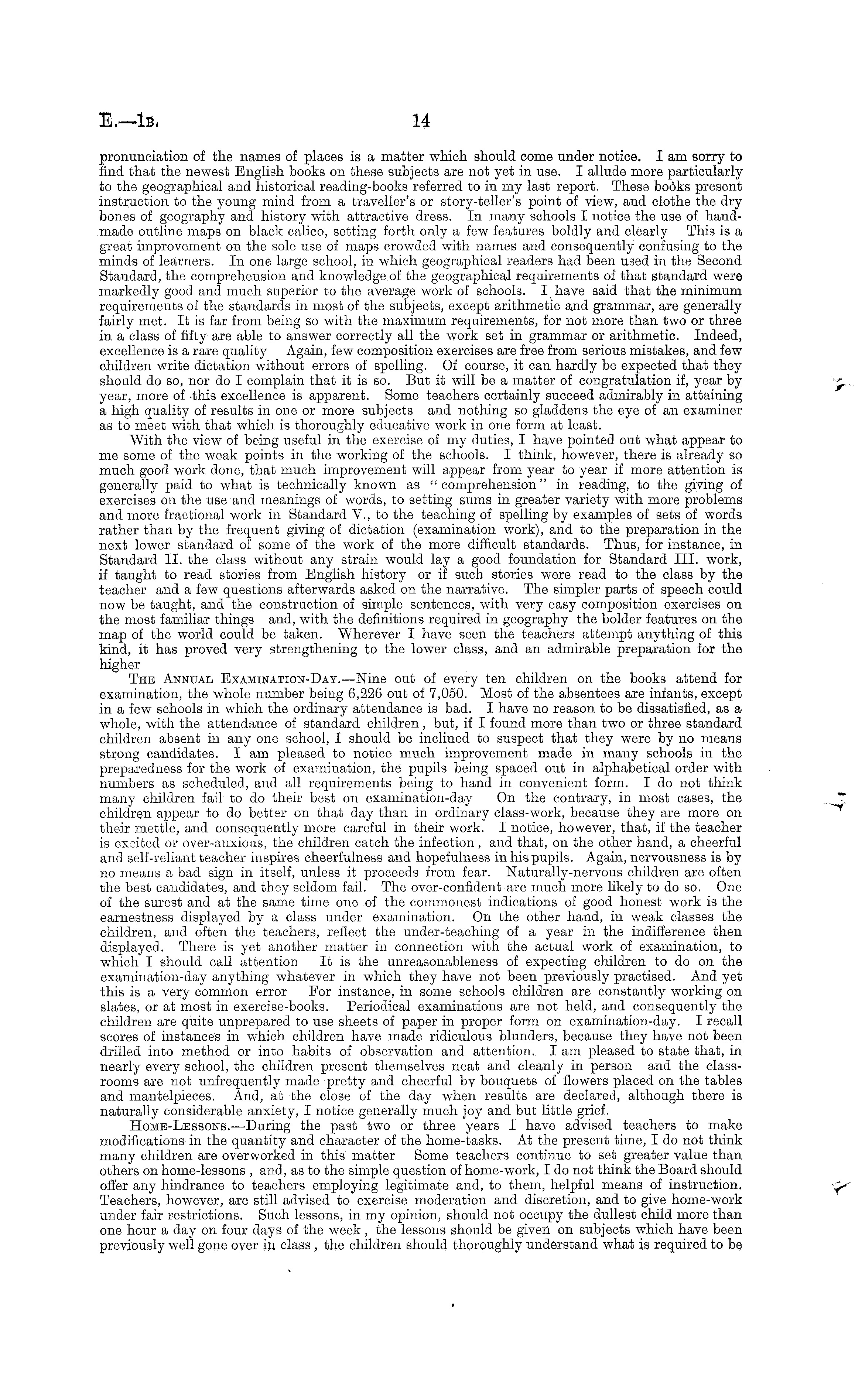 pronunciation of the names of places is a matter which should come under notice. lam sorry to find that the newest English books on these subjects are not yet in use. I allude more particularly to the geographical and historical reading-books referred to in my last report. These books present instruction to the young mind from a traveller's or story-teller's point of view, and clothe the dry bones of geography and history with attractive dress. In many schools I notice the use of handmade outline maps on black calico, setting forth only a few features boldly and clearly This is a great improvement on the sole use of maps crowded with names and consequently confusing to the minds of learners. In one large school, in which geographical readers had been used in the Second Standard, the comprehension and knowledge of the geographical requirements of that standard were markedly good and much superior to the average work of schools. I have said that the minimum requirements of the standards in most of the subjects, except arithmetic and grammar, are generally fairly met. It is far from being so with the maximum requirements, for not more than two or three in a class of fifty are able to answer correctly all the work set in grammar or arithmetic. Indeed, excellence is a rare quality Again, few composition exercises are free from serious mistakes, and few children write dictation without errors of spelling. Of course, it can hardly be expected that they should do so, nor do I complain that it is so. But it will be a matter of congratulation if, year by year, more of -this excellence is apparent. Some teachers certainly succeed admirably in attaining a high quality of results in one or more subjects and nothing so gladdens the eye of an examiner as to meet with that which is thoroughly educative work in one form at least. With the view of being useful in the exercise of my duties, I have pointed out what appear to me some of the w r eak points in the working of the schools. I think, however, there is already so much good work done, that much improvement will appear from year to year if more attention is generally paid to what is technically known as "comprehension" in reading, to the giving of exercises on the use and meanings of words, to setting sums in greater variety with more problems and more fractional work in Standard V., to the teaching of spelling by examples of sets of words rather than by the frequent giving of dictation (examination work), and to the preparation in the next lower standard of some of the work of the more difficult standards. Thus, for instance, in Standard 11. the class without any strain would lay a good foundation for Standard 111. work, if taught to read stories from English history or if such stories were read to the class by the teacher and a few questions afterwards asked on the narrative. The simpler parts of speech could now be taught, and the construction of simple sentences, with very easy composition exercises on the most familiar things and, with the definitions required in geography the bolder features on the map of the world could be taken. Wherever I have seen the teachers attempt anything of this kind, it has proved very strengthening to the lower class, and an admirable preparation for the higher The Annual Examination-Day.—Nine out of every ten children on the books attend for examination, the whole number being 6,226 out of 7,050. Most of the absentees are infants, except in a few schools in which the ordinary attendance is bad. I have no reason to be dissatisfied, as a w T hole, with the attendance of standard children, but, if I found more than two or three standard children absent in any one school, I should be inclined to suspect that they were by no means strong candidates. I am pleased to notice much improvement made in many schools in the preparedness for the work of examination, the pupils being spaced out in alphabetical order with numbers as scheduled, and all requirements being to hand in convenient form. I do not think many children fail to do their best on examination-day On the contrary, in most cases, the children appear to do better on that day than in ordinary class-work, because they are more on their mettle, and consequently more careful in their work. I notice, however, that, if the teacher is excited or over-anxious, the children catch the infection, and that, on the other hand, a cheerful and self-reliant teacher inspires cheerfulness and hopefulness in his pupils. Again, nervousness is by no means a bad sign in itself, unless it proceeds from fear. Naturally-nervous children are often the best candidates, and they seldom fail. The over-confident are much more likely to do so. One of the surest and at the same time one of the commonest indications of good honest work is the earnestness displayed by a class under examination. On the other hand, in weak classes the children, and often the teachers, reflect the under-teaching of a year in the indifference then displayed. There is yet another matter in connection with the actual work of examination, to which I should call attention It is the unreasonableness of expecting children to do on the examination-day anything whatever in which they have not been previously practised. And yet this is a very common error For instance, in some schools children are constantly working on slates, or at most in exercise-books. Periodical examinations are not held, and consequently the children are quite unprepared to use sheets of paper in proper form on examination-day. I recall scores of instances in which children have made ridiculous blunders, because they have not been drilled into method or into habits of observation and attention. lam pleased to state that, in nearly every school, the children present themselves neat and cleanly in person and the classrooms are not unfrequently made pretty and cheerful by bouquets of flowers placed on the tables and mantelpieces. And, at the close of the 