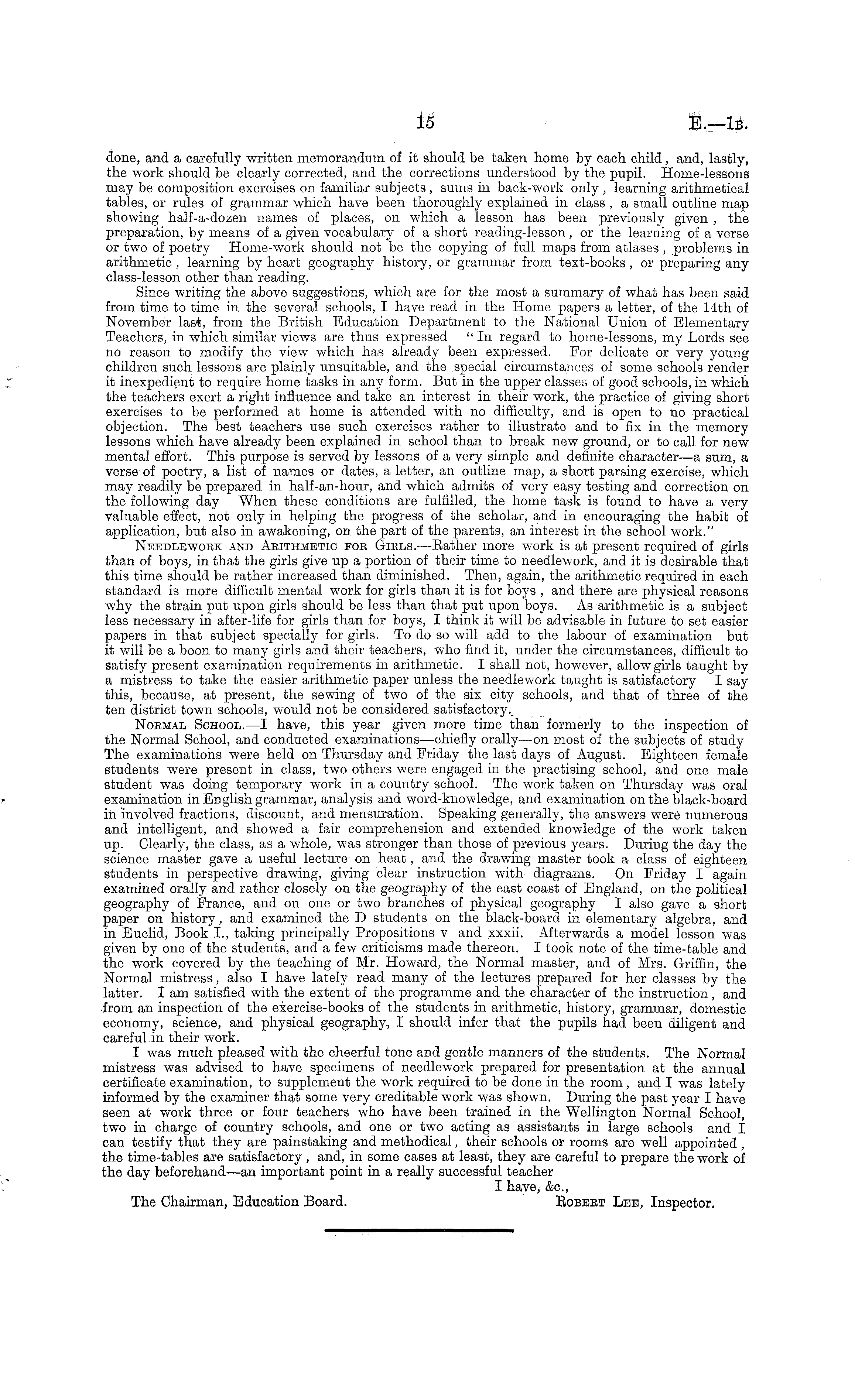 done, and a carefully written memorandum of it should be taken home by each child, and, lastly, the work should be clearly corrected, and the corrections understood by the pupil. Home-lessons may be composition exercises on familiar subjects , sums in back-work only , learning arithmetical tables, or rules of grammar which have been thoroughly explained in class , a small outline map showing half-a-dozen names of places, on which a lesson has been previously given , the preparation, by means of a given vocabulary of a short reading-lesson, or the learning of a verse or two of poetry Home-work should not be the copying of full maps from atlases , problems in arithmetic , learning by heart geography history, or grammar from text-books , or preparing any class-lesson other than reading. Since writing the above suggestions, which are for the most a summary of what has been said from time to time in the several schools, I have read in the Home papers a letter, of the 14th of November last, from the British Education Department to the National Union of Elementary Teachers, in which similar views are thus expressed "In regard to home-lessons, my Lords see no reason to modify the view which has already been expressed. For delicate or very young children such lessons are plainly unsuitable, and the special circumstances of some schools render it inexpedient to require home tasks in any form. But in the upper classes of good schools, in which the teachers exert a right influence and take an interest in their work, the practice of giving short exercises to be performed at home is attended with no difficulty, and is open to no practical objection. The best teachers use such exercises rather to illustrate and to fix in the memory lessons which have already been explained in school than to break new ground, or to call for new mental effort. This purpose is served by lessons of a very simple and definite character—a sum, a verse of poetry, a list of names or dates, a letter, an outline map, a short parsing exercise, which may readily be prepared in half-an-hour, and which admits of very easy testing and correction on the following day When these conditions are fulfilled, the home task is found to have a very valuable effect, not only in helping the progress of the scholar, and in encouraging the habit of application, but also in awakening, on the part of the parents, an interest in the school work." Nbbdlewoek and Arithmetic fob Gikls.—Rather more work is at present required of girls than of boys, in that the girls give up a portion of their time to needlework, and it is desirable that this time should be rather increased than diminished. Then, again, the arithmetic required in each standard is more difficult mental work for girls than it is for boys , and there are physical reasons why the strain put upon girls should be less than that put upon boys. As arithmetic is a subject less necessary in after-life for girls than for boys, I think it will be advisable in future to set easier papers in that subject specially for girls. To do so will add to the labour of examination but it will be a boon to many girls and their teachers, who find it, under the circumstances, difficult to satisfy present examination requirements in arithmetic. I shall not, however, allow girls taught by a mistress to take the easier arithmetic paper unless the needlework taught is satisfactory I say this, because, at present, the sewing of two of the six city schools, and that of three of the ten district town schools, would not be considered satisfactory. Normal School.—l have, this year given more time than formerly to the inspection of the Normal School, and conducted examinations—chiefly orally—on most of the subjects of study The examinations were held on Thursday and Friday the last days of August. Eighteen female students were present in class, two others were engaged in the practising school, and one male student was doing temporary work in a country school. The work taken on Thursday was oral examination in English grammar, analysis and word-knowledge, and examination on the black-board in involved fractions, discount, and mensuration. Speaking generally, the answers were numerous and intelligent, and showed a fair comprehension and extended knowledge of the work taken up. Clearly, the class, as a whole, was stronger than those of previous years. During the day the science master gave a useful lecture on heat, and the drawing master took a class of eighteen students in perspective drawing, giving clear instruction with diagrams. On Friday I again examined orally and rather closely on the geography of the east coast of England, on the political geography of France, and on one or two branches of physical geography I also gave a short paper on history, and examined the D students on the black-board in elementary algebra, and in Euclid, Book 1., taking principally Propositions v and xxxii. Afterwards a model lesson was given by one of the students, and a few criticisms made thereon. I took note of the time-table and the work covered by the teaching of Mr. Howard, the Normal master, and of Mrs. Griffin, the Normal mistress, also I have lately read many of the lectures prepared for her classes by the latter. lam satisfied with the extent of the programme and the character of the instruction, and from an inspection of the exercise-books of the students in arithmetic, history, grammar, domestic economy, science, and physical geography, I should infer that the pupils had been diligent and careful in their work. I was much pleased with the cheerful tone and gentle manners of the students. The Normal mistress was advised to have specimens of needlework prepared for presentation at the annual certificate examination, to supplement the work required to be done in the room, and I was lately informed by the examiner that some very creditable work was shown. During the past year I have seen at work three or four teachers who ha