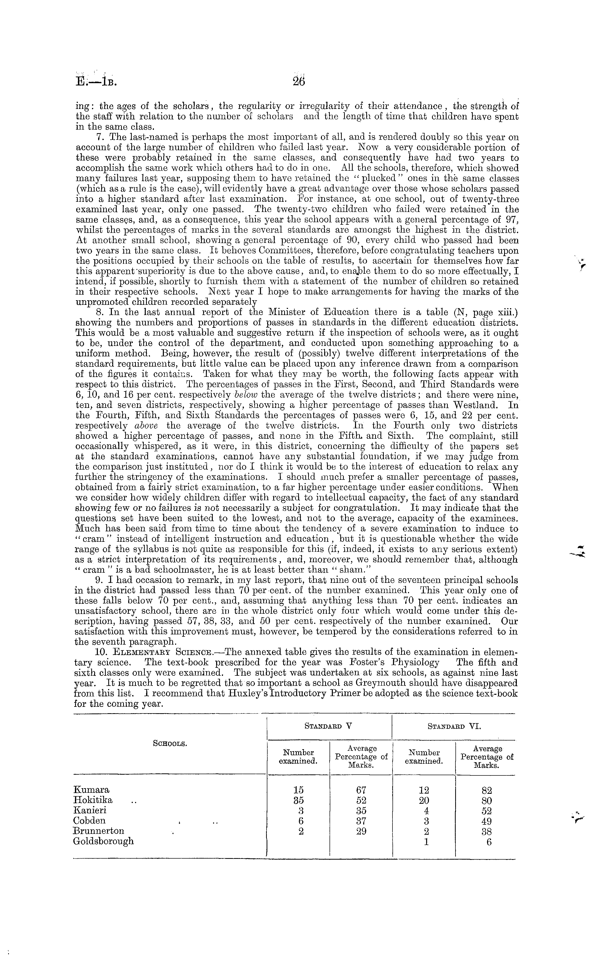 ing: the ages of the scholars, the regularity or irregularity of their attendance, the strength of the staff with relation to the number of scholars and the length of time that children have spent in the same class. 7. The last-named is perhaps the most important of all, and is rendered doubly so this year on account of the large number of children who failed last year. Now a very considerable portion of these were probably retained in the same classes, and consequently have had two years to accomplish the same work which others had to do in one. All the schools, therefore, which showed many failures last year, supposing them to have retained the "plucked" ones in the same classes (which as a rule is the case), will evidently have a great advantage over those whose scholars passed into a higher standard after last examination. For instance, at one school, out of twenty-three examined last year, only one passed. The twenty-two children who failed were retained in the same classes, and, as a consequence, this year the school appears with a general percentage of 97, whilst the percentages of marks in the several standards are amongst the highest in the district. At another small school, showing a general percentage of 90, every child who passed had been two years in the same class. It behoves Committees, therefore, before congratulating teachers upon the positions occupied by their schools on the table of results, to ascertain for themselves how far this apparent superiority is due to the above cause, and, to enable them to do so more effectually, I intend, if possible, shortly to furnish thorn with a statement of the number of children so retained in their respective schools. Next year I hope to make arrangements for having the marks of the unpromoted children recorded separately 8. In the last annual report of the Minister of Education there is a table (N, page xiii.) showing the numbers and proportions of passes in standards in the different education districts. This would be a most valuable and suggestive return if the inspection of schools were, as it ought to be, under the control of the department, and conducted upon something approaching to a uniform method. Being, however, the result of (possibly) twelve different interpretations of the standard requirements, but little value can be placed upon any inference drawn from a comparison of the figures it contains. Taken for what they may be worth, the following facts appear with respect to this district. The percentages of passes in the First, Second, and Third Standards were 6, 10, and 16 per cent, respectively below the average of the twelve districts; and there were nine, ten, and seven districts, respectively, showing a higher percentage of passes than Westland. In the Fourth, Fifth, and Sixth Standards the percentages of passes were 6, 15, and 22 per cent, respectively above the average of the twelve districts. In the Fourth only two districts showed a higher percentage of passes, and none in the Fifth, and Sixth. The complaint, still occasionally whispered, as it were, in this district, concerning the difficulty of the papers set at the standard examinations, cannot have any substantial foundation, if we may judge from the comparison just instituted, nor do I think it would be to the interest of education to relax any further the stringency of the examinations. I should much prefer a smaller percentage of passes, obtained from a fairly strict examination, to a far higher percentage under easier conditions. When we consider how widely children differ with regard to intellectual capacity, the fact of any standard showing few or no failures is not necessarily a subject for congratulation. It may indicate that the questions set have been suited to the lowest, and not to the average, capacity of the examinees. Much has been said from time to time about the tendency of a severe examination to induce to "cram" instead of intelligent instruction and education, but it is questionable whether the wide range of the syllabus is not quite as responsible for this (if, indeed, it exists to any serious extent) as a strict interpretation of its requirements , and, moreover, we should remember that, although " cram " is a bad schoolmaster, he is at least better than " sham." 9. I had occasion to remark, in my last report, that nine out of the seventeen principal schools in the district had passed less than 70 per cent, of the number examined. This year only one of these falls below 70 per cent., and, assuming that anything less than 70 per cent, indicates an unsatisfactory school, there are in the whole district only four which would come under this description, having passed 57, 38, 33, and 50 per cent, respectively of the number examined. Our satisfaction with this improvement must, however, be tempered by the considerations referred to in the seventh paragraph. 10. Elementaby Science.—The annexed table gives the results of the examination in elementary science. The text-book prescribed for the year was Foster's Physiology The fifth and sixth classes only were examined. The subject was undertaken at six schools, as against nine last year. It is much to be regretted that so important a school as Greymouth should have disappeared from this list. I recommend that Huxley's Introductory Primer be adopted as the science text-book for the coming year.