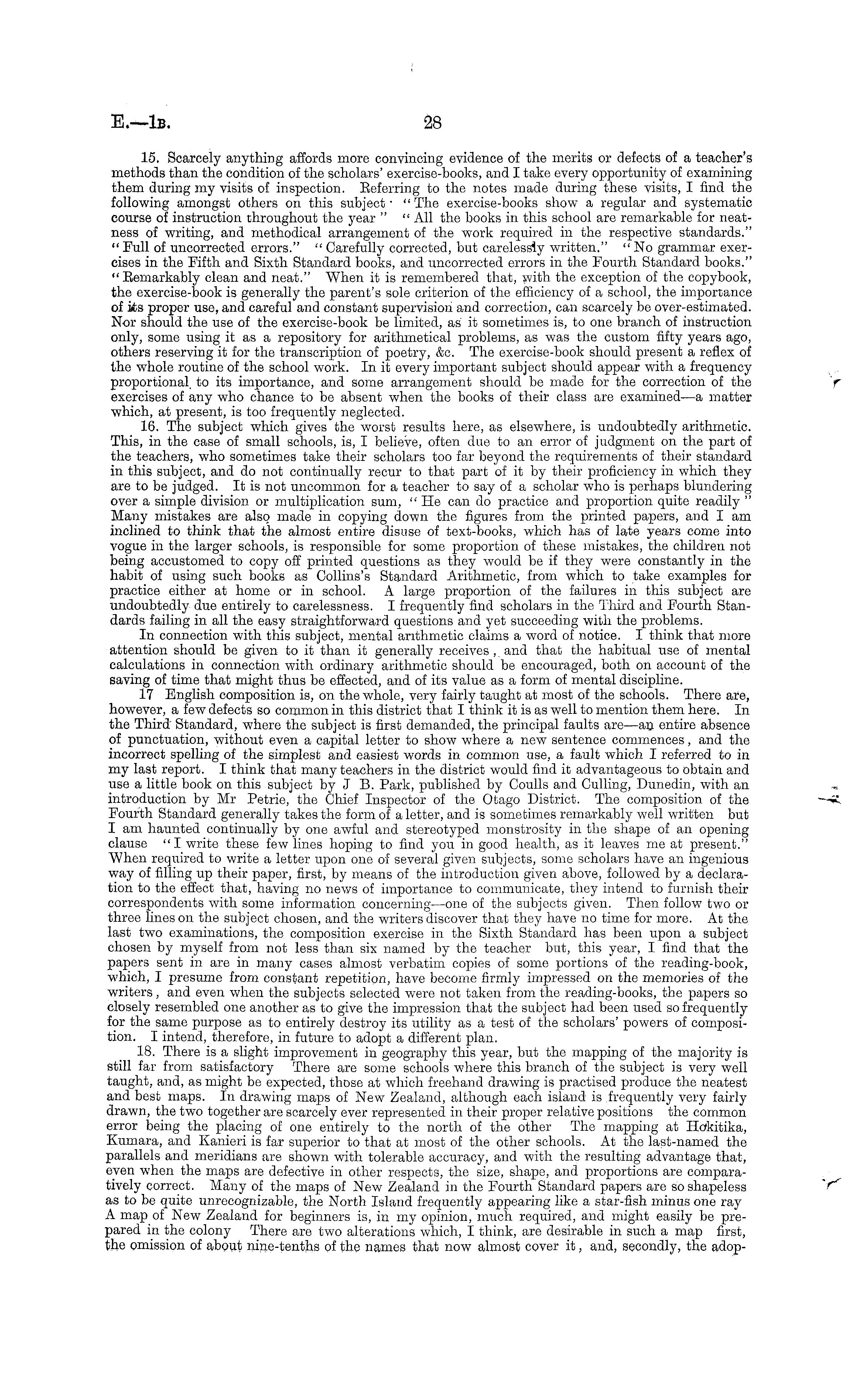 15. Scarcely anything affords more convincing evidence of the merits or defects of a teacher's methods than the condition of the scholars' exercise-books, and I take every opportunity of examining them during my visits of inspection. Beferring to the notes made during these visits, I find the following amongst others on this subject- "The exercise-books show a regular and systematic course of instruction throughout the year " " All the books in this school are remarkable for neatness of writing, and methodical arrangement of the work required in the respective standards." " Full of uncorrected errors." " Carefully corrected, but carelessly written." "No grammar exercises in the Fifth and Sixth Standard books, and uncorrected errors in the Fourth Standard books." " Bemarkably clean and neat." When it is remembered that, with the exception of the copybook, the exercise-book is generally the parent's sole criterion of the efficiency of a school, the importance of its proper use, and careful and constant supervision and correction, can scarcely be over-estimated. Nor should the use of the exercise-book be limited, as it sometimes is, to one branch of instruction only, some using it as a repository for arithmetical problems, as was the custom fifty years ago, others reserving it for the transcription of poetry, &c. The exercise-book should present a reflex of the whole routine of the school work. In it every important subject should appear with a frequency proportional to its importance, and some arrangement should be made for the correction of the exercises of any who chance to be absent when the books of their class are examined—a matter which, at present, is too frequently neglected. 16. The subject which gives the worst results here, as elsewhere, is undoubtedly arithmetic. This, in the case of small schools, is, I believe, often due to an error of judgment on the part of the teachers, who sometimes take their scholars too far beyond the requirements of their standard in this subject, and do not continually recur to that part of it by their proficiency in which they are to be judged. It is not uncommon for a teacher to say of a scholar who is perhaps blundering over a simple division or multiplication sum, " He can do practice and proportion quite readily " Many mistakes are also made in copying down the figures from the printed papers, and I am inclined to think that the almost entire disuse of text-books, which has of late years come into vogue in the larger schools, is responsible for some proportion of these mistakes, the children not being accustomed to copy off printed questions as they would be if they were constantly in the habit of using such books as Collins's Standard Arithmetic, from which to take examples for practice either at home or in school. A large proportion of the failures in this subject are undoubtedly due entirely to carelessness. I frequently find scholars in the Third and Fourth Standards failing in all the easy straightforward questions and yet succeeding with the problems. In connection with this subject, mental arithmetic claims a word of notice. I think that more attention should be given to it than it generally receives , and that the habitual use of mental calculations in connection with ordinary arithmetic should be encouraged, both on account of the saving of time that might thus be effected, and of its value as a form of mental discipline. 17 English composition is, on the whole, very fairly taught at most of the schools. There are, however, a few defects so common in this district that I think it is as well to mention them here. In the Third Standard, where the subject is first demanded, the principal faults are —an entire absence of punctuation, without even a capital letter to show where a new sentence commences, and the incorrect spelling of the simplest and easiest words in common use, a fault which I referred to in my last report. I think that many teachers in the district would find it advantageous to obtain and use a little book on this subject by J B. Park, published by Coulls and Culling, Dunedin, with an introduction by Mr Petrie, the Chief Inspector of the Otago District. The composition of the Fourth Standard generally takes the form of a letter, and is sometimes remarkably well written but I am haunted continually by one awful and stereotyped monstrosity in the shape of an opening clause "I write these few lines hoping to find you in good health, as it leaves me at present." When required to write a letter upon one of several given subjects, some scholars have an ingenious way of filling up their paper, first, by means of the introduction given above, followed by a declaration to the effect that, having no news of importance to communicate, they intend to furnish their correspondents with some information concerning—one of the subjects given. Then follow two or three lines on the subject chosen, and the writers discover that they have no time for more. At the last two examinations, the composition exercise in the Sixth Standard has been upon a subject chosen by myself from not less than six named by the teacher but, this year, I find that the papers sent in are in many cases almost verbatim copies of some portions of the reading-book, which, I presume from constant repetition, have become firmly impressed on the memories of the writers, and even when the subjects selected were not taken from the reading-books, the papers so closely resembled one another as to give the impression that the subject had been Used so frequently for the same purpose as to entirely destroy its utility as a test of the scholars' powers of composition. I intend, therefore, in future to adopt a different plan. 18. There is a slight improvement in geography this year, but the mapping of the majority is still far from satisfactory There are some schools where this branch of the subject is very well taught, and, as might be expected, those at which freehand drawin