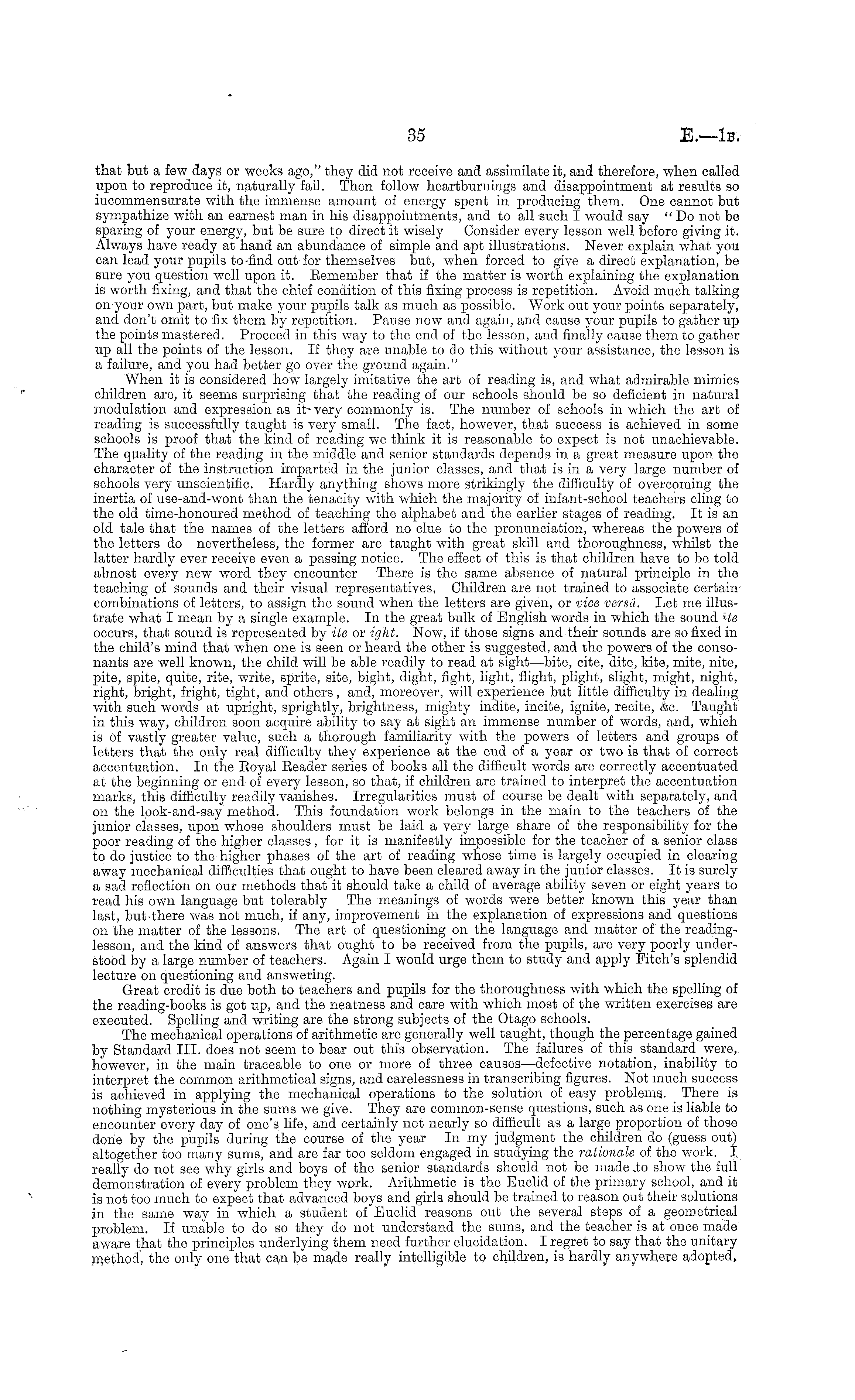 that but a few days or weeks ago," they did not receive and assimilate it, and therefore, when called upon to reproduce it, naturally fail. Then follow heartburnings and disappointment at results so incommensurate with the immense amount of energy spent in producing them. One cannot but sympathize with an earnest man in his disappointments, and to all such I would say "Do not be sparing of your energy, but be sure to direct it wisely Consider every lesson well before giving it. Always have ready at hand an abundance of simple and apt illustrations. Never explain what you can lead your pupils to-find out for themselves but, when forced to give a direct explanation, be sure you question well upon it. Eemember that if the matter is worth explaining the explanation is worth fixing, and that the chief condition of this fixing process is repetition. Avoid much talking on your own part, but make your pupils talk as much as possible. Work out your points separately, and don't omit to fix them by repetition. Pause now and again, and cause your pupils to gather up the points mastered. Proceed in this way to the end of the lesson, and finally cause them to gather up all the points of the lesson. If they are unable to do this without your assistance, the lesson is a failure, and you had better go over the ground again." When it is considered how largely imitative the art of reading is, and wdiat admirable mimics children are, it seems surprising that the reading of our schools should be so deficient in natural modulation and expression as it-very commonly is. The number of schools in which the art of reading is successfully taught is very small. The fact, however, that success is achieved in some schools is proof that the kind of reading we think it is reasonable to expect is not unachievable. The quality of the reading in the middle and senior standards depends in a great measure upon the character of the instruction imparted in the junior classes, and that is in a very large number of schools very unscientific. Hardly anything shows more strikingly the difficulty of overcoming the inertia of use-and-wont than the tenacity with which the majority of infant-school teachers cling to the old time-honoured method of teaching the alphabet and the earlier stages of reading. It is an old tale that the names of the letters afford no clue to the pronunciation, whereas the powers of the letters do nevertheless, the former are taught with great skill and thoroughness, whilst the latter hardly ever receive even a passing notice. The effect of this is that children have to be told almost every new word they encounter There is the same absence of natural principle in the teaching of sounds and their visual representatives. Children are not trained to associate certain combinations of letters, to assign the sound when the letters are given, or vice versa. Let me illustrate what I mean by a single example. In the great bulk of English words in which the sound He occurs, that sound is represented by ite or ight. Now, if those signs and their sounds are so fixed in the child's mind that when one is seen or heard the other is suggested, and the powers of the consonants are well known, the child will be able readily to read at sight—bite, cite, dite, kite, mite, nite, pite, spite, quite, rite, write, sprite, site, bight, dight, fight, light, flight, plight, slight, might, night, right, bright, fright, tight, and others, and, moreover, will experience but little difficulty in dealing with such words at upright, sprightly, brightness, mighty indite, incite, ignite, recite, &c. Taught in this way, children soon acquire ability to say at sight an immense number of words, and, which is of vastly greater value, such a thorough familiarity with the powers of letters and groups of letters that the only real difficulty they experience at the end of a year or two is that of correct accentuation. In the Boyal Eeader series of books all the difficult words are correctly accentuated at the beginning or end of every lesson, so that, if children are trained to interpret the accentuation marks, this difficulty readily vanishes. Irregularities must of course be dealt with separately, and on the look-and-say method. This foundation work belongs in the main to the teachers of the junior classes, upon whose shoulders must be laid a very large share of the responsibility for the poor reading of the higher classes, for it is manifestly impossible for the teacher of a senior class to do justice to the higher phases of the art of reading whose time is largely occupied in clearing away mechanical difficulties that ought to have been cleared away in the junior classes. It is surely a sail reflection on our methods that it should take a child of average ability seven or eight years to read his own language but tolerably The meanings of words were better known this year than last, but there was not much, if any, improvement in the explanation of expressions and questions on the matter of the lessons. The art of questioning on the language and matter of the readinglesson, and the kind of answers that ought to be received from the pupils, are very poorly understood by a large number of teachers. Again I would urge them to study and apply Fitch's splendid lecture on questioning and answering. Great credit is due both to teachers and pupils for the thoroughness with which the spelling of the reading-books is got up, and the neatness and care with which most of the written exercises are executed. Spelling and writing are the strong subjects of the Otago schools. The mechanical operations of arithmetic are generally well taught, though the percentage gained by Standard 111. does not seem to bear out this observation. The failures of this standard were, however, in the main traceable to one or more of three causes —defective notation, inability to interpret the common arithmetical signs, and carelessness in transcribing figures. Not much success is