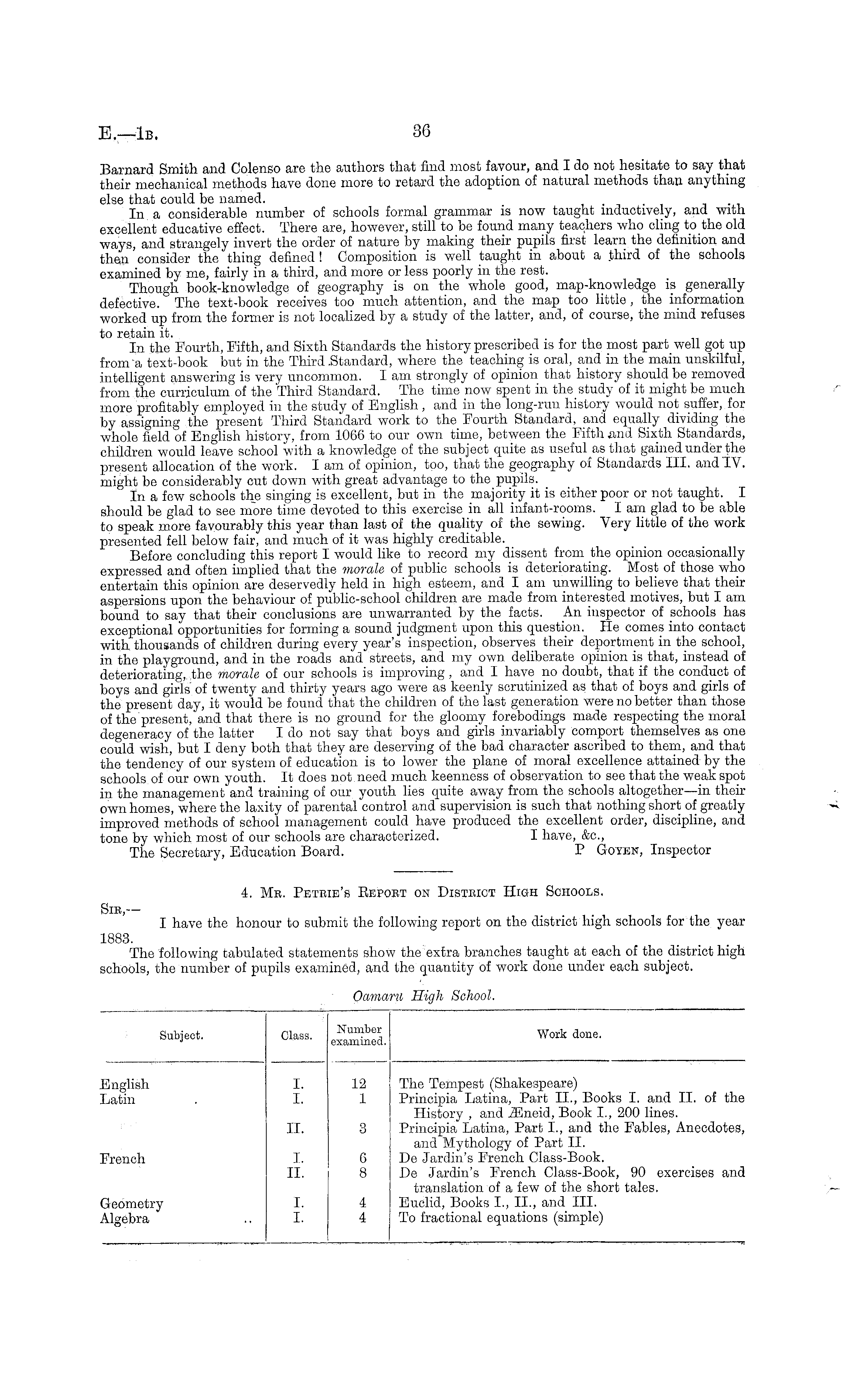4. Me. Peteie's Repobt on District High Schools. Sic, — I have the honour to submit the following report on the district high schools for the year 1883. The following tabulated statements show the extra branches taught at each of the district high schools, the number of pupils examined, and the quantity of work done under each subject.