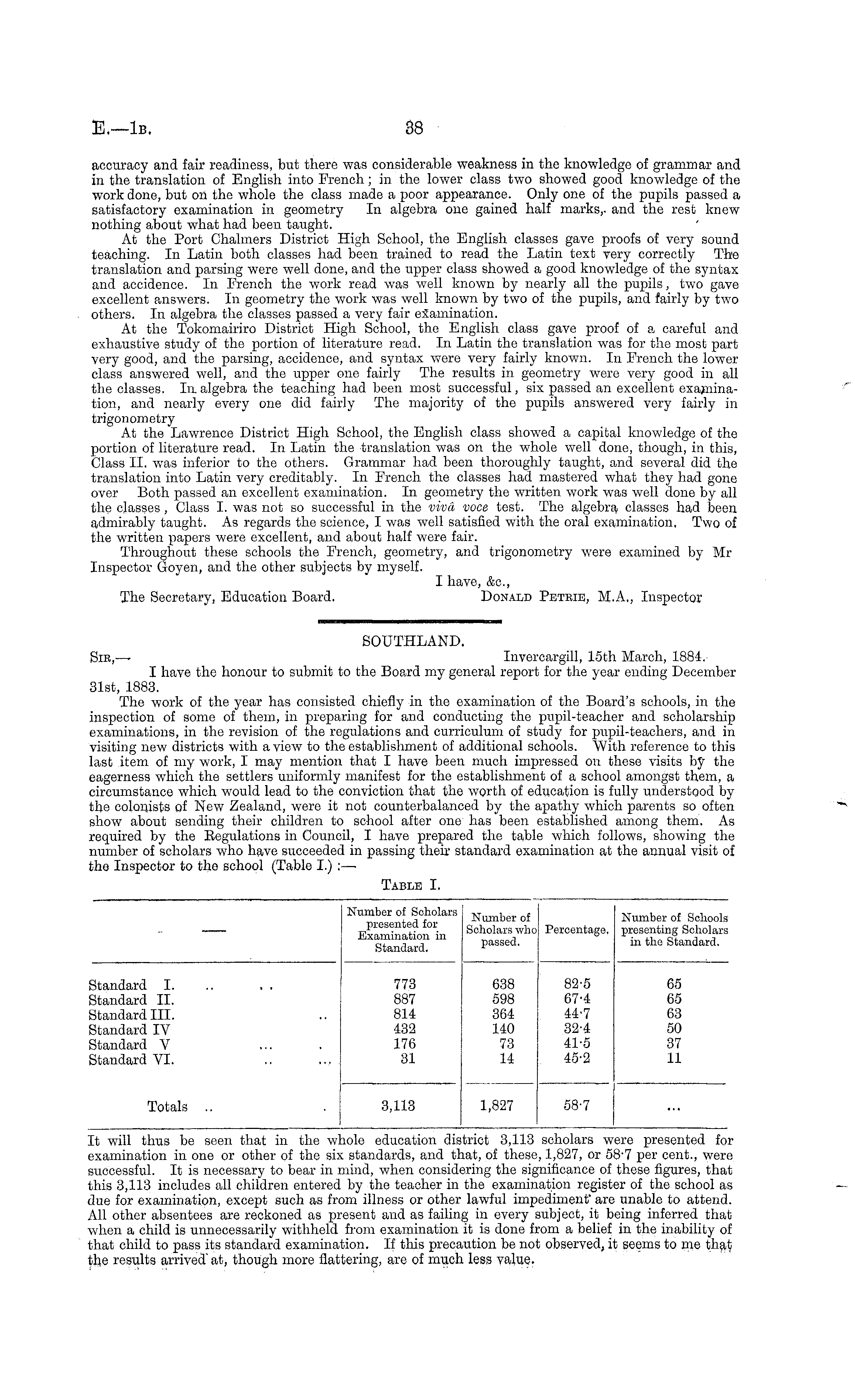 SOUTHLAND. Sir, —- Invercargill, 15th March, 1884. I have the honour to submit to the Board my general report for the year ending December 31st, 1883. The work of the year has consisted chiefly in the examination of the Board's schools, in the inspection of some of them, in preparing for and conducting the pupil-teacher and scholarship examinations, in the revision of the regulations and curriculum of study for pupil-teachers, and in visiting new districts with a view to the establishment of additional schools. With reference to this last item of my work, I may mention that I have been much impressed on these visits hf the eagerness which the settlers uniformly manifest for the establishment of a school amongst them, a circumstance which would lead to the conviction that the worth of education is fully understood by the colonists of New Zealand, were it not counterbalanced by the apathy which parents so often show about sending their children to school after one has been established among them. As required by the Regulations in Council, I have prepared the table which follows, showing the number of scholars who have succeeded in passing their standard examination at the annual visit of the Inspector to the school (Table I.) : —-