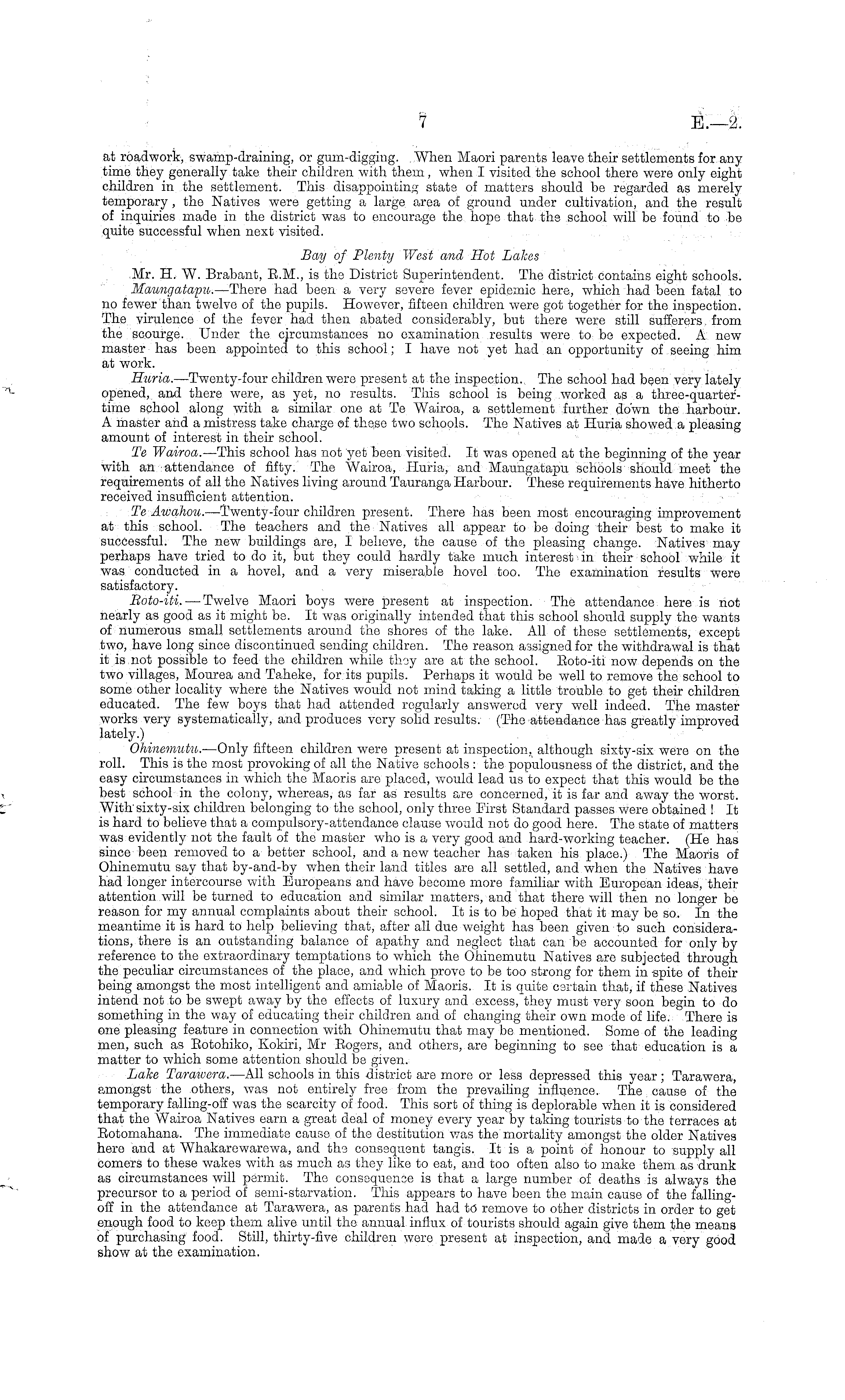 at roadwork, swamp-draining, or gum-digging. When Maori parents leave their settlements for any time they generally take their children with them, when I visited the school there were only eight children in the settlement. This disappointing state of matters should be regarded as merely temporary , the Natives were getting a large area of ground under cultivation, and the result of inquiries made in the district was to encourage the hope that the school will be found to be quite successful when next visited. Bay of Plenty West and Hot Lakes Mr. H. W. Brabant, E.M., is the District Superintendent. The district contains eight schools. Maungatapu. —There had been a very severe fever epidemic here, which had been fatal to no fewer than twelve of the pupils. However, fifteen children were got together for the inspection. The virulence of the fever had then abated considerably, but there were still sufferers from the scourge. Under the circumstances no examination results were to bo expected. A new master has been appointed to this school; I have not yet had an opportunity of seeing him at work. Huria. —Twenty-four children were present at the inspection. The school had been very lately opened, and there were, as yet, no results. This school is being worked as a three-quarter-time school along with a similar one at Te Wairoa, a settlement further down the harbour. A master and a mistress take charge of the.se two schools. The Natives at Huria showed a pleasing amount of interest in their school. Te Wairoa. —This school has not yet been visited. It was opened at the beginning of the year with an attendance of fifty. The Wairoa, Huria, and Maungatapu schools should meet the requirements of all the Natives living around Tauranga Harbour. These requirements have hitherto received insufficient attention. Te Awcthou. —Twenty-four children present. There has been most encouraging improvement at this school. The teachers and the Natives all appear to bo doing their best to make it successful. The new buildings are, I believe, the cause of the pleasing change. Natives may perhaps have tried to do it, but they could hardly take much interest in their school while it was conducted in a hovel, and a very miserable hovel too. The examination results were satisfactory. 8010-iii. — Twelve Maori boys were present at inspection. The attendance here is not nearly as good as it might be. It was originally intended that this school should supply the wants of numerous small settlements around the shores of the lake. All of these settlements, except two, have long since discontinued sending children. The reason assigned for the withdrawal is that it is not possible to feed the children while they are at the school. Eoto-iti now depends on the two villages, Mourea and Taheke, for its pupils. Perhaps it would be well to remove the school to some other locality where the Natives would not mind taking a little trouble to get their children educated. The few boys that had attended regularly answered very well indeed. The master works very systematically, and produces very solid results. (The attendance has greatly improved lately.) Ohinemutu. —Only fifteen children were present at although sixty-six were on the roll. This is the most provoking of all the Native schools : the populousness of the district, and the easy circumstances in which the Maoris are placed, would lead us to expect that this would be the best school in the colony, whereas, as far as' results are concerned, it is far and away the worst. With' sixty-six children belonging to the school, only three First Standard passes were obtained ! It is hard to believe that a compulsory-attendance clause would not do good here. The state of matters was evidently not the fault of the master wdio is a very good and hard-working teacher. (He has since been removed to a better school, and a new teacher has taken his place.) The Maoris of Ohinemutu say that by-and-by when their land titles are all settled, and when the Natives have had longer intercourse with Europeans and have become more familiar with European ideas, their attention will be turned to education and similar matters, and that there will then no longer be reason for my annual complaints about their school. It is to be hoped that it may be so. In the meantime it is hard to help believing that, after all due weight has been given to such considerations, there is an outstanding balance of apathy and neglect that can be accounted for only by reference to the extraordinary temptations to which the Ohinemutu Natives are subjected through the peculiar circumstances of the place, and which prove to be too strong for them in spite of their being amongst the most intelligent and amiable of Maoris. It is quite certain that, if these Natives intend not to be swept away by the effects of luxury and excess, they must very soon begin to do something in the way of educating their children and of changing their own mode of life. There is one pleasing feature in connection with Ohinemutu that may be mentioned. Some of the leading men, such as Eotohiko, Kokiri, Mr Eogers, and others, are beginning to see that education is a matter to which some attention should be given. Lake Taraivera. —All schools in this district are more or less depressed this year; Tarawera, amongst the others, was not entirely free from the prevailing influence. The cause of the temporary falling-off was the scarcity of food. This sort of thing is deplorable when it is considered that the Wairoa Natives earn a great deal of money every year by taking tourists to the terraces at Eotomahana. The immediate cause of the destitution was the'mortality amongst the older Natives here and at Whakarew 7 arewa, and the consequent tangis. It is a point of honour to supply all comers to these wakes with as much as they like to eat, and too often also to make them as drunk as circumstances will permit. The consequence is that a large number of deaths