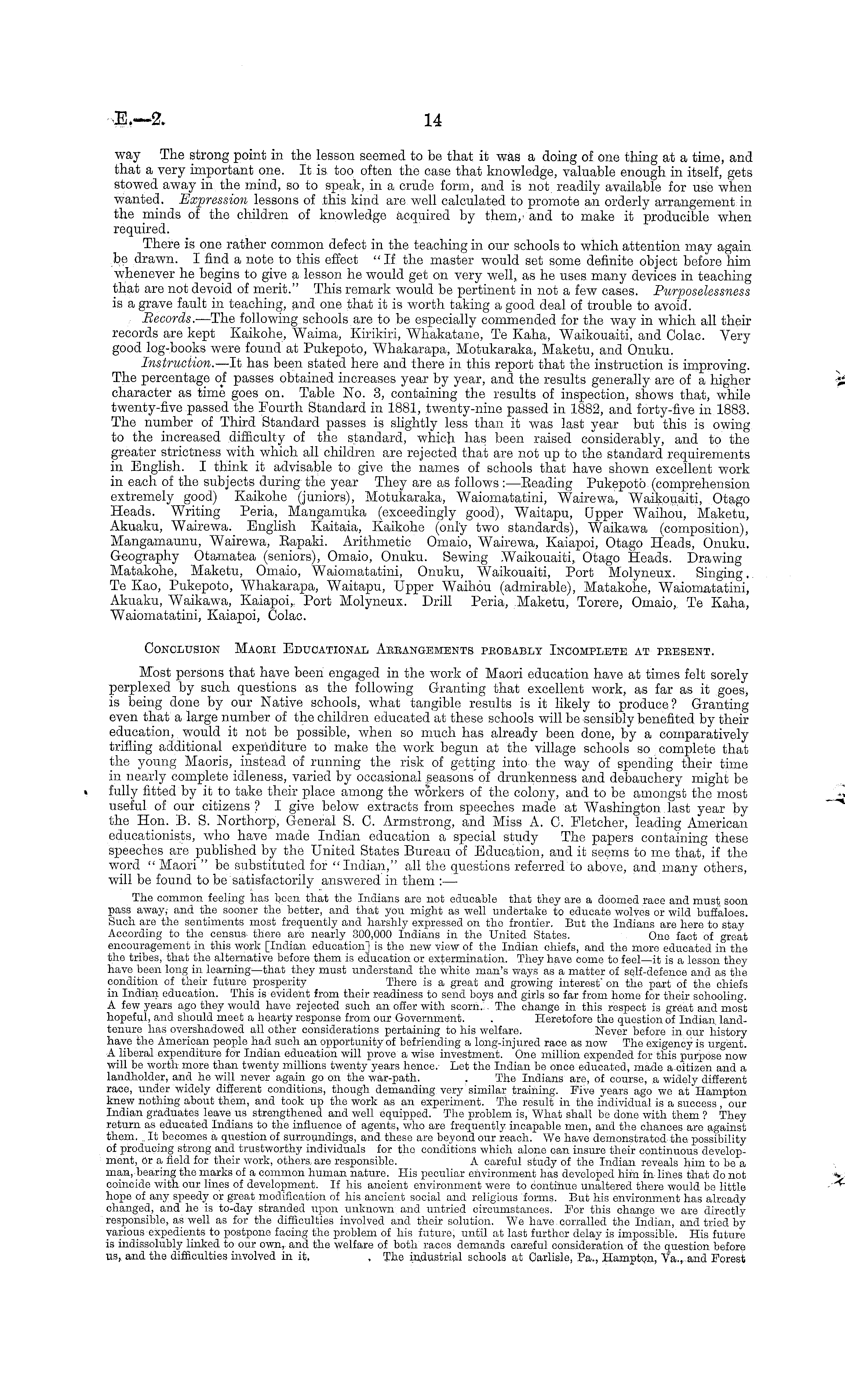 way The strong point in the lesson seemed to be that it was a doing of one thing at a time, and that a very important one. It is too often the case that knowledge, valuable enough in itself, gets stowed away in the mind, so to speak, in a crude form, and is not readily available for use when wanted. Expression lessons of this kind are well calculated to promote an orderly arrangement in the minds of the children of knowledge acquired by them,- and to make it producible when required. There is one rather common defect in the teaching in our schools to which attention may again be drawn. I find a note to this effect "If the master would set some definite object before him whenever he begins to give a lesson he would get on very well, as he uses many devices in teaching that are not devoid of merit." This remark would be pertinent in not a few cases. Purposelessness is a grave fault in teaching, and one that it is worth taking a good deal of trouble to avoid. Becords. —The following schools are to be especially commended for the way in which all their records are kept Kaikohe, Waima, Kirikiri, Whakatane, Te Kaha, Waikouaiti, and Colac. Very good log-books were found at Pukepoto, Whakarapa, Motukaraka, Maketu, and Onuku. Instruction. —lt has been stated here and there in this report that the instruction is improving. The percentage of passes obtained increases year by year, and the results generally are of a higher character as time goes on. Table No. 3, containing the results of inspection, shows that, while twenty-five passed the Fourth Standard in 1881, twenty-nine passed in 1882, and forty-five in 1883. The number of Third Standard passes is slightly less than it was last year but this is owing to the increased difficulty of the standard, which has been raised considerably, and to the greater strictness with which all children are rejected that are not up to the standard requirements in English. I think it advisable to give the names of schools that have shown excellent work in each of the subjects during the year They are as follows : —Beading Pukepoto (comprehension extremely good) Kaikohe (juniors), Motukaraka, Waiomatatini, Wairewa, Waikouaiti, Otago Heads. Writing Peria, Mangamuka (exceedingly good), Waitapu, Upper Waihou, Maketu, Akuaku, Wairewa. English Kaitaia, Kaikohe (only two standards), Waikawa (composition), Mangamaunu, Wairewa, Eapaki. Arithmetic Omaio, Wairewa, Kaiapoi, Otago Heads, Onuku. Geography Otamatea (seniors), Omaio, Onuku. Sewing Waikouaiti, Otago Heads. Drawing Matakohe, Maketu, Ornaio, Waiomatatini, Onuku, Waikouaiti, Port Molyneux. Singing. Te Kao, Pukepoto, Whakarapa, Waitapu, Upper Waihou (admirable), Matakohe, Waiomatatini, Akuaku, Waikawa, Kaiapoi, Port Molyneux. Drill Peria, Maketu, Torere, Omaio, Te Kaha, Waiomatatini, Kaiapoi, Colac. Conclusion Maori Educational Arrangements probably Incomplete at present. Most persons that have been engaged in the work of Maori education have at times felt sorely perplexed by such questions as the following Granting that excellent work, as far as it goes, is being done by our Native schools, what tangible results is it likely to produce? Granting even that a large number of the children educated at these schools will be sensibly benefited by their education, would it not be possible, when so much has already been done, by a comparatively trifling additional expenditure to make the. work begun at the village schools so complete that the young Maoris, instead of running the risk of getting into the way of spending their time in nearly complete idleness, varied by occasional seasons of drunkenness and debauchery might be fully fitted by it to take their place among the workers of the colony, and to be amongst the most useful of our citizens? I give below extracts from speeches made at Washington last year by the Hon. B. S. Northorp, General S. C. Armstrong, and Miss A. C. Fletcher, leading American educationists, who have made Indian education a special study The papers containing these speeches are published by the United States Bureau of Education, and it seems to me that, if the word "Maori " be substituted for "Indian," all the questions referred to above, and many others, will be found to be satisfactorily answered in them :— The common feeling has boon that the Indians arc not educable that they are a doomed race and must soon pass away, and the sooner the better, and that you might as well undertake to educate wolves or wild buffaloes. Such are the sentiments most frequently and harshly expressed on tho frontier. But the Indians are here to stay According to tho census there are nearly 300,000 Indians in the United States. One fact of great encouragement in this work [Indian education] is the new view of the Indian chiefs, and the more educated in the the tribes, that the alternative before them is education or extermination. They have come to feel —it is a lesson they have been long in learning—that they must understand the white man's ways as a matter of self-defence and as the condition of their future prosperity There is a great and growing interest' on the part of the chiefs in Indian education. This is evident from their readiness to send boys and girls so far from home for their schooling. A few years ago they would have rejected such an offer with scorn. The change in. this respect is great and most hopeful, and should meet a hearty response from our Government. . Heretofore the question of Indian, landtenure has overshadowed all other considerations pertaining to his welfare. Never before in our history have the American people had such an opportunity of befriending a long-injured race as now The exigency is urgent. A liberal expenditure for Indian education will prove a wise investment. One million expended for this purpose now will be worth more than twenty millions twenty years hence.' Lot the Indian be once educated, made a citizen and a landholder, and he will never again go on the war-pat
