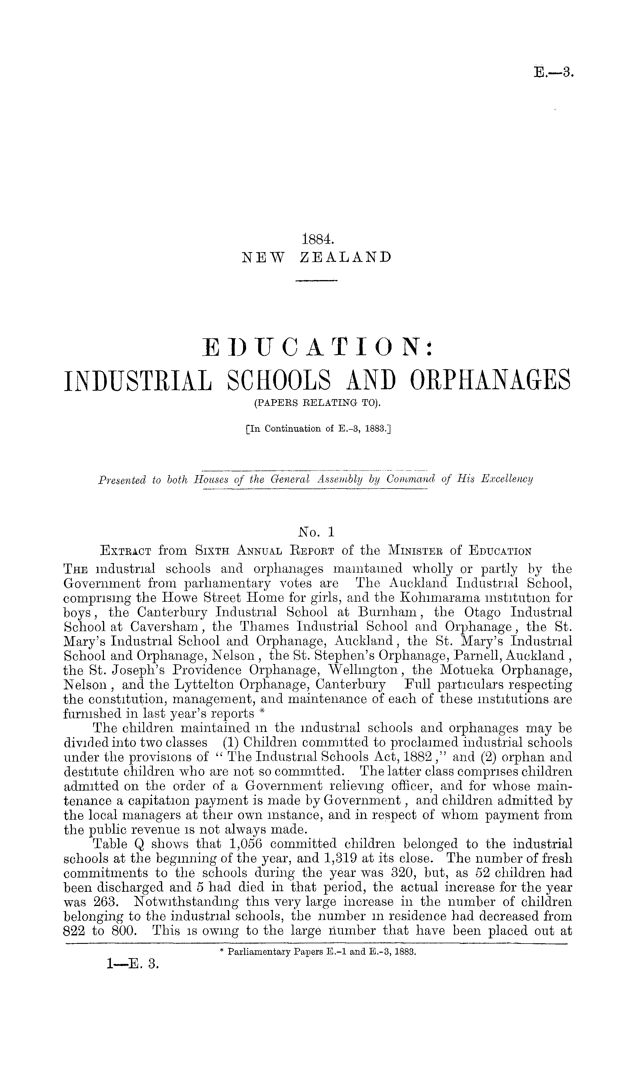 EDUCATION: INDUSTRIAL SCHOOLS AND ORPHANAGES (PAPERS RELATING TO). [In Continuation of E.-3, 1883.]