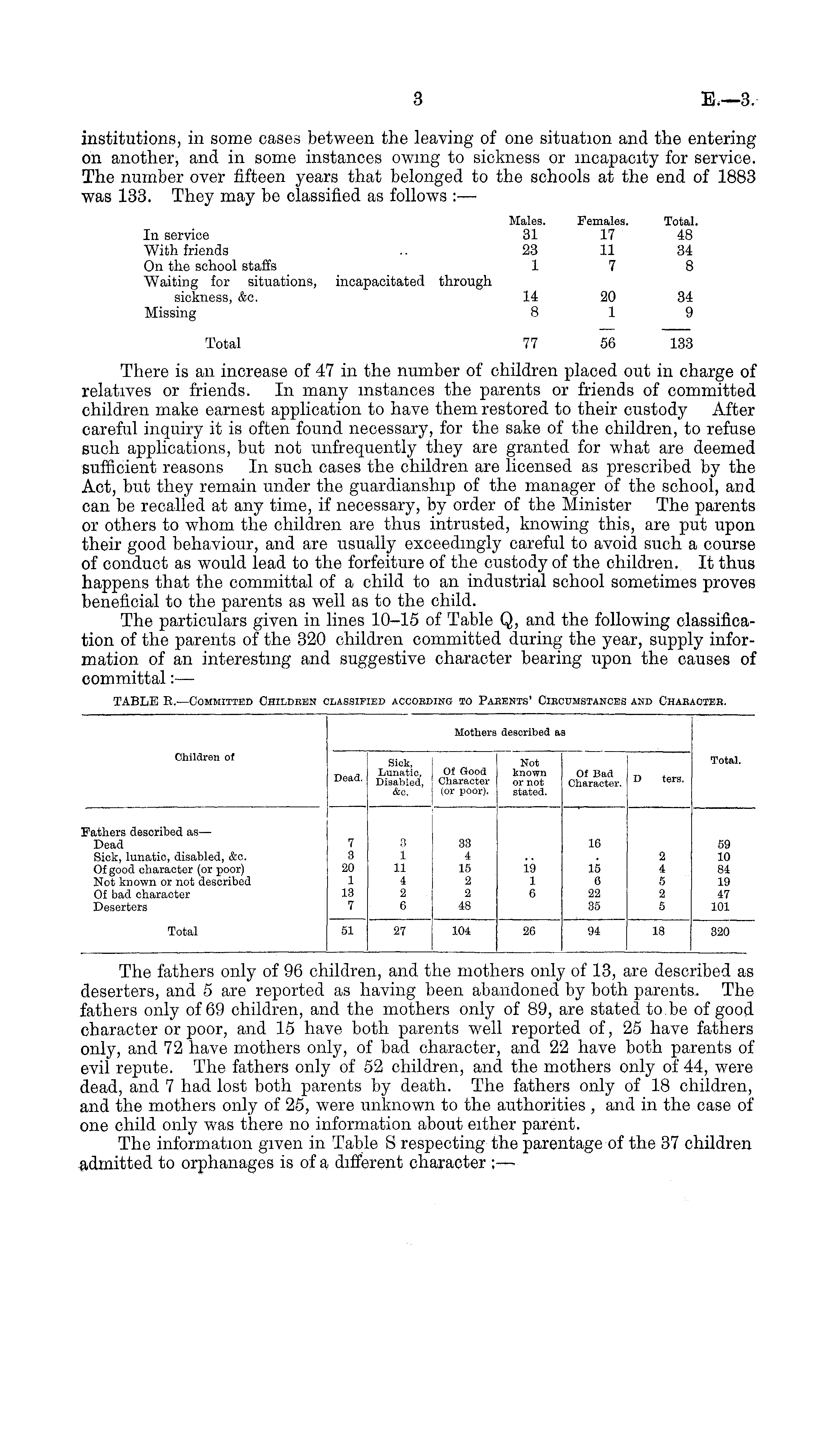 institutions, in some cases between the leaving of one situation and the entering on another, and in some instances owing to sickness or incapacity for service. The number over fifteen years that belonged to the schools at the end of 1883 was 133. They may be classified as follows : — Males. Females. Total. In service 31 17 48 With friends .. 23 11 34 On the school staffs 17 8 Waiting for situations, incapacitated through sickness, &c. 14 20 34 Missing 8 19 Total 77 56 133 There is an increase of 47 in the number of children placed out in charge of relatives or friends. In many instances the parents or friends of committed children make earnest application to have them restored to their custody After careful inquiry it is often found necessary, for the sake of the children, to refuse such applications, but not unfrequently they are granted for what are deemed sufficient reasons In such cases the children are licensed as prescribed by the Act, but they remain under the guardianship of the manager of the school, and can be recalled at any time, if necessary, by order of the Minister The parents or others to whom the children are thus intrusted, knowing this, are put upon their good behaviour, and are usually exceedingly careful to avoid such a course of conduct as would lead to the forfeiture of the custody of the children. It thus happens that the committal of a child to an industrial school sometimes proves beneficial to the parents as well as to the child. The particulars given in lines 10-15 of Table Q, and the following classification of the parents of the 320 children committed during the year, supply information of an interesting and suggestive character bearing upon the causes of committal: —