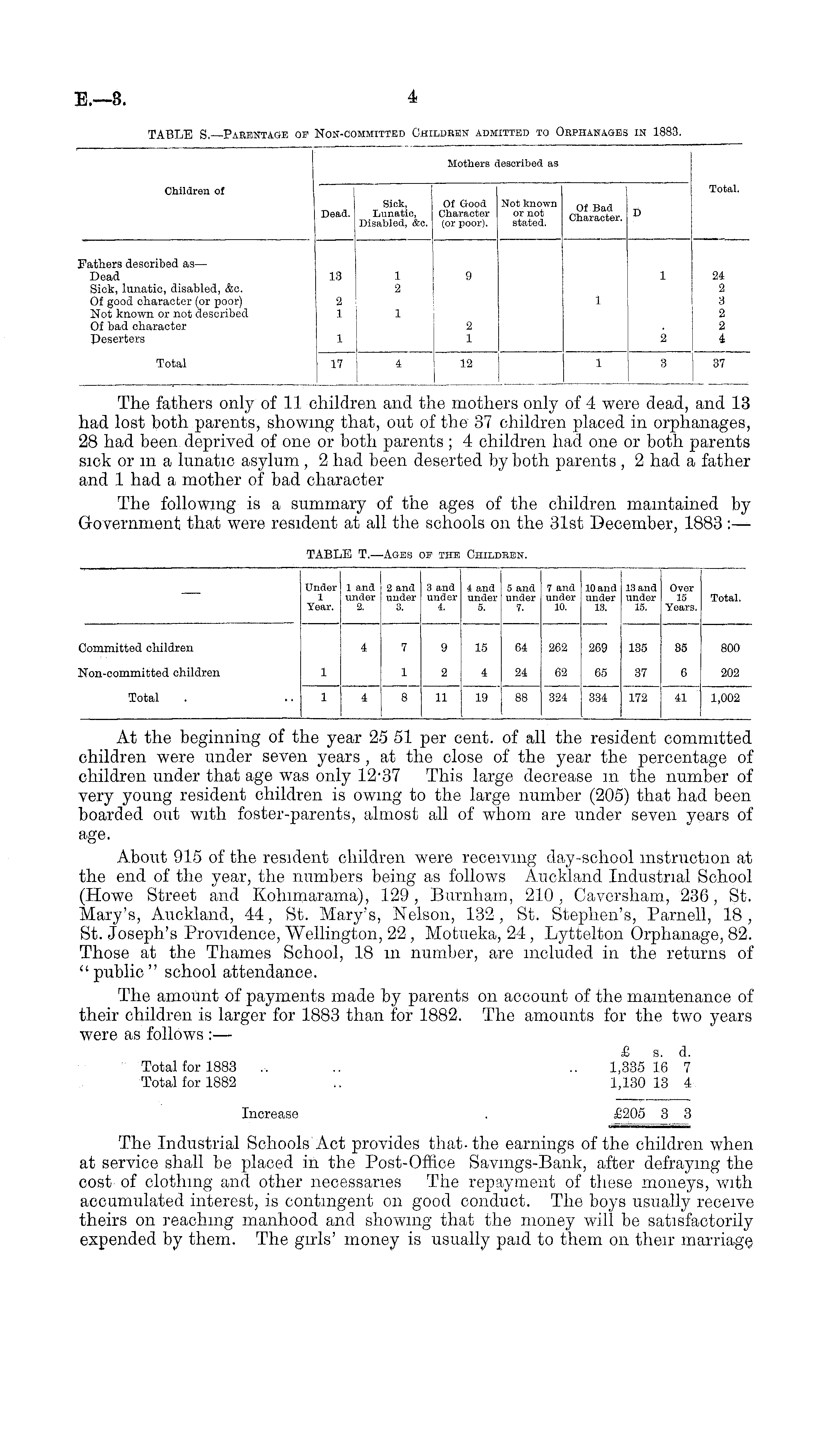 At the beginning of the year 25 51 per cent, of all the resident committed children were under seven years , at the close of the year the percentage of children under that age was only 12-37 This large decrease m the number of very young resident children is owing to the large number (205) that had been boarded out with foster-parents, almost all of whom are under seven years of age. About 915 of the resident children were receiving day-school instruction at the end of the year, the numbers being as follows Auckland Industrial School (Howe Street and Kolnmarama), 129, Burnham, 210, Cavcrsham, 236, St. Mary's, Auckland, 44, St. Mary's, Nelson, 132, St. Stephen's, Parnell, 18, St. Joseph's Providence, Wellington, 22 , Motueka, 24 , Lyttelton Orphanage, 82. Those at the Thames School, 18 m number, are included in the returns of " public " school attendance. The amount of payments made by parents on account of the maintenance of their children is larger for 1883 than for 1882. The amounts for the two years were as follows :— £ s. d. Total for 1883 ... ... .. 1,335 16 7 Total for 1882 .. 1,130 13 4 Increase . £205 3 3 The Industrial Schools Act provides that- the earnings of the children when at service shall be placed in the Post-Office Savmgs-Bank, after defraying the cost of clothing and other necessaries The repayment of these moneys, with accumulated interest, is contingent on good conduct. The boys usually receive theirs on reaching manhood and showing that the money will be satisfactorily expended by them. The girls' money is usually paid to them on their marriage