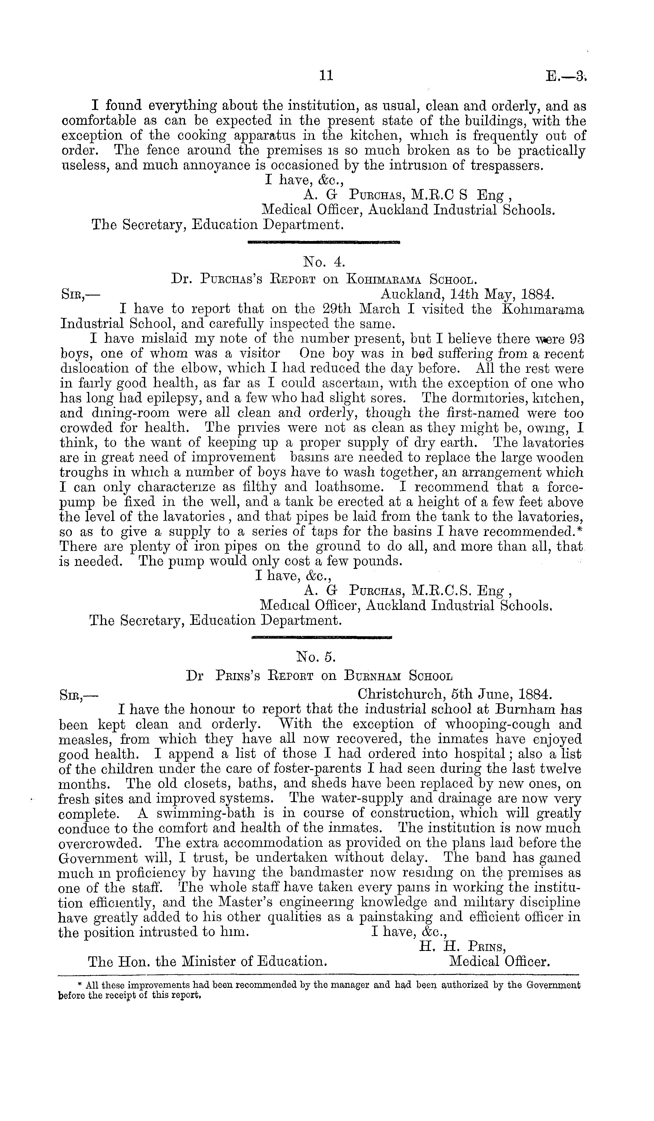 No. 5. Dr Prins's Beport on Burnham School Sir, — Christchurch, sth June, 1884. I have the honour to report that the industrial school at Burnham has been kept clean and orderly. With the exception of whooping-cough and measles, from which they have all now recovered, the inmates have enjoyed good health. I append a list of those I had ordered into hospital; also a list of the children under the care of foster-parents I had seen during the last twelve months. The old closets, baths, and sheds have been replaced by new ones, on fresh sites and improved systems. The water-supply and drainage are now very complete. A swimming-bath is in course of construction, which will greatly conduce to the comfort and health of the inmates. The institution is now much overcrowded. The extra accommodation as provided on the plans laid before the Government will, I trust, be undertaken without delay. The band has gained much m proficiency by having the bandmaster now residing on the premises as one of the staff. The whole staff have taken every pams in working the institution efficiently, and the Master's engineering knowledge and military discipline have greatly added to his other qualities as a painstaking and efficient officer in the position intrusted to him. I have, &c, H. H. Prins, The Hon. the Minister of Education. Medical Officer.