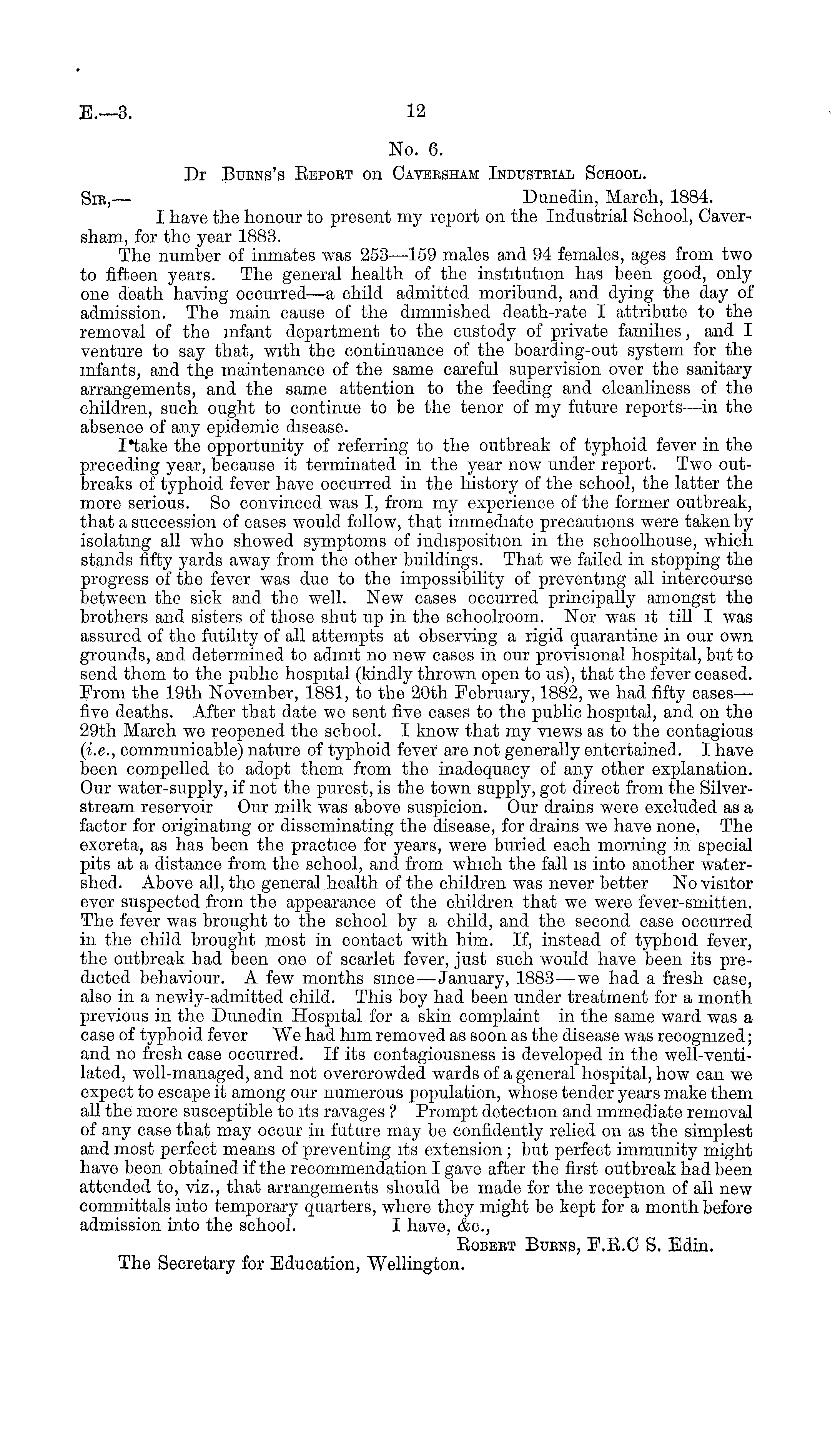 No. 6. Dr Burns's Beport on Caversham Industrial School. Sir, — Dunedin, March, 1884. I have the honour to present my report on the Industrial School, Caversham, for the year 1883. The number of inmates was 253 —159 males and 94 females, ages from two to fifteen years. The general health of the institution has been good, only one death having occurred—a child admitted moribund, and dying the day of admission. The main cause of the diminished death-rate I attribute to the removal of the infant department to the custody of private families, and I venture to say that, with the continuance of the boarding-out system for the infants, and the maintenance of the same careful supervision over the sanitary arrangements, and the same attention to the feeding and cleanliness of the children, such ought to continue to be the tenor of my future reports —in the absence of any epidemic disease. I take the opportunity of referring to the outbreak of typhoid fever in the preceding year, because it terminated in the year now under report. Two outbreaks of typhoid fever have occurred in the history of the school, the latter the more serious. So convinced was I, from my experience of the former outbreak, that a succession of cases would follow, that immediate precautions were taken by isolating all who showed symptoms of indisposition in the schoolhouse, which stands fifty yards away from the other buildings. That we failed in stopping the progress of the fever was due to the impossibility of preventing all intercourse between the sick and the well. New cases occurred principally amongst the brothers and sisters of those shut up in the schoolroom. Nor was it till I was assured of the futility of all attempts at observing a rigid quarantine in our own grounds, and determined to admit no new cases in our provisional hospital, but to send them to the public hospital (kindly thrown open to us), that the fever ceased. From the 19th November, 1881, to the 20th February, 1882, we had fifty cases— five deaths. After that date we sent five cases to the public hospital, and on the 29th March we reopened the school. I know that my views as to the contagious (i.e., communicable) nature of typhoid fever are not generally entertained. I have been compelled to adopt them from the inadequacy of any other explanation. Our water-supply, if not the purest, is the town supply, got direct from the Silverstream reservoir Our milk was above suspicion. Our drains were excluded as a factor for originating or disseminating the disease, for drains we have none. The excreta, as has been the practice for years, were buried each morning in special pits at a distance from the school, and from which the fall is into another watershed. Above all, the general health of the children was never better No visitor ever suspected from the appearance of the children that we were fever-smitten. The fever was brought to the school by a child, and the second case occurred in the child brought most in contact with him. If, instead of typhoid fever, the outbreak had been one of scarlet fever, just such would have been its predicted behaviour. A few months sinee —January, 1883—we had a fresh case, also in a newly-admitted child. This boy had been under treatment for a month previous in the Dunedin Hospital for a skin complaint in the same ward was a case of typhoid fever We had him removed as soon as the disease was recognized; and no fresh case occurred. If its contagiousness is developed in the well-venti-lated, well-managed, and not overcrowded wards of a general hospital, how can we expect to escape it among our numerous population, whose tender years make them all the more susceptible to its ravages ? Prompt detection and immediate removal of any case that may occur in future may be confidently relied on as the simplest and most perfect means of preventing its extension ; but perfect immunity might have been obtained if the recommendation I gave after the first outbreak had been attended to, viz., that arrangements should be made for the reception of all new committals into temporary quarters, where they might be kept for a month before admission into the school. I have, &c, Bobert Burns, F.B.C S. Edin. The Secretary for Education, Wellington.