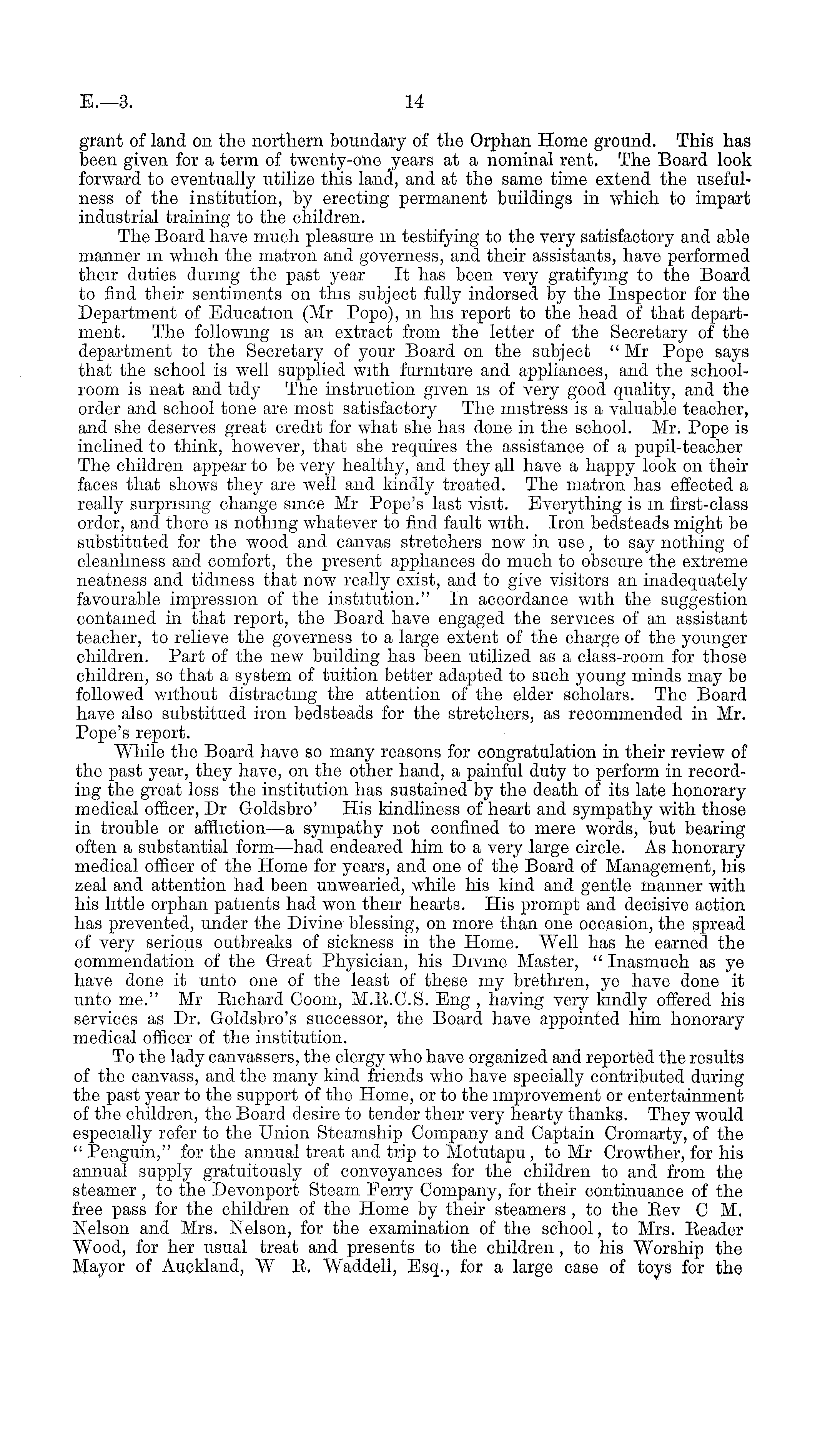 grant of land on the northern boundary of the Orphan Home ground. This has been given for a term of twenty-one years at a nominal rent. The Board look forward to eventually utilize this land, and at the same time extend the usefulness of the institution, by erecting permanent buildings in which to impart industrial training to the children. The Board have much pleasure m testifying to the very satisfactory and able manner m which the matron and governess, and their assistants, have performed their duties during the past year It has been very gratifying to the Board to find their sentiments on this subject fully indorsed by the Inspector for the Department of Education (Mr Pope), in his report to the head of that department. The following is an extract from the letter of the Secretary of the department to the Secretary of your Board on the subject "Mr Pope says that the school is well supplied with furniture and appliances, and the schoolroom is neat and tidy The instruction given is of very good quality, and the order and school tone are most satisfactory The mistress is a valuable teacher, and she deserves great credit for what she has done in the school. Mr. Pope is inclined to think, however, that she requires the assistance of a pupil-teacher The children appear to be very healthy, and they all have a happy look on their faces that shows they are well and kindly treated. The matron has effected a really surprising change since Mr Pope's last visit. Everything is m first-class order, and there is nothing whatever to find fault with. Iron bedsteads might be substituted for the wood and canvas stretchers now in use, to say nothing of cleanliness and comfort, the present appliances do much to obscure the extreme neatness and tidiness that now really exist, and to give visitors an inadequately favourable impression of the institution." In accordance with the suggestion contained in that report, the Board have engaged the services of an assistant teacher, to relieve the governess to a large extent of the charge of the younger children. Part of the new building has been utilized as a class-room for those children, so that a system of tuition better adapted to such young minds may be followed without distracting the attention of the elder scholars. The Board have also substitued iron bedsteads for the stretchers, as recommended in Mr. Pope's report. While the Board have so many reasons for congratulation in their review of the past year, they have, on the other hand, a painful duty to perform in recording the great loss the institution has sustained by the death of its late honorary medical officer, Dr Goldsbro' His kindliness of heart and sympathy with those in trouble or affliction—a sympathy not confined to mere words, but bearing often a substantial form —had endeared him to a very large circle. As honorary medical officer of the Home for years, and one of the Board of Management, his zeal and attention had been unwearied, while his kind and gentle manner with his little orphan patients had won their hearts. His prompt and decisive action has prevented, under the Divine blessing, on more than one occasion, the spread of very serious outbreaks of sickness in the Home. Well has he earned the commendation of the Great Physician, his Divine Master, " Inasmuch as ye have done it unto one of the least of these my brethren, ye have done it unto me." Mr Bichard Coom, M.B.C.S. Eng , having very kindly offered his services as Dr. Goldsbro's successor, the Board have appointed him honorary medical officer of the institution. To the lady canvassers, the clergy who have organized and reported the results of the canvass, and the many kind friends who have specially contributed during the past year to the support of the Home, or to the improvement or entertainment of the children, the Board desire to tender their very hearty thanks. They would especially refer to the Union Steamship Company and Captain Cromarty, of the " Penguin," for the annual treat and trip to Motutapu , to Mr Crowther, for his annual supply gratuitously of conveyances for the children to and from the steamer, to the Devonport Steam Ferry Company, for their continuance of the free pass for the children of the Home by their steamers, to the Bey C M. Nelson and Mrs. Nelson, for the examination of the school, to Mrs. Beader Wood, for her usual treat and presents to the children, to his Worship the Mayor of Auckland, W B. Waddell, Esq., for a large case of toys for the