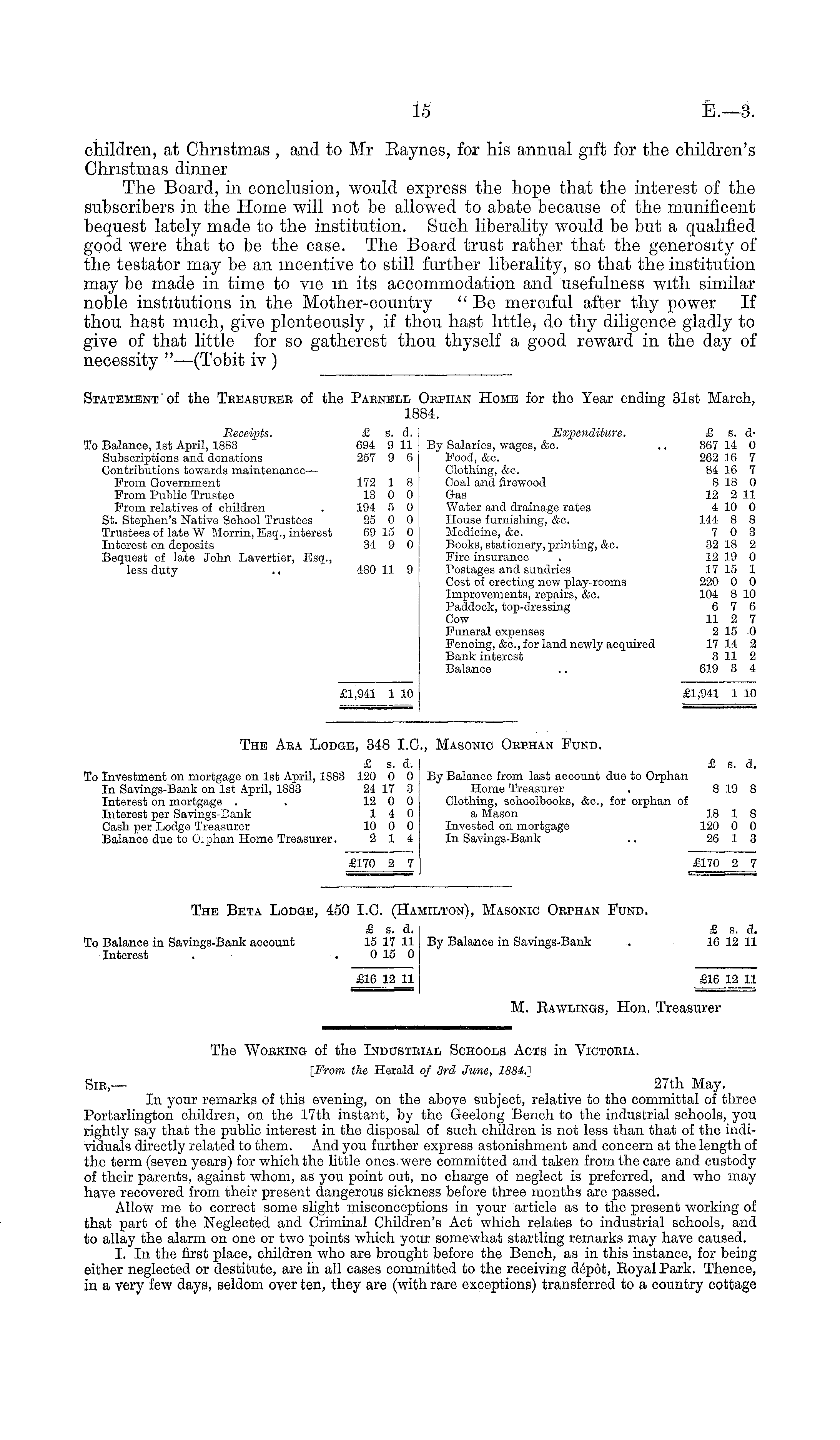Statement 'of the Teeasueer of the Parnell Oephan Home for the Year ending 31st March, 1884. Receipts. £ s. d. Expenditure. £ s. dTo Balance, Ist April, 1883 694 911 By Salaries, wages, &o. .. 367 14 0 Subscriptions and donations 257 9 6 Food, &c. 262 16 7 Contributions towards maintenance— Clothing, &c. 84 16 7 From Government 172 1 8 Coal and firewood 8 18 0 From Public Trustee 13 0 0 Gas 12 2 11 From relatives of children . 194 5 0 Water and drainage rates 4 10 0 St. Stephen's Native School Trustees 25 0 0 House furnishing, &c. 144 8 8 Trustees of late W Morrin, Esq., interest 69 15 0 Medicine, &c. 7 0 3 Interest on deposits 34 9 0 Books, stationery, printing, &c. 32 18 2 Bequest of late John Lavertier, Esq., Fire insurance . 12 19 0 less duty .. 480 11 9 Postages and sundries 17 15 1 Cost of erecting new play-rooms 220 0 0 Improvements, repairs, &o. 104 8 10 Paddock, top-dressing 6 7 6 Cow 11 2 7 Funeral expenses 2 15 0 Fencing, &c, for land newly acquired 17 14 2 Bank interest 3 11 2 Balance .. 619 3 4 £1,941 1 10 £1,941 1 10