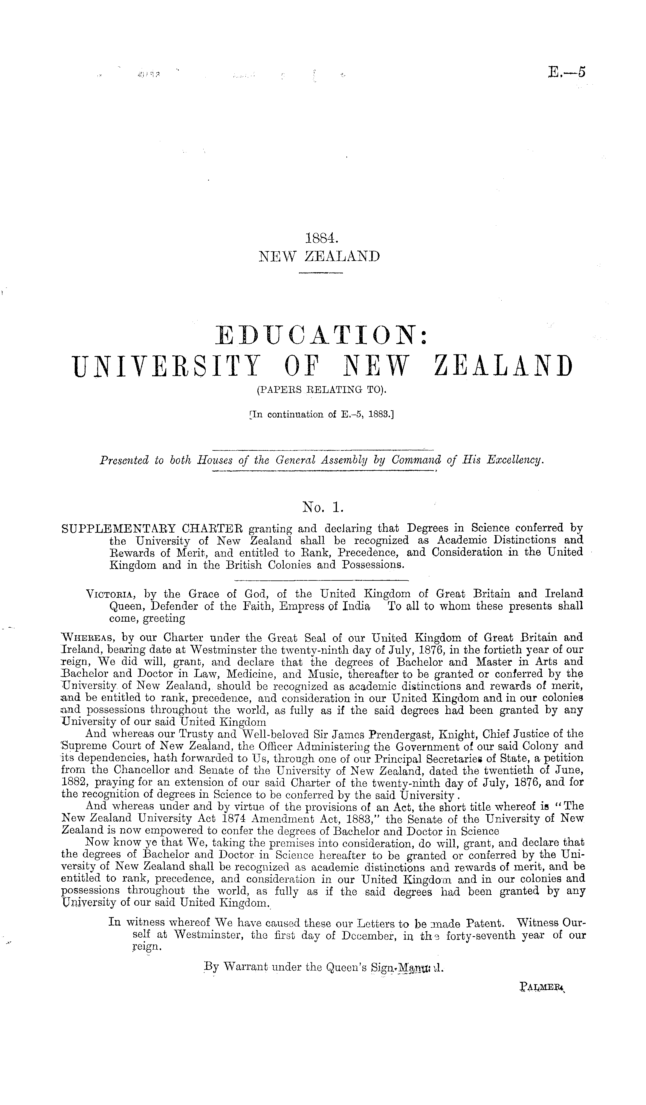 EDUCATION: UNIVERSITY OF NEW ZEALAND (PAPERS RELATING TO). [In continuation of E.-5, 1883.]