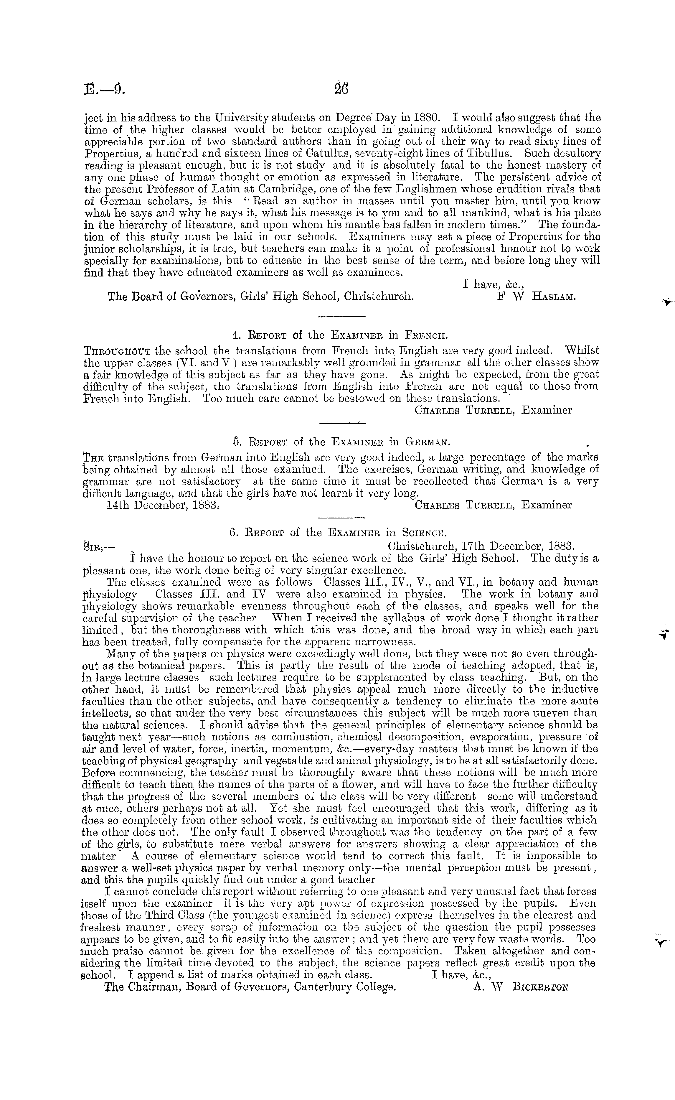 6. Bepobt of the Examinee in Science. Sib,— Christchurch, 17th December, 1883. I have the honour to report on the science work of the Girls' High School. The duty is a pleasant one, the work done being of very singular excellence. The classes examined were as follows Classes 111., IV., V., and VI., in botany and human physiology Classes 111. and IV were also examined in physics. The work in botany and physiology shows remarkable evenness throughout each of the classes, and speaks well for the careful supervision of the teacher When I received the syllabus of work done I thought it rather limited, but the thoroughness with which this was done, and the broad way in which each part has been treated, fully compensate for the apparent narrowness. Many of the papers on physics were exceedingly well done, but they were not so even throughout as the botanical papers. This is partly the result of the mode of teaching adopted, that is, in large lecture classes such lectures require to be supplemented by class teaching. But, on the other hand, it must be remembered that physics appeal much more directly to the inductive faculties than the other subjects, and have consequently a tendency to eliminate the more acute intellects, so that under the Very best circumstances this subject will be much more uneven than the natural sciences. I should advise that the general principles of elementary science should be taught next year—such notions as combustion, chemical decomposition, evaporation, pressure of air and level of water, force, inertia, momentum, &c.—every*day matters that must be known if the teaching of physical geography and vegetable and animal physiology, is to be at all satisfactorily done. Before commencing, the teacher must be thoroughly aware that these notions will be much more difficult to teach than the names of the parts of a flower, and will have to face the further difficulty that the progress of the several members of the class will be very different some will understand at once, others perhaps not at all. Yet she must feel encouraged that this work, differing as it does so completely from other school work, is cultivating an important side of their faculties which the other does not. The only fault I observed throughout was the tendency on the part of a few of the girls, to substitute mere verbal answers for answers showing a clear appreciation of the matter A course of elementary science would tend to correct this fault. It is impossible to answer a well-set physics paper by verbal memory only—the mental perception must be present, and this the pupils quickly find out under a good teacher I cannot conclude this report without referring to one pleasant and very unusual fact that forces itself upon the examiner it is the very apt power of expression possessed by the pupils. Even those of the Third Glass (the youngest examined in science) express themselves in the clearest and freshest manner , every scrap of information on the subject of the question the pupil possesses appears to be given, and to fit easily into the answer ; and yet there are very few waste words. Too much praise cannot be given for the excellence of tho composition. Taken altogether and considering the limited time devoted to the subject, the science papers reflect great credit upon the school. I append a list of marks obtained in each class. I have, &c, The Chairman, Board of Governors, Canterbury College. A. W Bickebtos;
