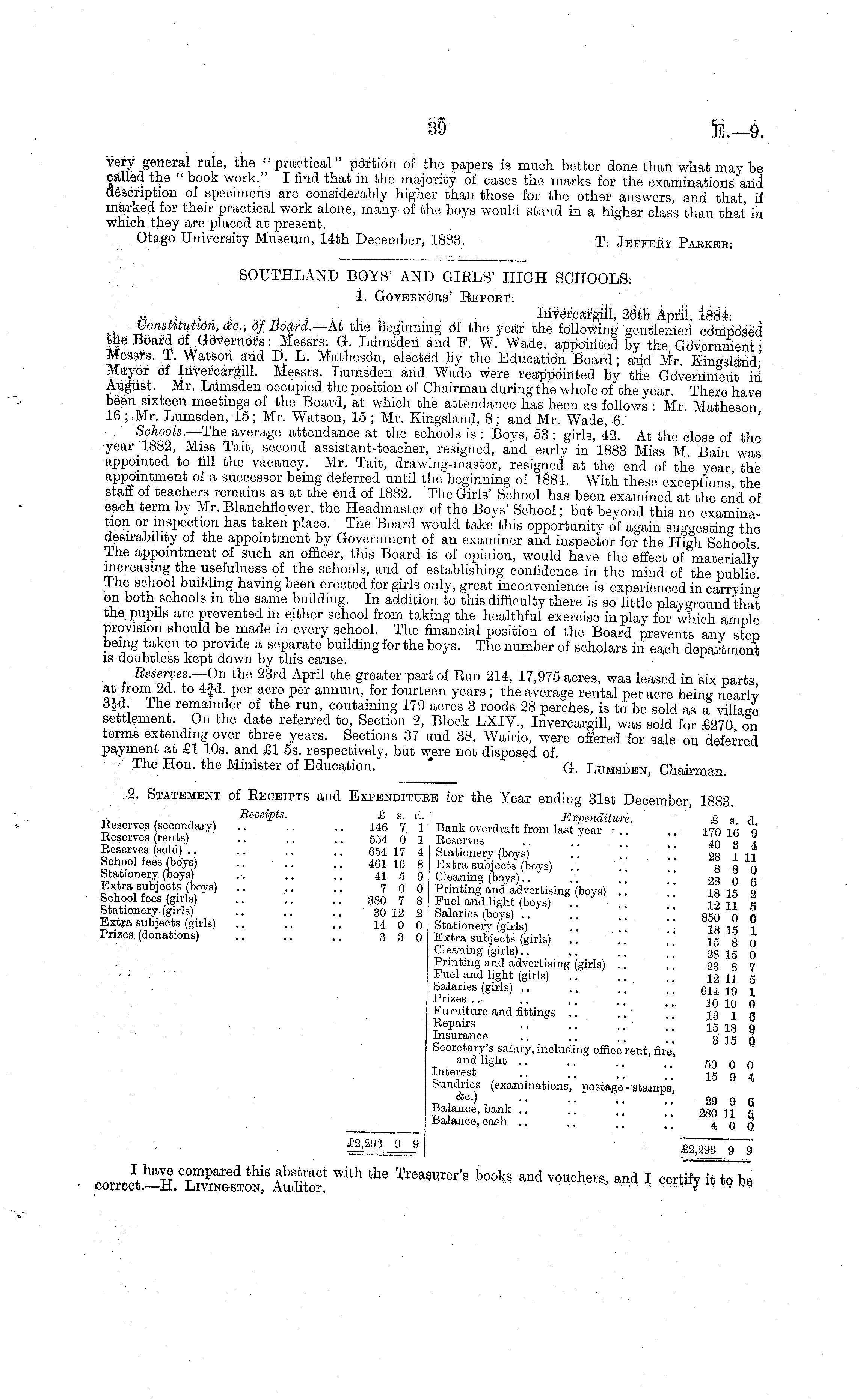 SOUTHLAND BOYS' AND GIELS' HIGH SCHOOLS; 1. Governors' Eeport: f> i > i .a j, ' i. , Irivercafgiil, 26th April, 1884: XJonsMutidn-t&c, Of Board.— At tile beginning of the year the fdllowing gentlemen cdmpdsed the Board of Governors: Messrs, G. Lmnsden and F. W. Wade, appointed by the Gdvermnent - Messrs. T. Watson arid D. L. Mathesdn, elected by the Bducatidn Board; and Mr. Mayor of Invercargill. Messrs. Lumsden and Wade were reappdinted by the Government id August. Mr. Lumsden occupied the position of Chairman during the whole of the year. There have been sixteen meetings of the Board, at which the attendance has been as follows : Mr Matheson 16; Mr. Lumsden, 15; Mr. Watson, 15; Mr. Kingsland, 8; and Mr. Wade, 6. Schools. —The average attendance at the schools is : Boys, 53; girls, 42. At the close of the year 1882, Miss Tait, second assistant-teacher, resigned, and early in 1883 Miss M. Bain was appointed to fill the vacancy. Mr. Tait, drawing-master, resigned at the end of the year the appointment of a successor being deferred until the beginning of 1884. With these exceptions' the staff of teachers remains as at the end of 1882. The Girls' School has been examined at the end of each term by Mr. Blanchflqwer, the Headmaster of the Boys' School; but beyond this no examination or inspection has taken place. The Board would take this opportunity of again the desirability of the appointment by Government of an examiner and inspector for the High Schools The appointment of such an officer, this Board is of opinion, would have the effect of materially increasing the usefulness of the schools, and of establishing confidence in the mind of the public The school building having been erected for girls only, great inconvenience is experienced in carrying on both schools m the same building. In addition to this difficulty there is so little playground that the pupils are prevented in either school from taking the healthful exercise in play for which ample provision should be made in every school. The financial position of the Board prevents any step being taken to provide a separate building for the boys. The number of scholars in each department is doubtless kept down by this cause. Beserves.— On the 23rd April the greater part of Bun 214, 17,975 acres, was leased in six parts at from 2d. to 4fd. per acre per annum, for fourteen years; the average rental per acre being nearly 3|d The remainder of the run, containing 179 acres 3 roods 28 perches, is to be sold as a village settlement. On the date referred to, Section 2, Block LXIV., Invercargill, was sold for £270 on terms extending over three years. Sections 37 and 38, Wairio, were offered for sale on deferred payment at £1 10s. and £1 ss. respectively, but were not disposed of. The Hon. the Minister of Education. G. Lumsden, Chairman