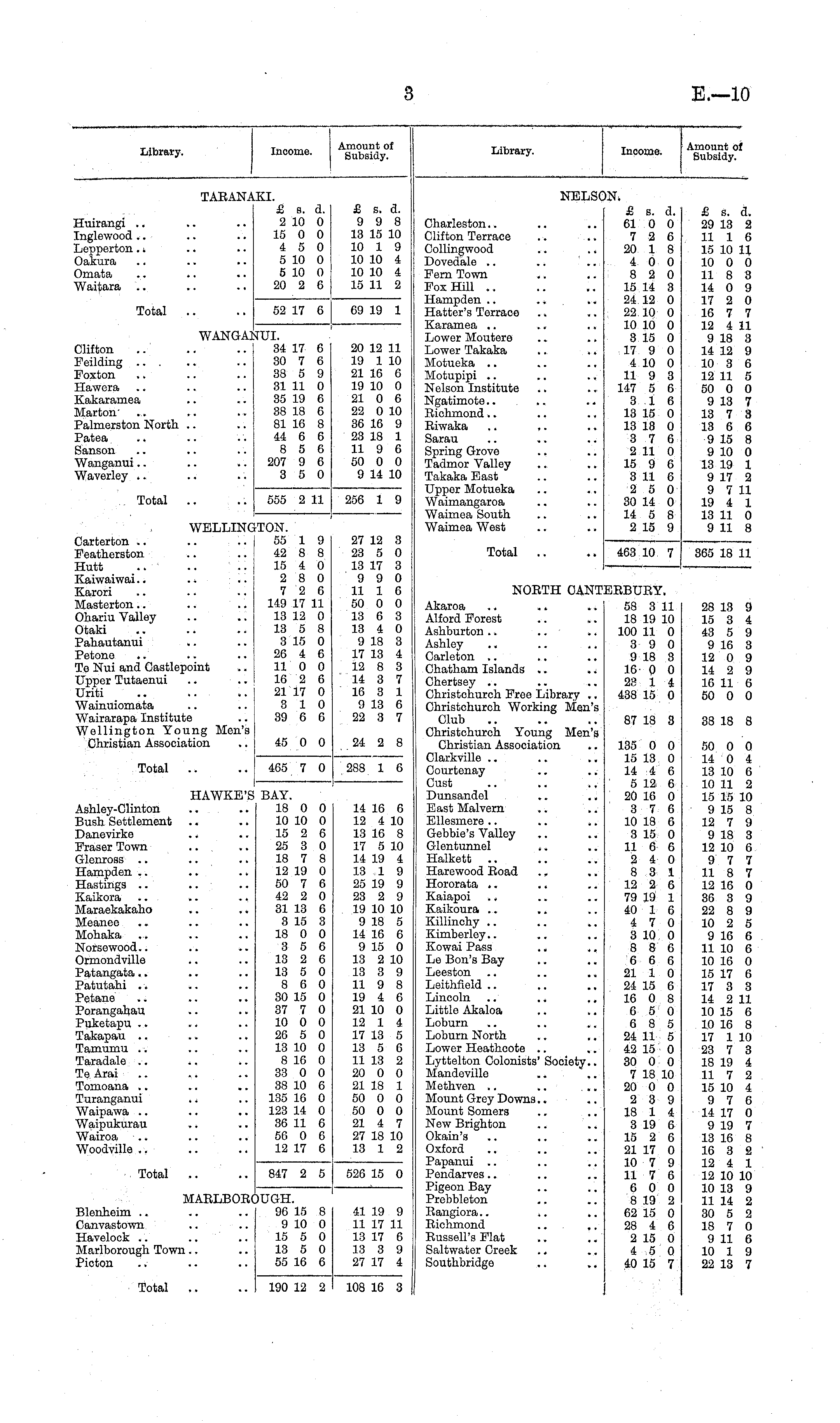 Library. Income. Amount of Subsidy. Library. Income. Amount of Subsidy. TABANAKI. find .EL £ s. d. 2 10 0 15 0 0 4 5 0 5 10 0 5 10 0 20 2 6 NELSC >N. ±> s. a. Huirangi .. .. .. 2 10 0 Inglewood.. .. .. 15 0 0 Lepperton.» .. .. 4 5 0 Oakura .. .. .. 5 10 0 Omata .. .. .. 5 10 0 Waitara .. .. .. 20 2 6 Total .. .. 52 17 6 WANGANUI. Clifton .. .. .. 34 17 6 Feilding .. 30 7 6 Foxton .. .. .. 38 5 9 Hawera .. .. .. 31 11 0 Kakaramea .. .. 35 19 6 Marton- .. .. ... 38 18 6 Palmerston North .. .. 81 16 8 Patea .. .. .'. 44 6 6 Sanson .. .. .. 8 5 6 Wanganui.. .. .. 207 9 6 Waverley .. .. .. 3 5 0 rui. 34 17 6 30 7 6 38 5 9 31 11 0 35 19 6 38 18 6 81 16 8 44 6 6 8 5 6 207 9 6 3 5 0 52 17 6 £ s. d. 9 9 8 13 15 10 10 1 9 10 10 4 10 10 4 15 11 2 69 19 1 20 12 11 19 1 10 21 16 6 19 10 0 21 0 6 22 0 10 36 16 9 23 18 1 11 9 6 50 0 0 9 14 10 Charleston.. Clifton Terrace .. Collingwood Dovedale .. .. Fern Town Fox Hill .. Hampden .. ... Hatter's Terrace Karamea Lower Moutere Lower Takaka Motueka Motupipi Nelson Institute Ngatimote Bichmond Biwaka Sarau Spring Grove Tadmor Valley Takaka East Upper Motueka Waimangaroa Waimea South Waimea West £ s. d. 61 0 0 7 2 6 20 1 8 4 0 0 8 2 0 15 14 3 24 12 0 22 10 0 10 10 0 3 15 0 17 9 0 4 10 0 11 9 3 147 5 6 3 16 13 15 0 13 13 0 3 7 6 2 11 0 15 9 6 3 11 6 2 5 0 30 14 0 14 5 8 2 15 9 £ s. d. 29 13 2 11 1 6 15 10 U 10 0 0 11 8 3 14 0 9 17 2 0 16 7 7 12 4 11 9 18 3 14 12 9 10 3 6 12 11 5 50 0 0 9 13 7 13 7 3 13 6 6 9 15 8 9 10 0 13 19 1 9 17 2 9 7 11 19 4 1 13 11 0 9 11 8 Total .. .. 555 2 11 555 2 11 256 1 9 WELLINGTON. rTON. 55 1 9 42 8 8 15 4 0 2 8 0 7 2 6 149 17 11 13 12 0 13 5 8 3 15 0 26 4 6 11 0 0 16 2 6 2117 0 3 10 39 6 6 Carterton .. .. .. I 55 1 9 Featherston .. .. \ 42 8 8 Hutt .. - .. .. | 15 4 0 Kaiwaiwai.. .. : .. 2 8 0 Karori .. .. .. 7 2 6 Masterton.. .. .. 149 17 11 Ohariu Valley .. .. 13 12 0 Otaki .. .. .. 13 5 8 Pahautanui .. .. 3 15 0 Petone .. .. .. 26 4 6 Te Nui and Castlepoint .. 110 0 Upper Tutaenui .. .. 16 2 6 Uriti .. .. .. 21 17 0 Wainuiomata .. .. 3 10 Wairarapa Institute .. 39 6 6 Wellington Young Men's Christian Association .. 45 0 0 27 12 3 23 5 0 13 17 3 9 9 0 11 1 6 50 0 0 13 6 3 13 4 0 9 18 3 17 13 4 12 8 3 14 3 7 16 3 1 9 13 6 22 3 7 Total NORTH CANT! Akaroa Alford Forest Ashburton .. Ashley Carleton Chatham Islands .. ., Chertsey Christchurch Free Library .. Christchurch Working Men's Club Christchurch Young Men's Christian Association Clarkville Courtenay Oust Dunsandel East Malvern Ellesmere Gebbie's Valley Glentuirnel ,. Halkett .. Harewood Boad . , Hororata Kaiapoi ., Kaikoura Killinchy .. .. .. Kimberley.. Kowai Pass .. ,. Le Bon's Bay Leeston Leithfield Lincoln .. .. ., Little Akaloa Loburn Loburn North Lower Heathcote Lyttelton Colonists' Society.. Mandeville .. ,. Methven Mount Grey Downs Mount Somers New Brighton Okain's Oxford Bapanui Pendarves Pigeon Bay Prebbleton Bangiora.. ,. .. Bichmond .. ,. Russell's Flat Saltwater Creek Southbridge 'EEBUBY. 58 3 11 18 19 10 100 11 0 3 9 0 9 18 3 16 0 0 23 1 4 438 15 0 463 10 7 28 13 9 15 3 4 43 5 9 9 16 3 12 0 9 14 2 9 16 11 6 50 0 0 365 18 11 87 18 8 38 18 8 45 0 0 24 2 8 135 0 0 15 13 0 14 4 6 5 12 6 20 16 0 3 7 6 10 18 6 3 15 0 11 6 6 2 4 0 8 3 1 12 2 6 79 19 1 40 1 6 4 7 0 3 10 0 8 8 6 6 6 6 21 1 0 24 15 6 16 0 8 6 5 0 6 8 5 24 11 5 42 15 0 30 0 0 7 18 10 20 0 0 2 3 9 18 1 4 3 19 6 15 2 6 21 17 0 10 7 9 11 7 6 6 0 0 8 19 2 62 15 0 28 4 6 2 15 0 4 5 0 40 15 7 50 0 0 14 0 4 13 10 6 10 11 2 15 15 10 9 15 8 12 7 9 9 18 3 12 10 6 9 7 7 11 8 7 12 16 0 36 3 9 22 8 9 10 2 5 9 16 6 11 10 6 10 16 0 15 17 6 17 3 3 14 2 11 10 15 6 10 16 8 17 1 10 23 7 3 18 19 4 11 7 2 15 10 4 9 7 6 14 17 0 9 19 7 13 16 8 16 3 2 12 4 1 12 10 10 10 13 9 11 14 2 30 5 2 18 7 0 9 11 6 10 1 9 22 13 7 Total .. .. 465 7 0 465 7 0 288 1 6 HAWKE'S BAY. BAY. 18 0 0 10 10 0 15 2 6 25 3 0 18 7 8 12 19 0 50 7 6 42 2 0 31 13 6 3 15 3 18 0 0 3 5 6 13 2 6 13 5 0 8 6 0 30 15 0 37 7 0 10 0 0 26 5 0 13 10 0 8 16 0 33 0 0 38 10 6 135 16 0 123 14 0 36 11 6 56 0 6 12 17 6 Ashley-Clinton .. .. 18 0 0 Bush Settlement .. .. 10 10 0 Danevirke .. .. 15 2 6 Fraser Town ... .. 25 3 0 Glenross .. .. .. 18 7 8 Hampden .. .. .. 12 19 0 Hastings .. .. .. 50 7 6 Kaikora .. .. .. 42 2 0 Maraekakaho .. .. 31 13 6 Meanee .. .. .. 3 15 3 Mohaka ... .. .. 18 0 0 Norsewood.. .. .. 3 5 6 Ormondville .. .. 13 2 6 Patangata.. .. .. 13 5 0 Patutahi .. .. .. 8 6 0 Petane .. .. .. 30 15 0 Porangahau .. .. 37 7 0 Puketapu .. ., .. 10 0 0 Takapau .. .. .. 26 5 0 Tamumu .. .. .. 13 10 0 Taradale .. .. .. 8 16 0 Te Arai .. .. .. 33 0 0 Tomoana .. .. .. 38 10 6 Turanganui .. .. 135 16 0 Waipawa .. .. .. 123 14 0 Waipukurau .. .. 36 11 6 Wairoa .. .. .. 56 0 6 Woodville 12 17 6 14 16 6 12 4 10 13 16 8 17 5 10 14 19 4 13 1 9 25 19 9 23 2 9 19 10 10 9 18 5 14 16 6 9 15 0 13 2 10 13 3 9 11 9 8 19 4 6 21 10 0 12 1 4 17 13 5 13 5 6 11 13 2 20 0 0 21 18 1 50 0 0 50 0 0 21 4 7 27 18 10 13 1 2 Total .. .. 847 2 5 847 2 5 526 15 0 MABLBOEOUGH. Blenheim .. .. .. 96 15 8 Canvastown .. .. 9 10 0 Havelock .. .. .. 15 5 0 Marlborough Town.. .. 13 5 0 Picton .. .. .. 55 16 6 Total .. .. 190 12 2 41 19 9 11 17 11 13 17 6 13 3 9 27 17 4 108 16 3